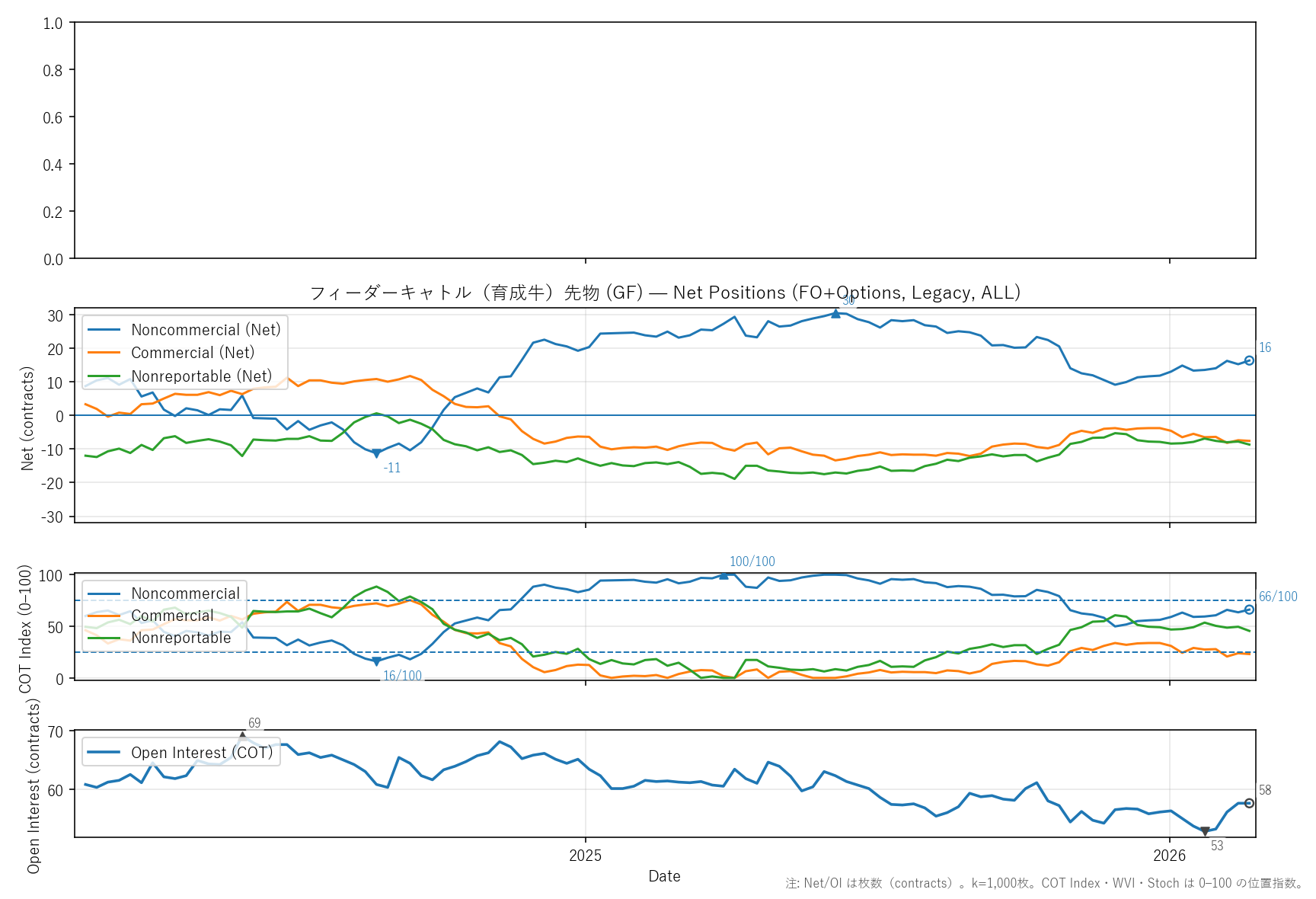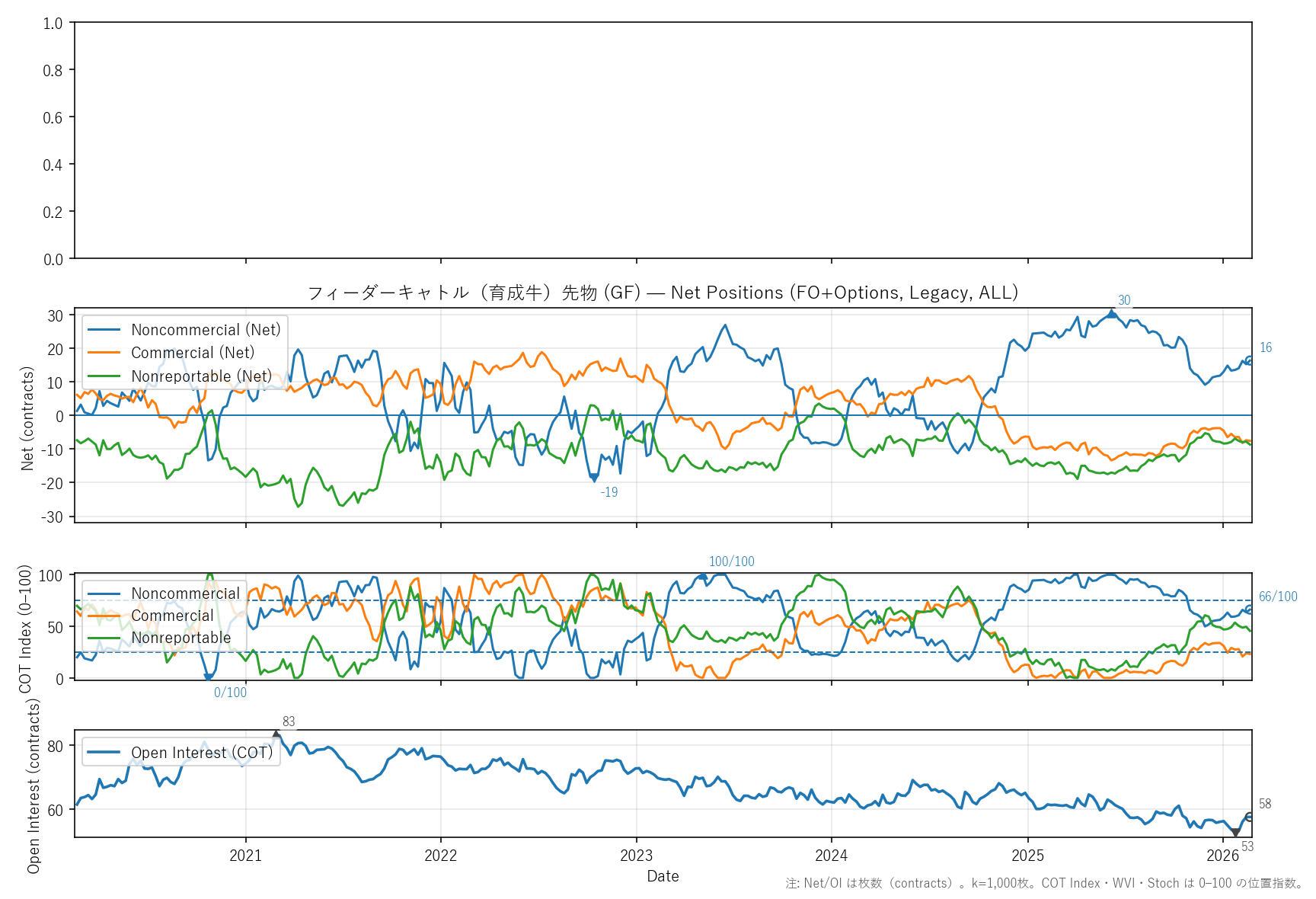 フィーダーキャトル(育成牛)先物(GF)COTレポート・バリュエーション・テクニカル【週足】