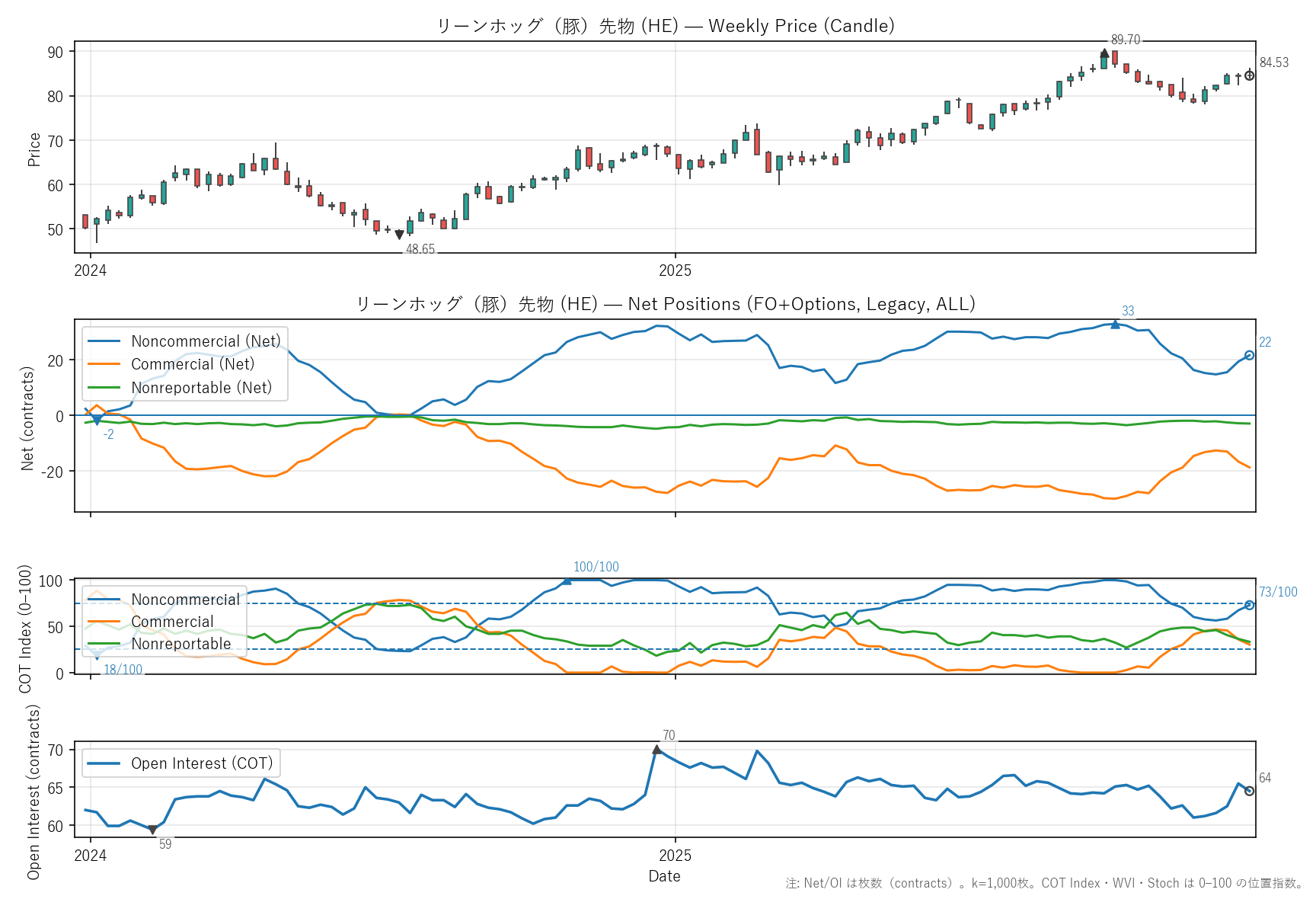 先週比(2025-12-26):非商業COT指数:+2pt(19 → 22) / 商業COT指数:-2pt(-17 → -19) / NR COT指数:-0pt(-3 → -3) / Open Interest:-1.53%(66 → 64)
