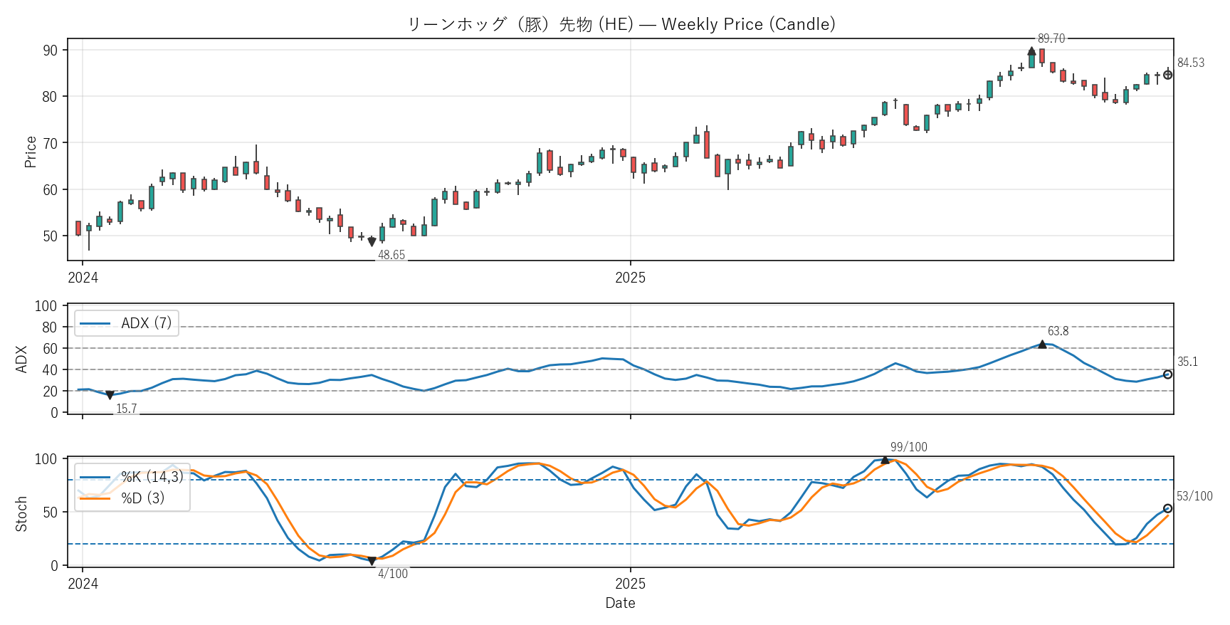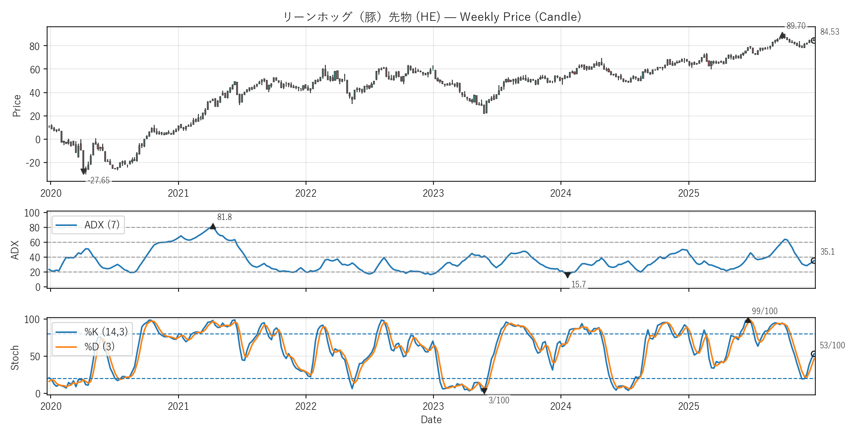 先週比(2025-12-26):週次リターン:-0.50%(終値 84.53 → 84.10) / ADX:+2.3pt(35 → 37)