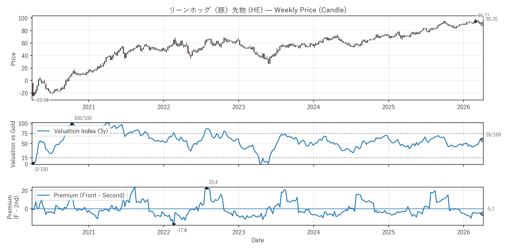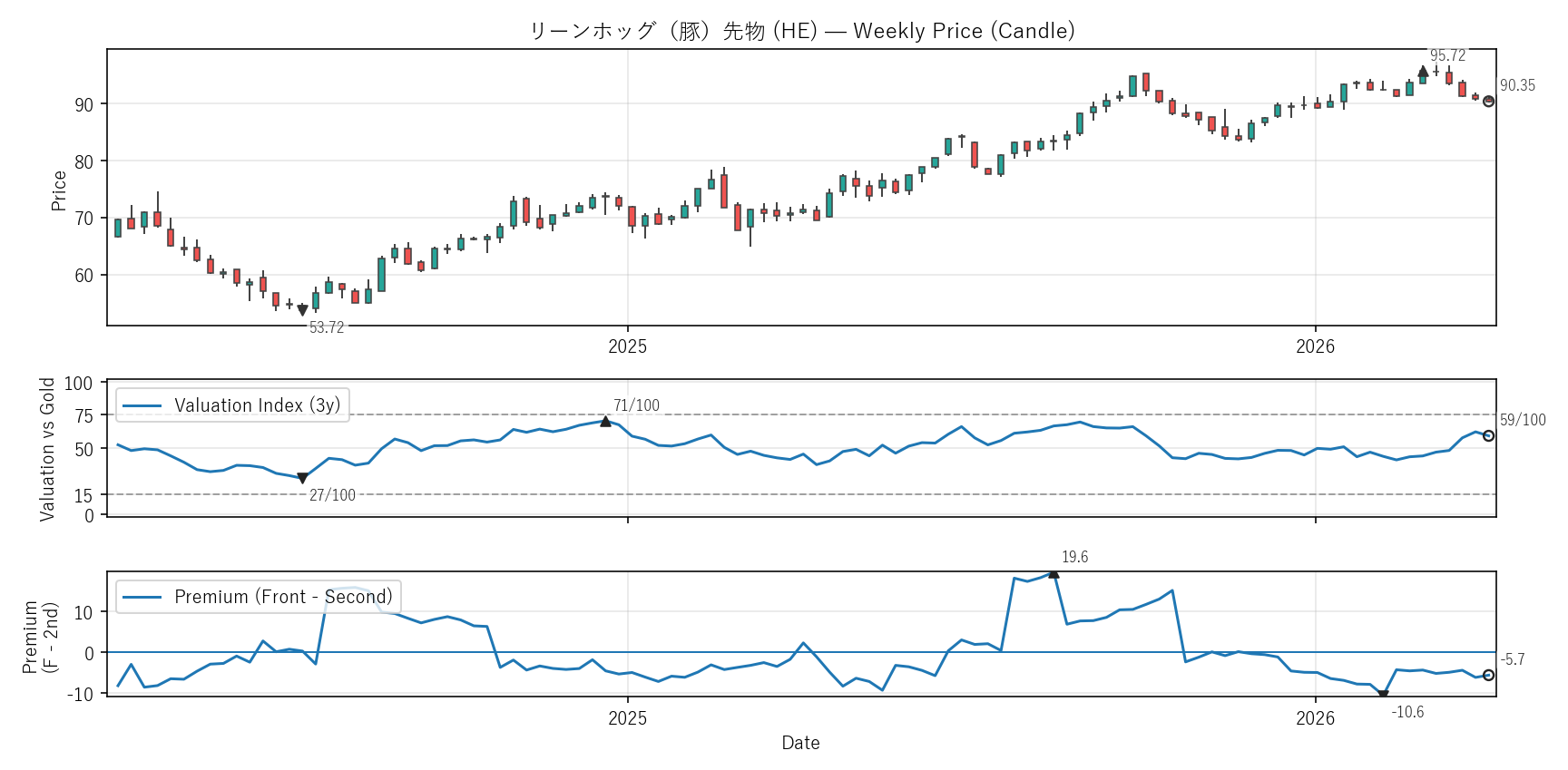 Valuation(WVI)は「基準資産と比べて相対的に高い/安いか」をみる指標。通常は金(GC)、金自身は米30年債(ZB)と比較。価格比(対象/参照×100)を短期/長期EMAで平滑化→差(PAL)の過去位置を0〜100で表示。PremiumはFront−Second(順鞘/逆鞘)。