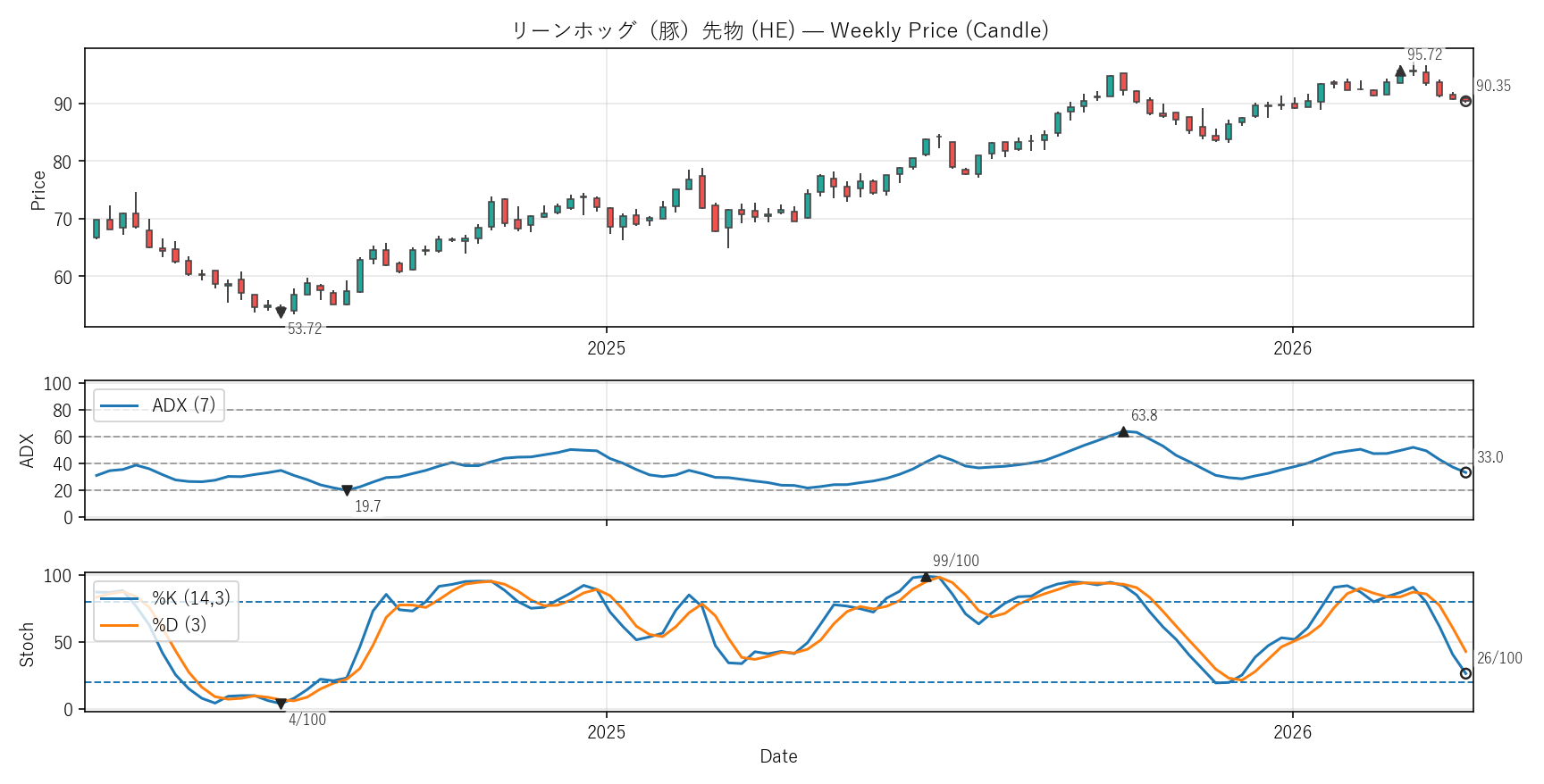 ADX:33.0(19.7〜63.8)|位置 30/100 / Stoch %K:26(4〜99)|位置 24/100