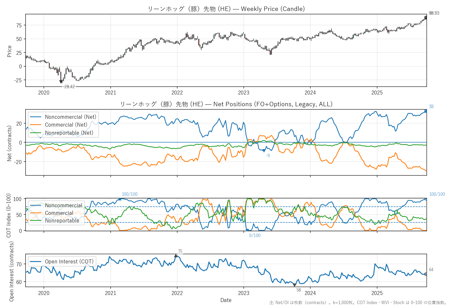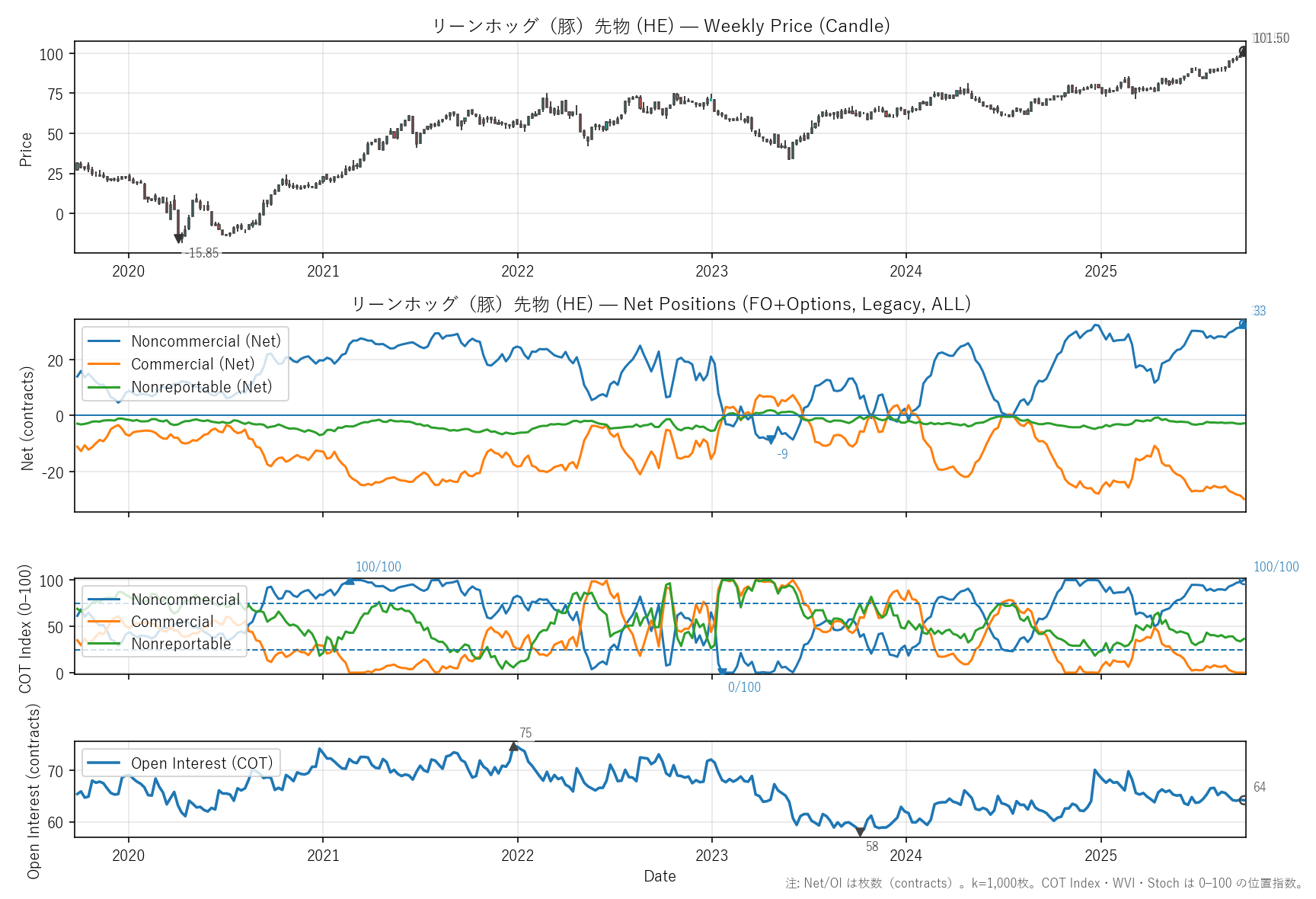 先週比(2025-09-26):非商業COT指数:+1pt(32 → 33) / 商業COT指数:-1pt(-29 → -30) / NR COT指数:+0pt(-3 → -3) / Open Interest:-0.16%(64 → 64)