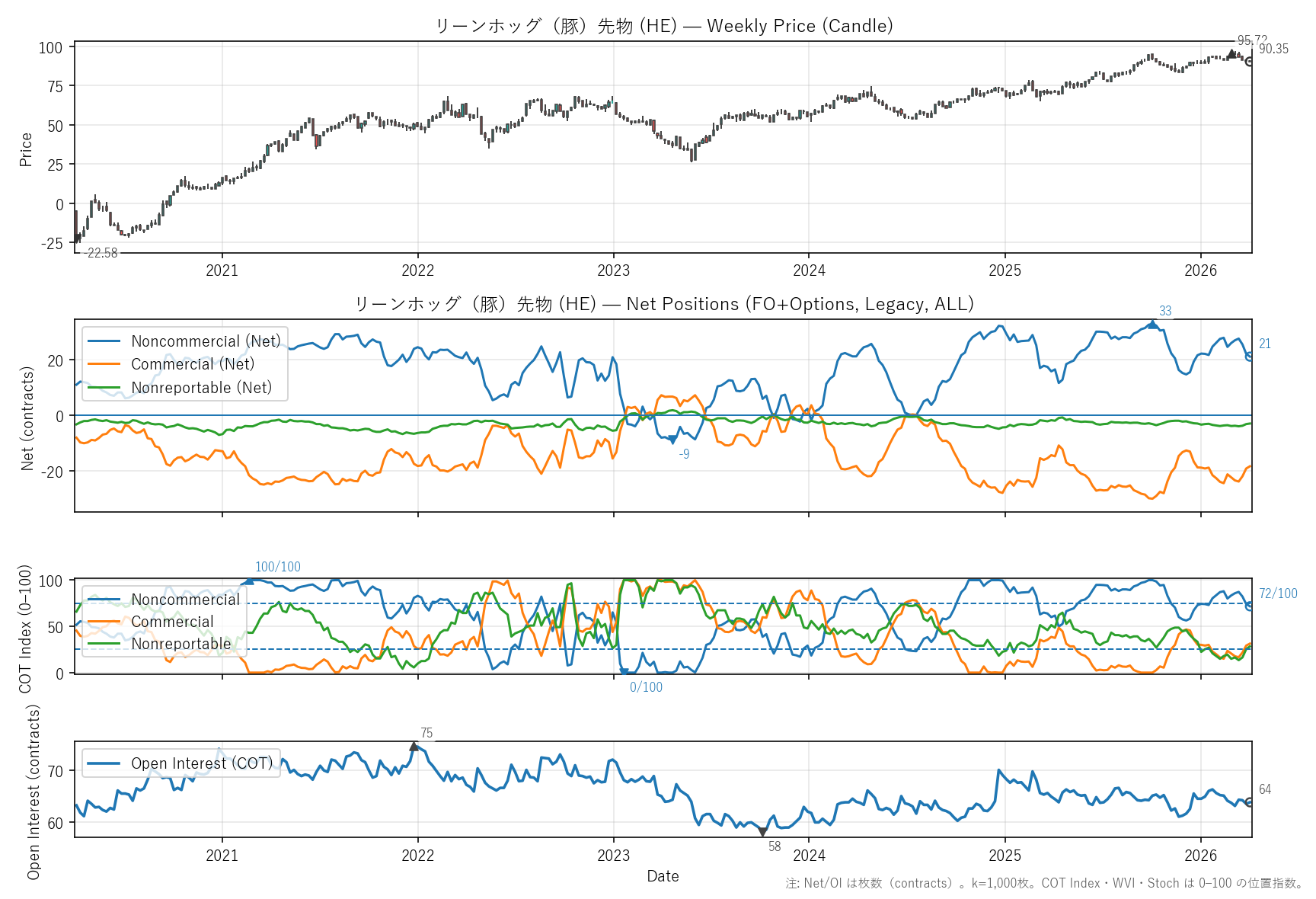 先週比(2026-04-03):非商業COT指数:-1pt(22 → 21) / 商業COT指数:+1pt(-19 → -18) / NR COT指数:+0pt(-3 → -3) / Open Interest:+0.47%(64 → 64)