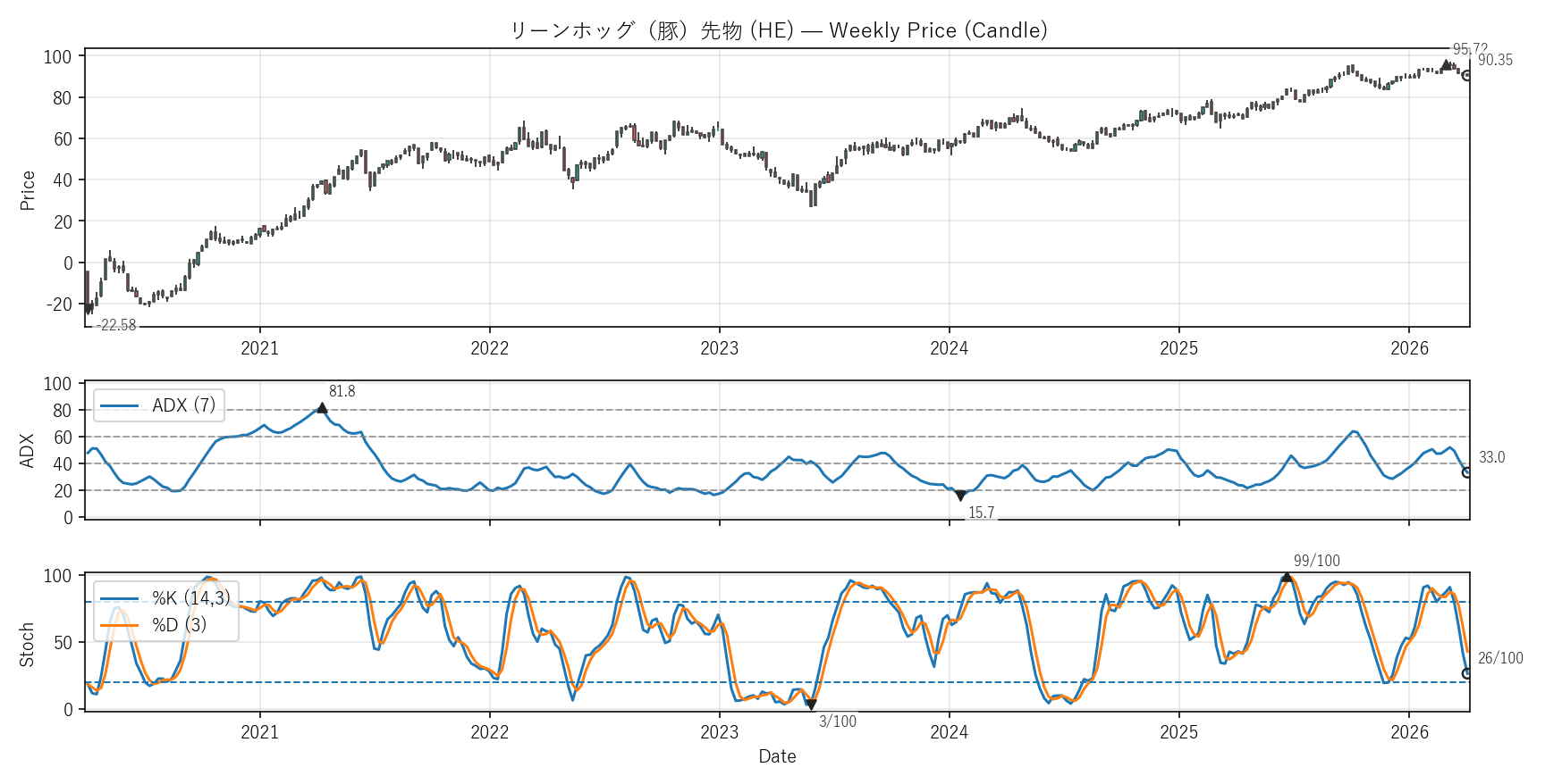 ADX:33.0(15.7〜81.8)|位置 26/100 / Stoch %K:26(3〜99)|位置 24/100