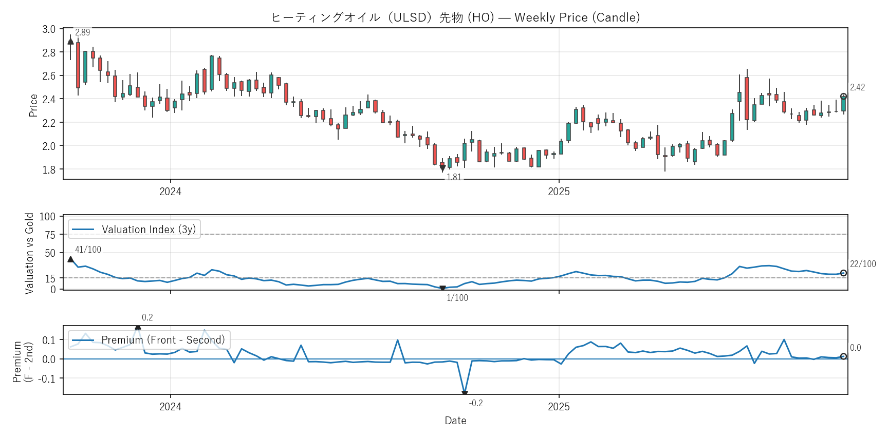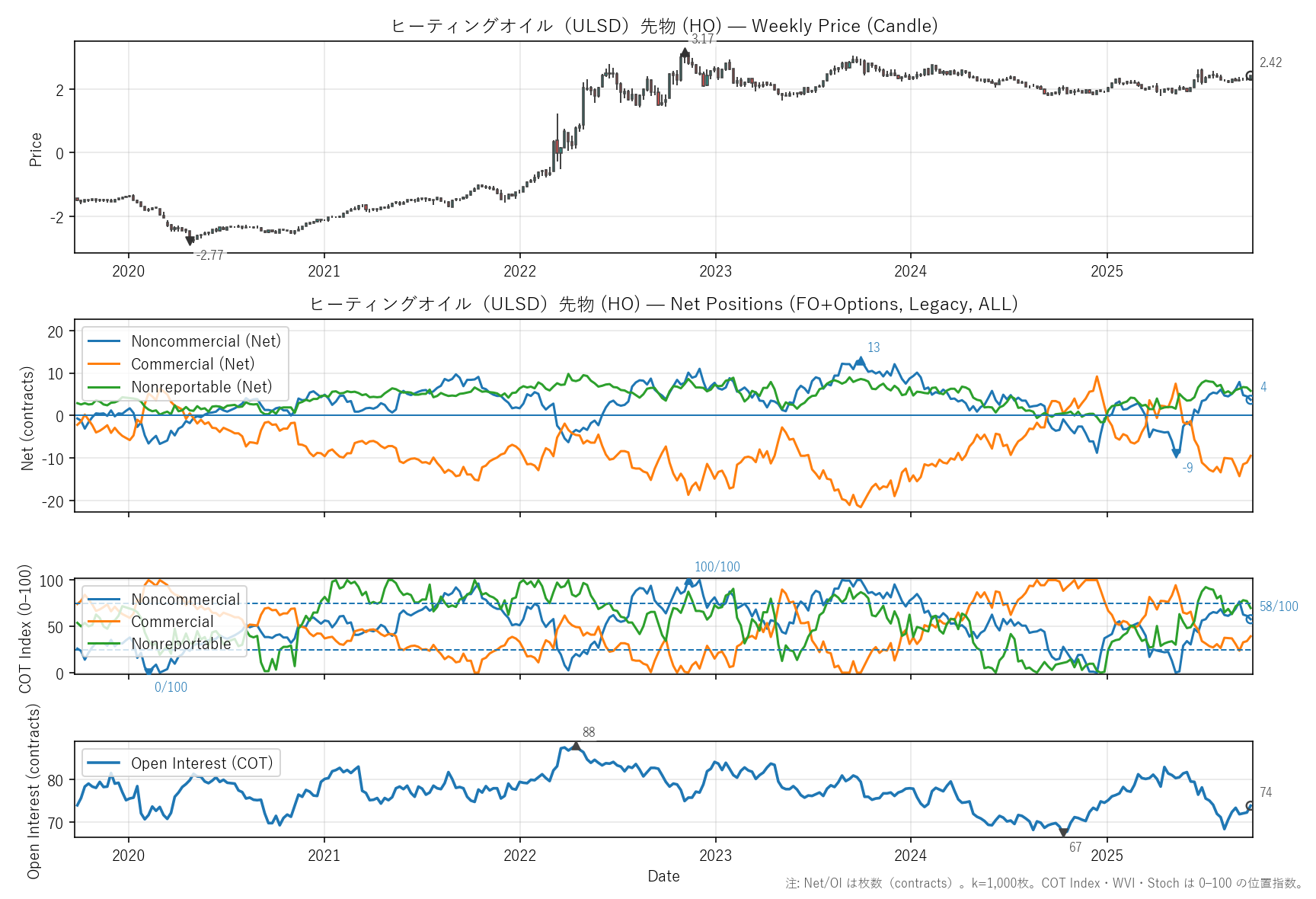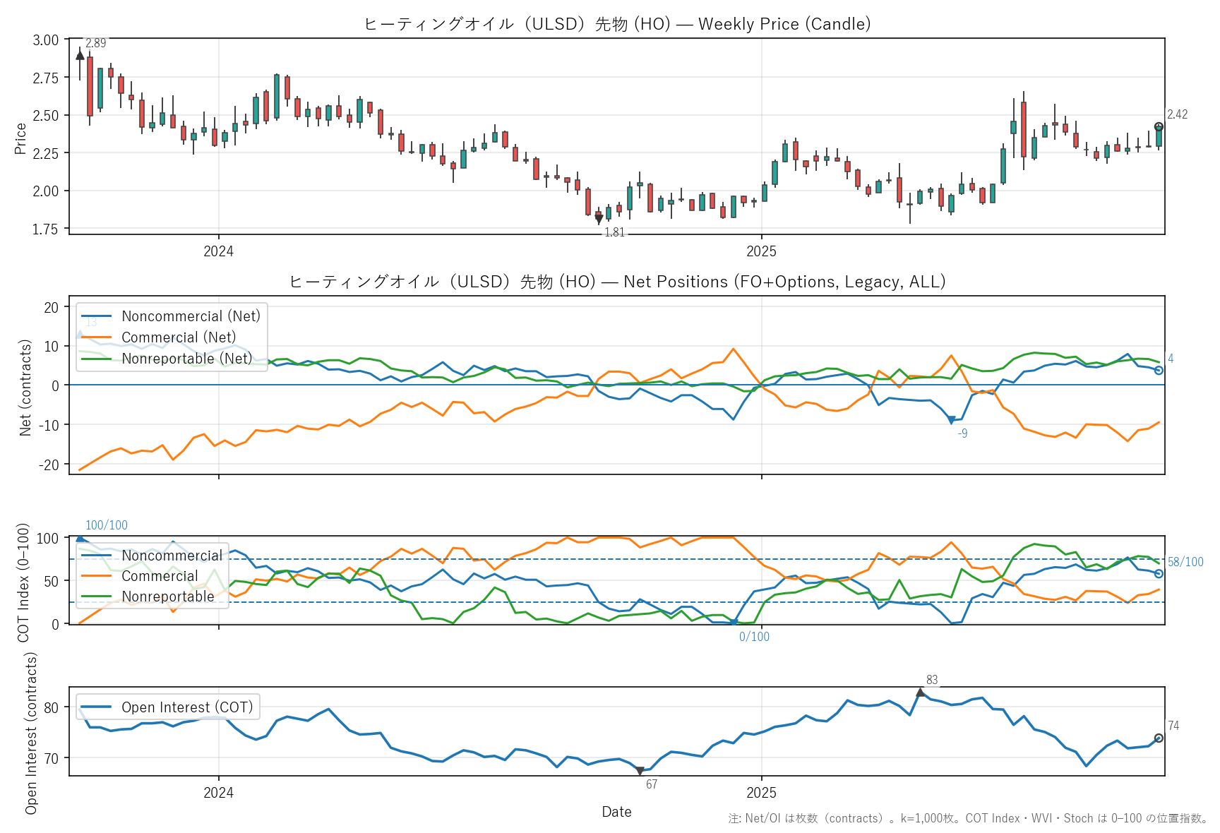 ヒーティングオイル(ULSD)先物(HO)COTレポート・バリュエーション・テクニカル【週足】
