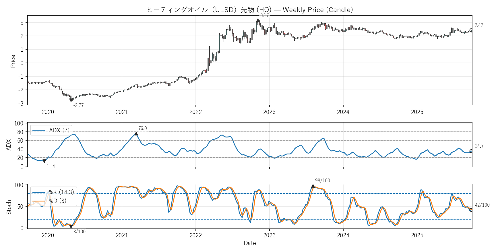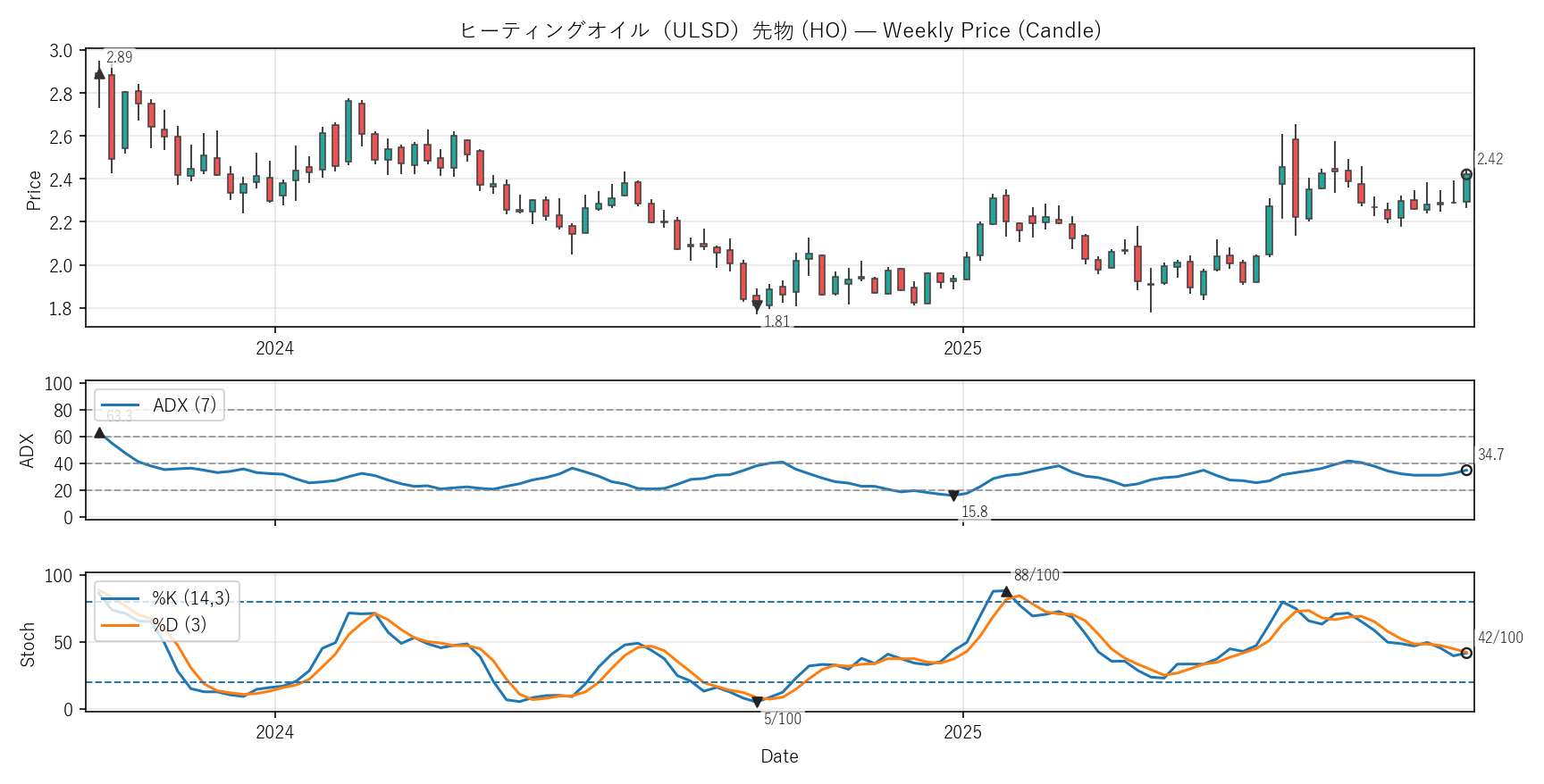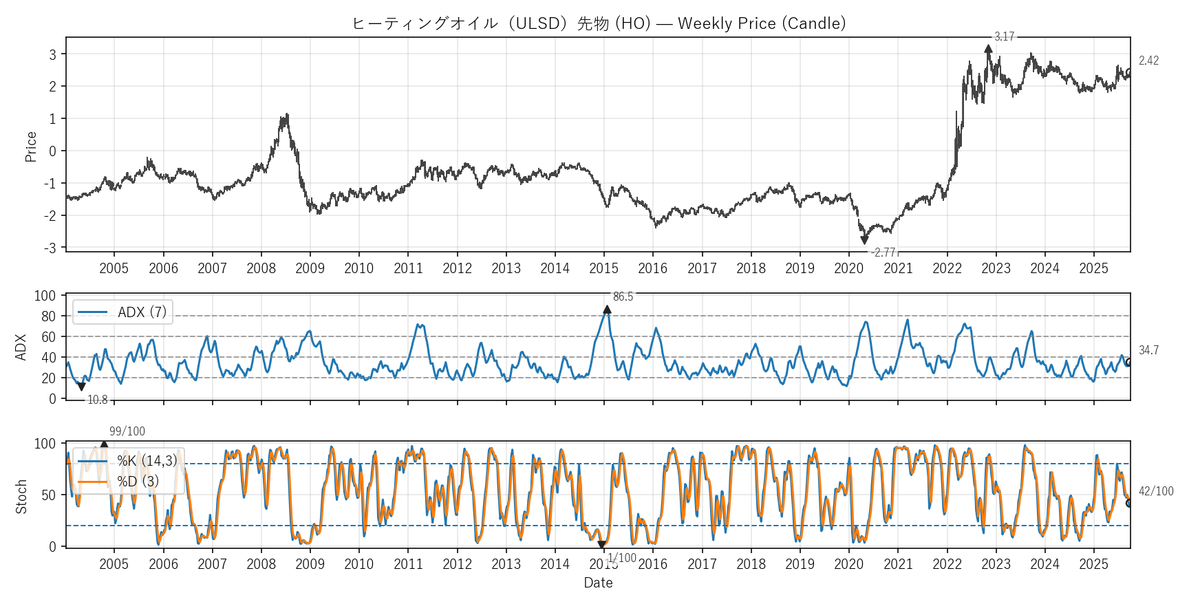 ヒーティングオイル(ULSD)先物。FX/CFD例: HEATOIL/HO。注意: 原油だけでなく精製マージン・季節性の影響。