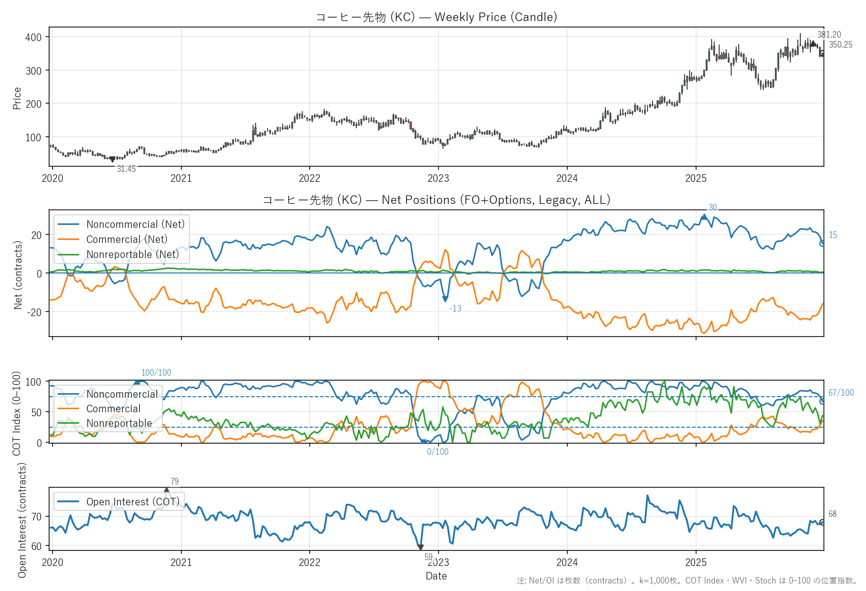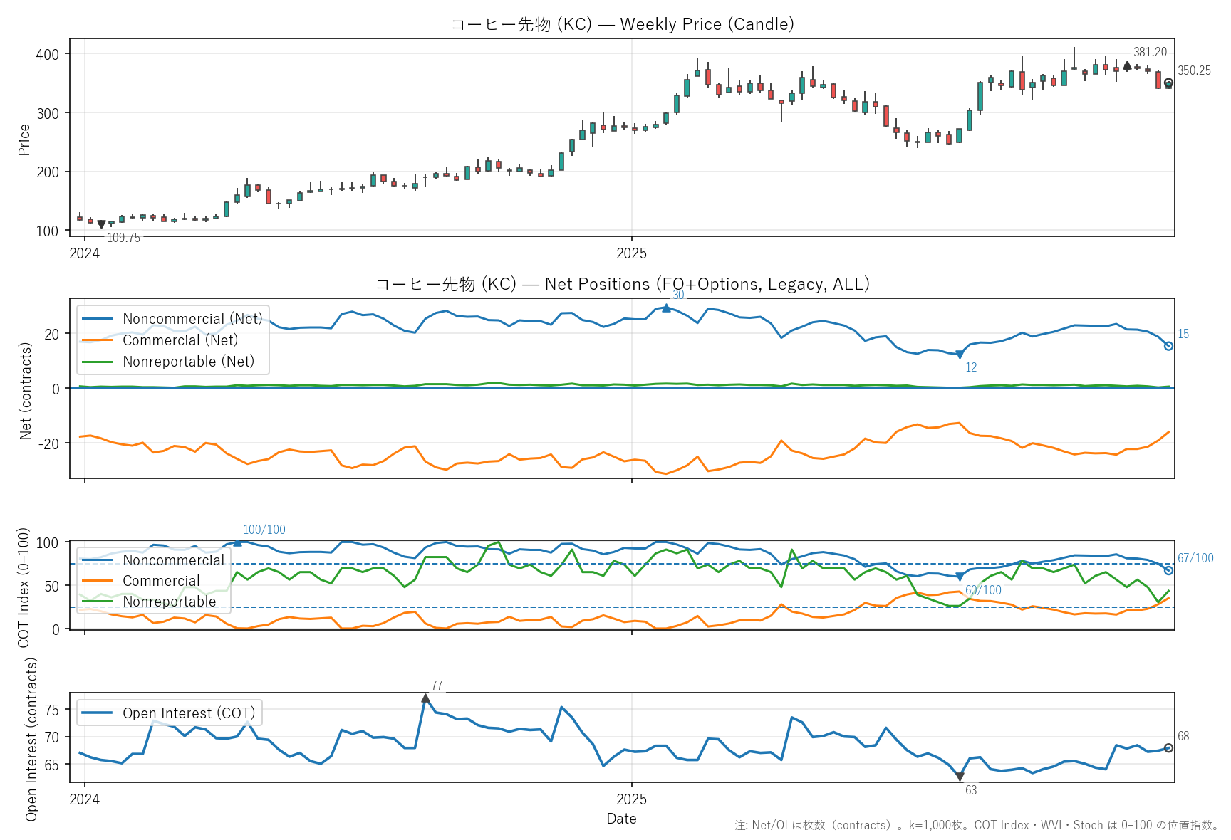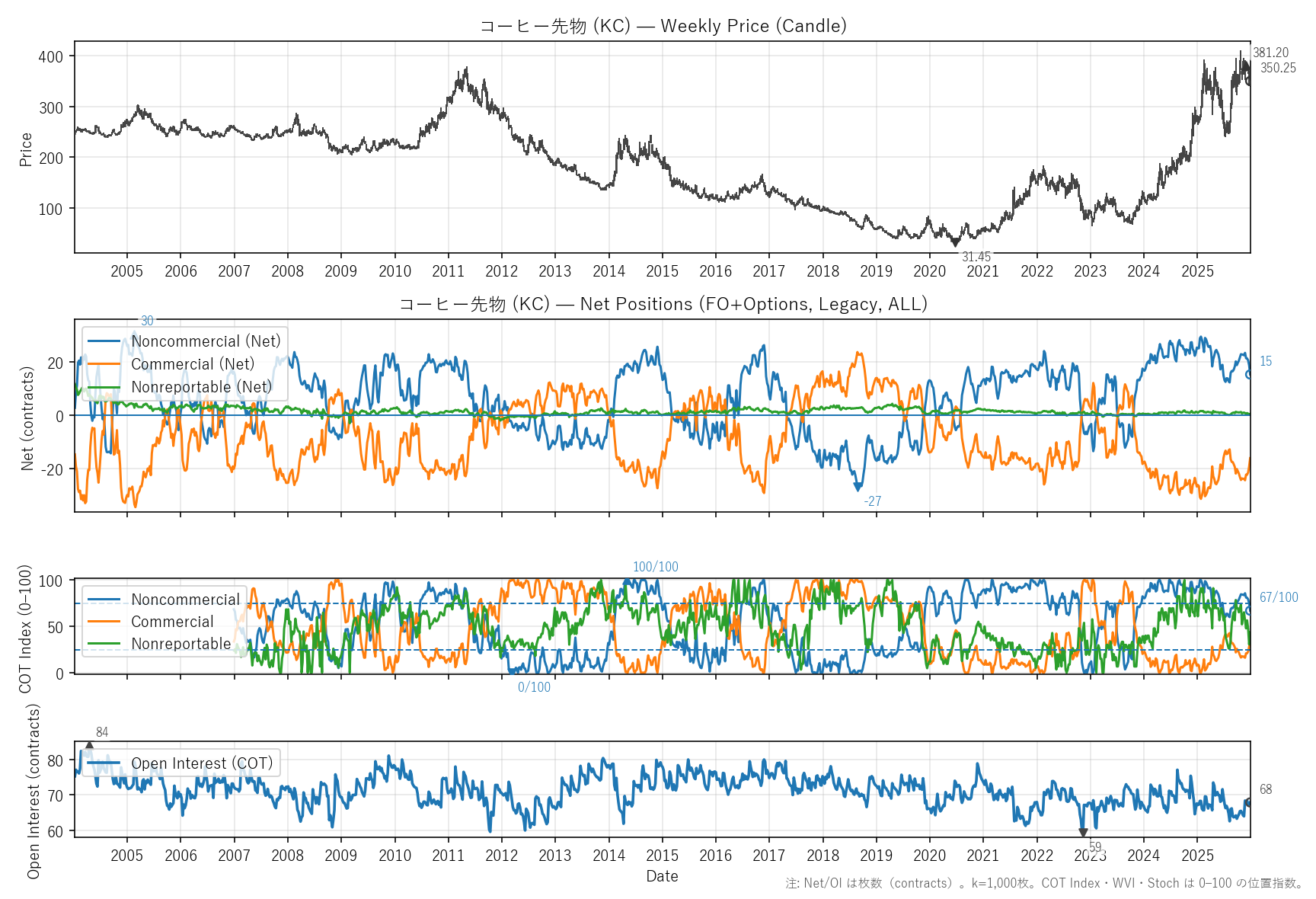 COTは、先物市場で「誰がどれくらい買い(ロング)・売り(ショート)を持っているか」をCFTCが毎週公表するデータです。①COT指数(0〜100)=約3年の範囲での位置、②Net=ロング−ショート、③OI=未決済建玉枚数(本サイトは3者のLONG合計で近似)。