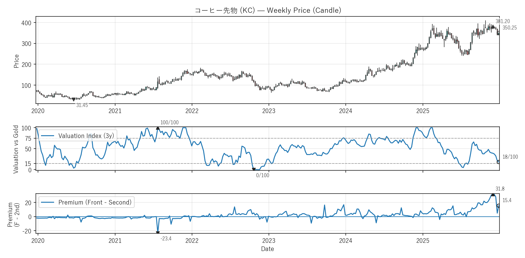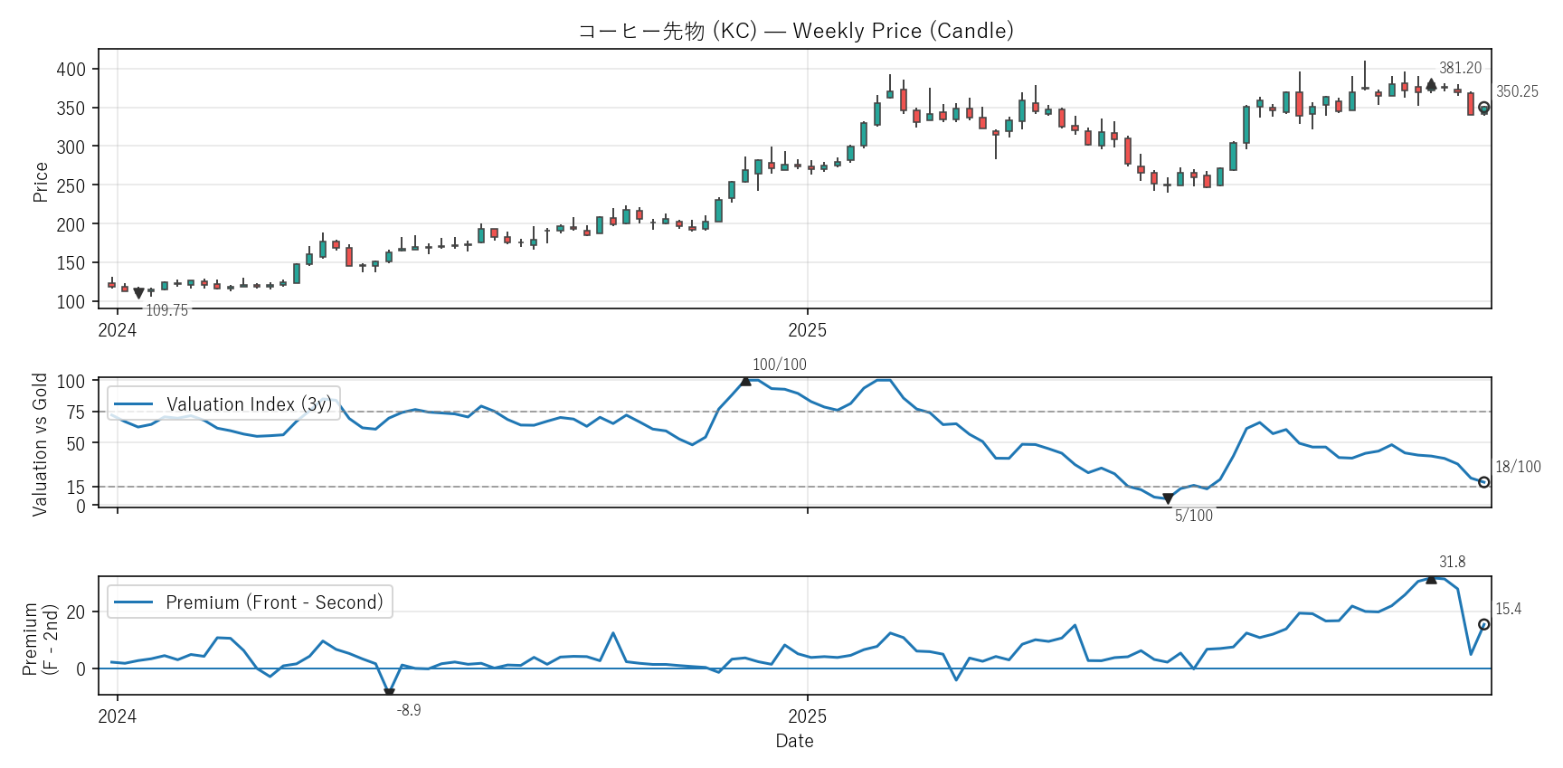 先週比(2025-12-26):Valuation:+7.7pt(18 → 26) / Premium:+10.6(4.8 → 15.4)