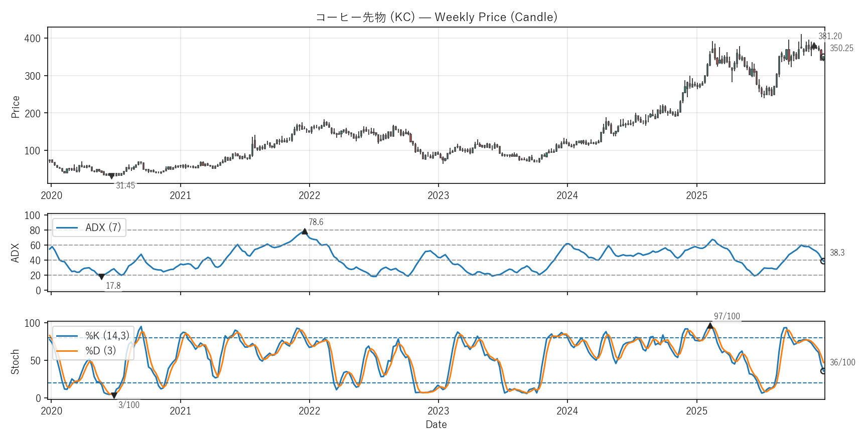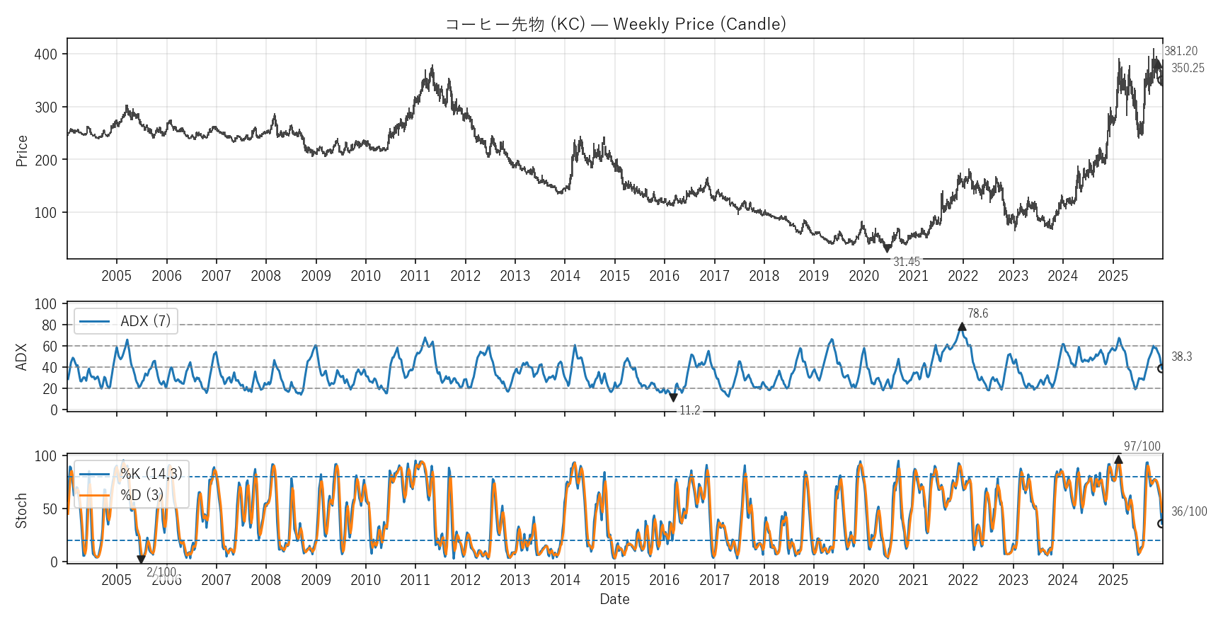 テクニカルは勢い(ADX)と位置(Stoch %K)。ADXは20超=発生、40超=強め。Stochは0〜100で80以上/20以下が目安。