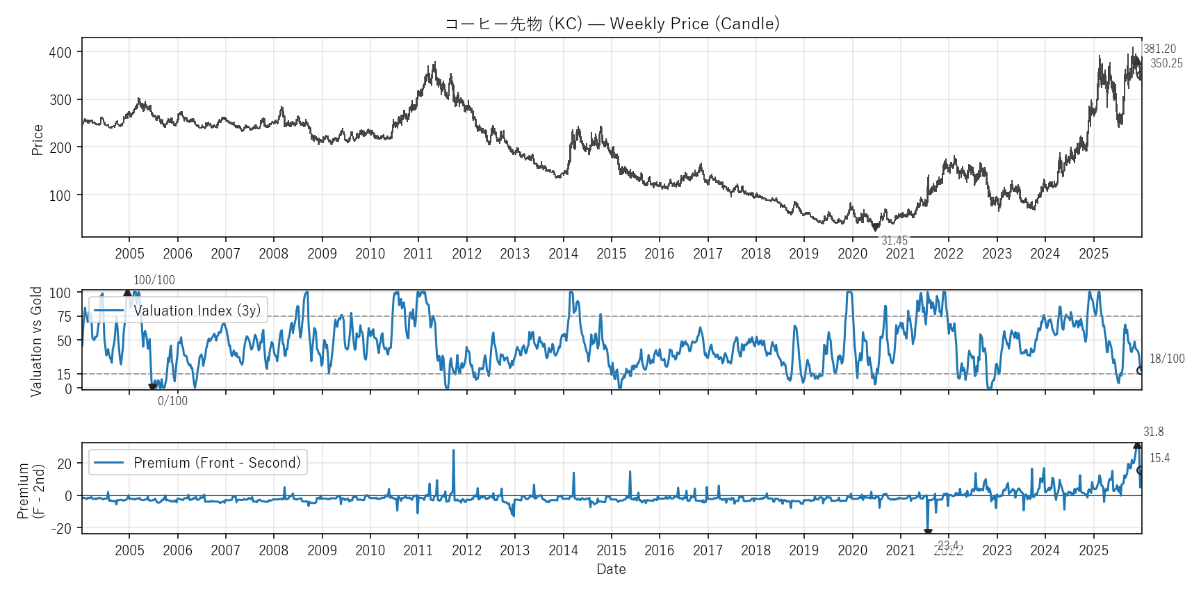 Valuation(WVI)は「基準資産と比べて相対的に高い/安いか」をみる指標。通常は金(GC)、金自身は米30年債(ZB)と比較。価格比(対象/参照×100)を短期/長期EMAで平滑化→差(PAL)の過去位置を0〜100で表示。PremiumはFront−Second(順鞘/逆鞘)。