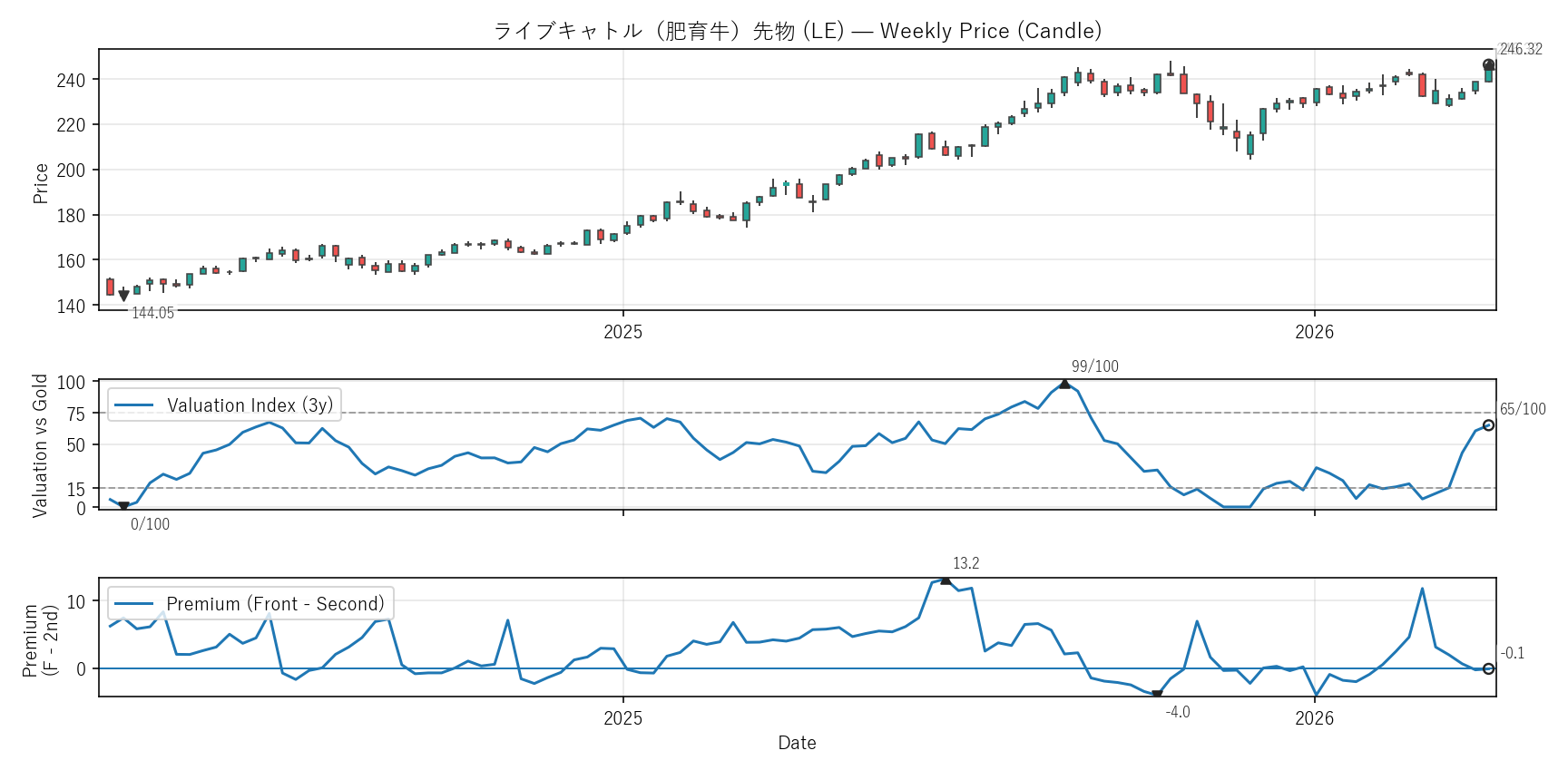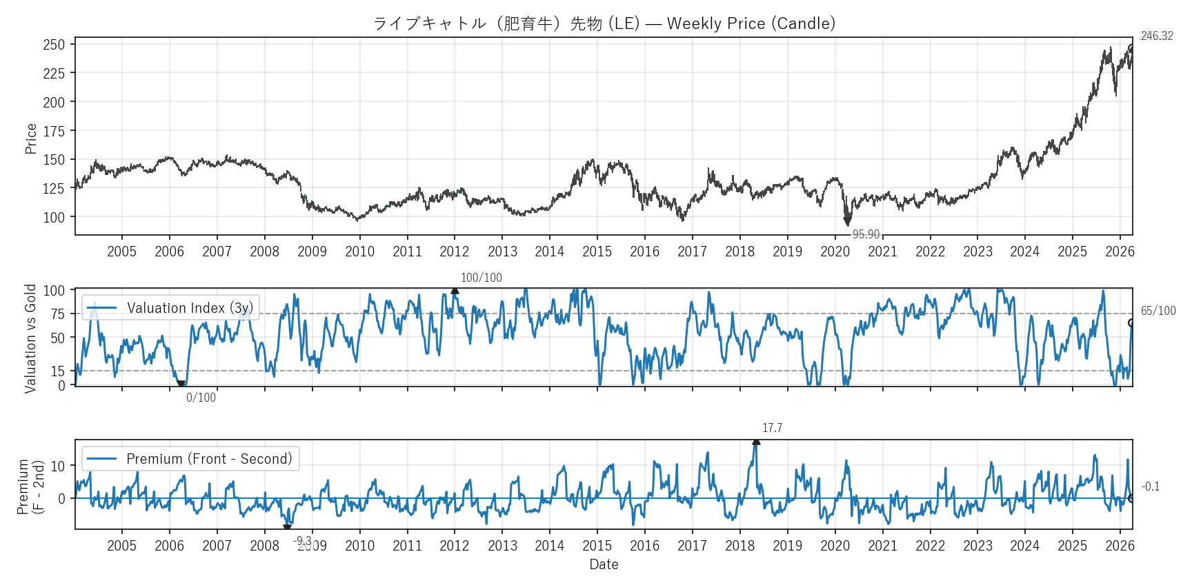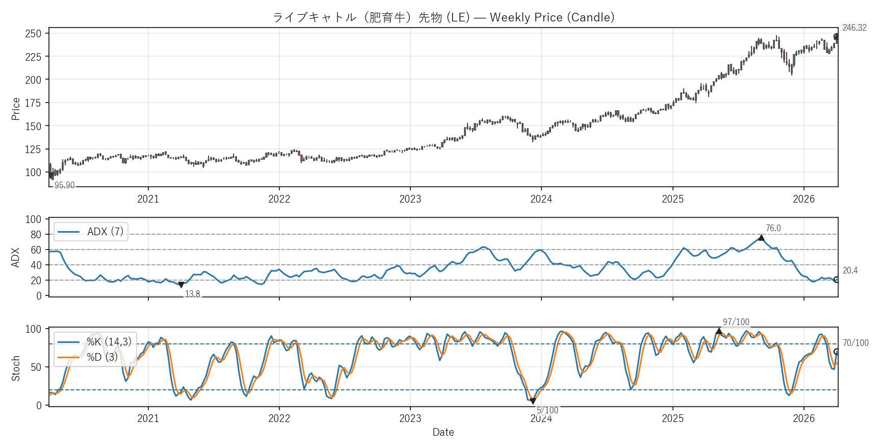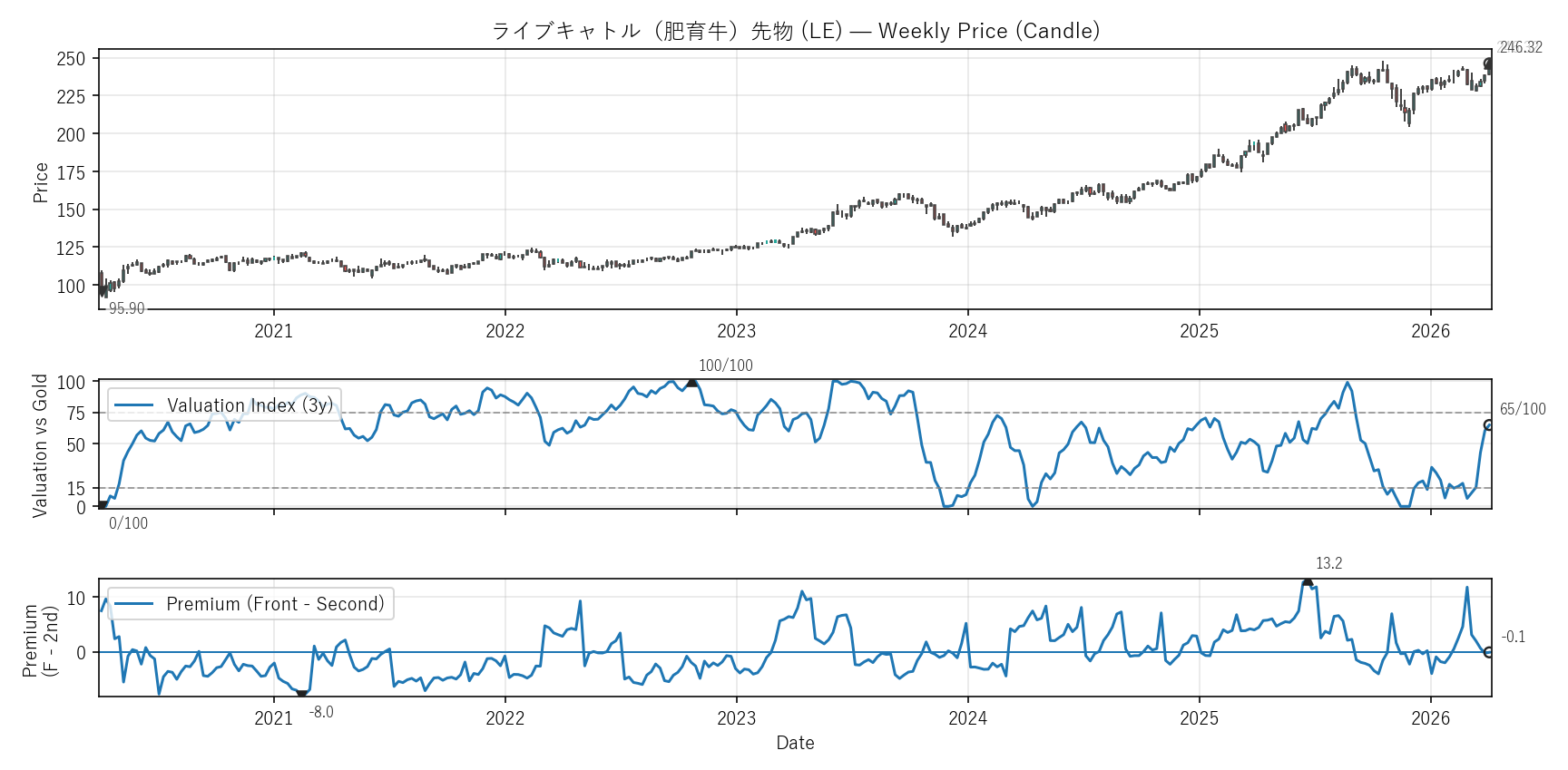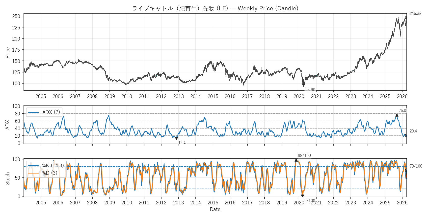 ライブキャトル(肥育牛)先物。FX/CFD例: (業者依存)。注意: 供給サイクル・季節要因に注意。