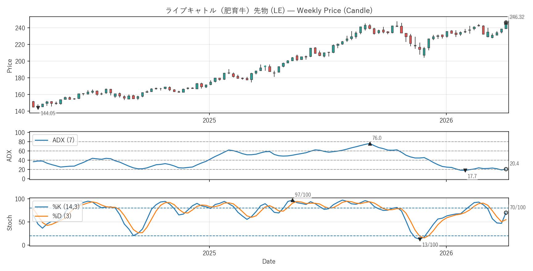 ADX:20.4(17.7〜76.0)|位置 5/100 / Stoch %K:70(13〜97)|位置 68/100