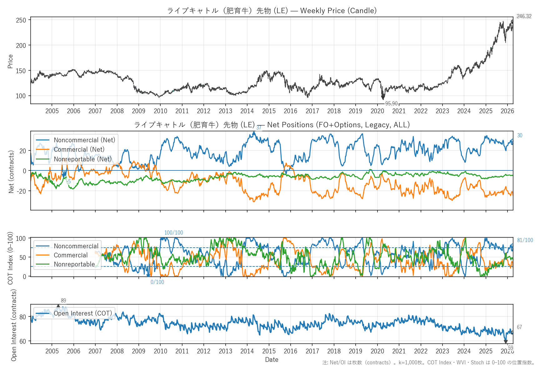 COTは、先物市場で「誰がどれくらい買い(ロング)・売り(ショート)を持っているか」をCFTCが毎週公表するデータです。①COT指数(0〜100)=約3年の範囲での位置、②Net=ロング−ショート、③OI=未決済建玉枚数(本サイトは3者のLONG合計で近似)。