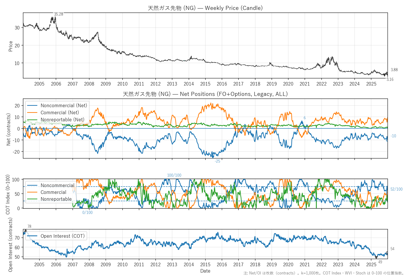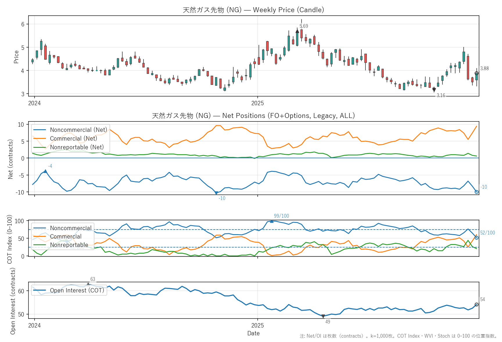 先週比(2025-12-26):非商業COT指数:-2pt(-8 → -10) / 商業COT指数:+2pt(7 → 9) / NR COT指数:-0pt(1 → 1) / Open Interest:+3.05%(52 → 54)