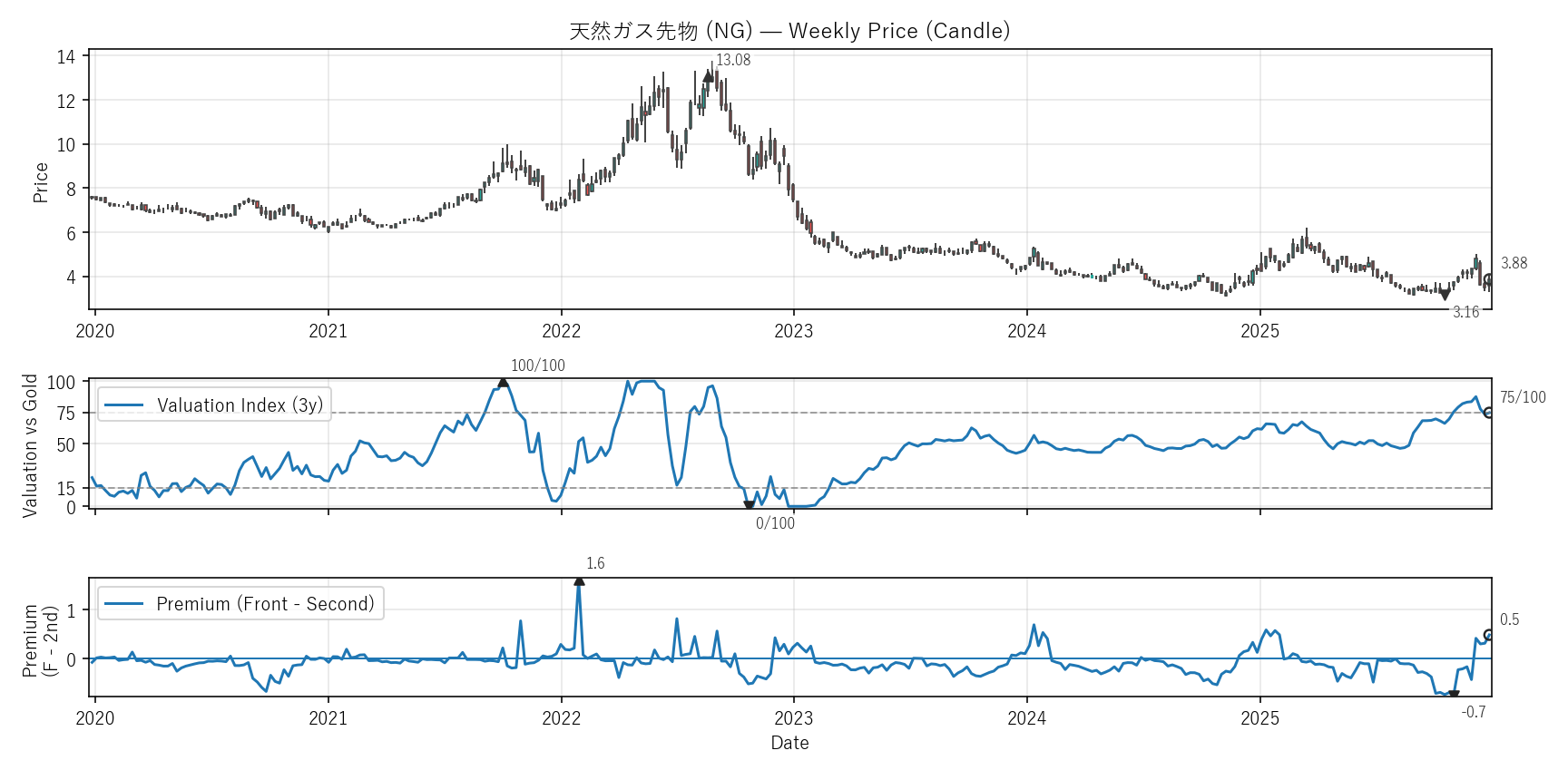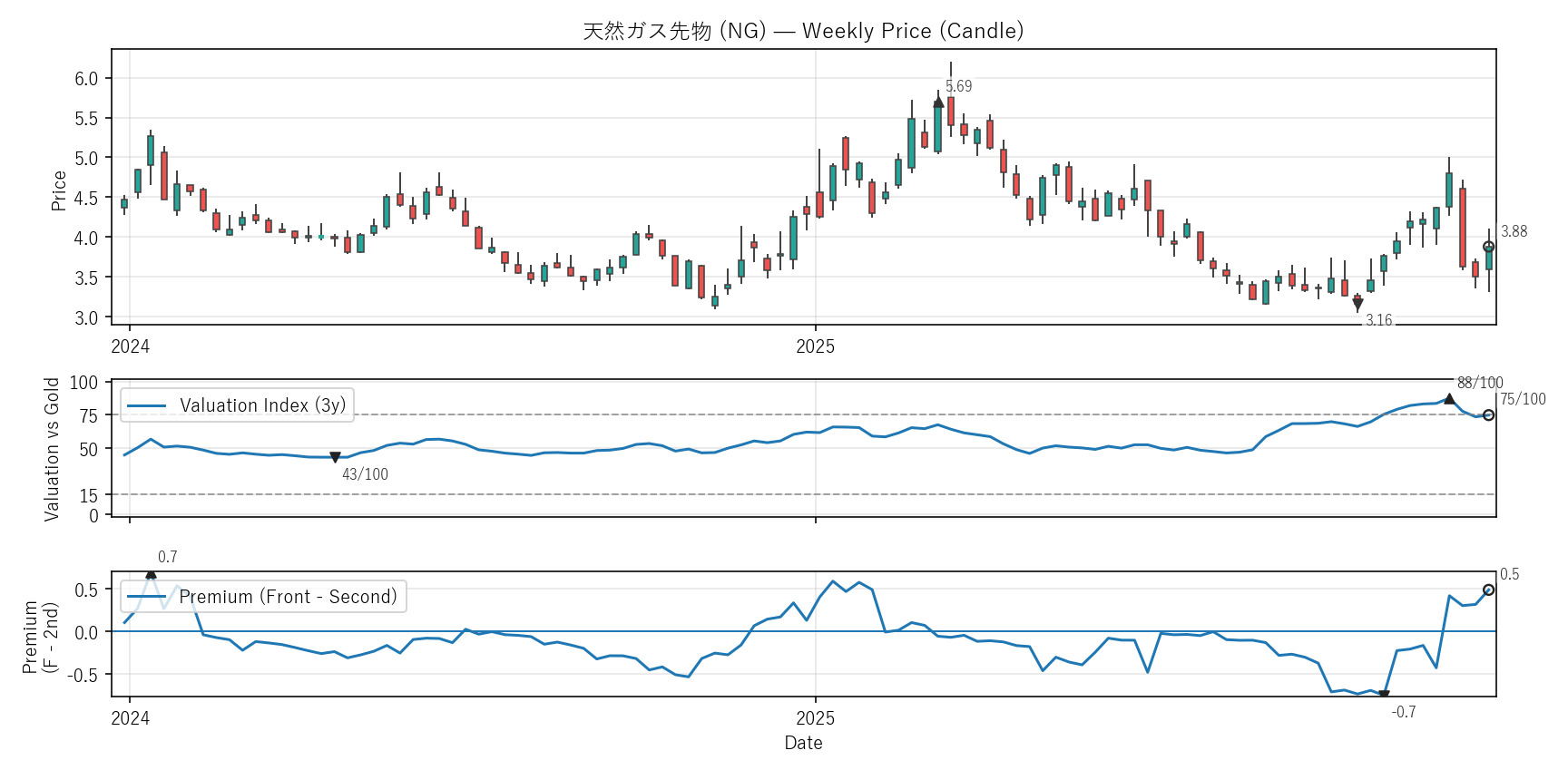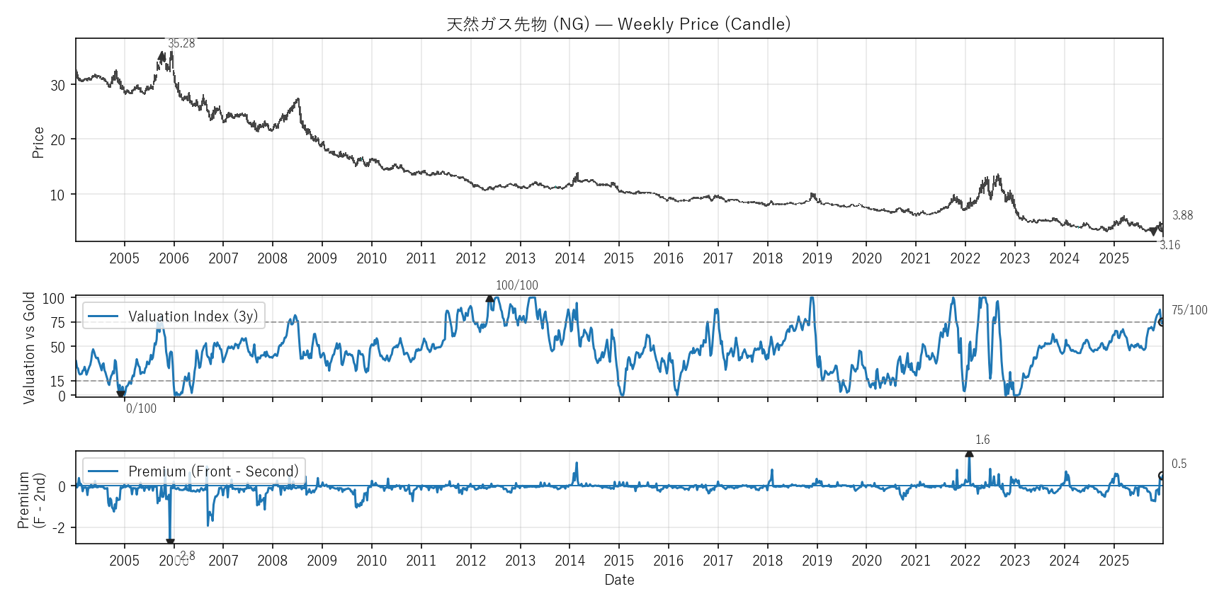 Valuation(WVI)は「基準資産と比べて相対的に高い/安いか」をみる指標。通常は金(GC)、金自身は米30年債(ZB)と比較。価格比(対象/参照×100)を短期/長期EMAで平滑化→差(PAL)の過去位置を0〜100で表示。PremiumはFront−Second(順鞘/逆鞘)。