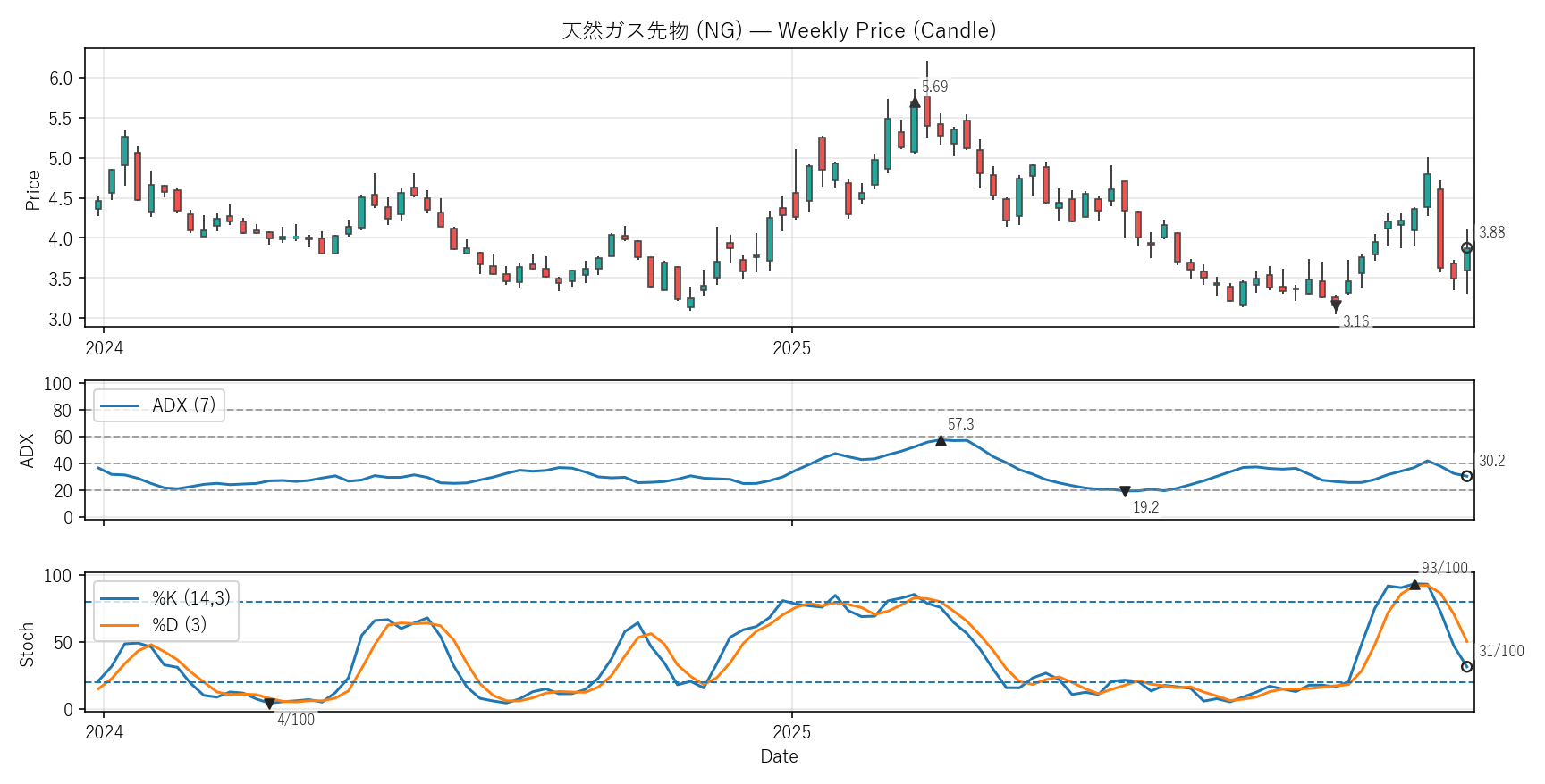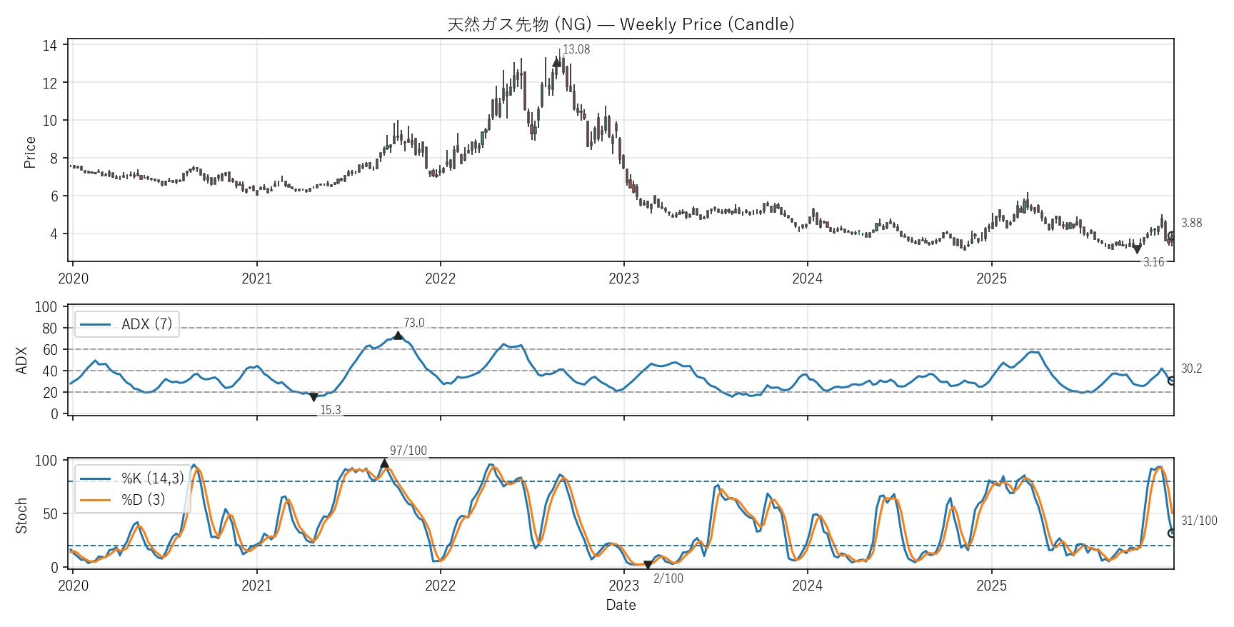 先週比(2025-12-26):週次リターン:-6.68%(終値 3.88 → 3.62) / ADX:-1.3pt(30 → 29)