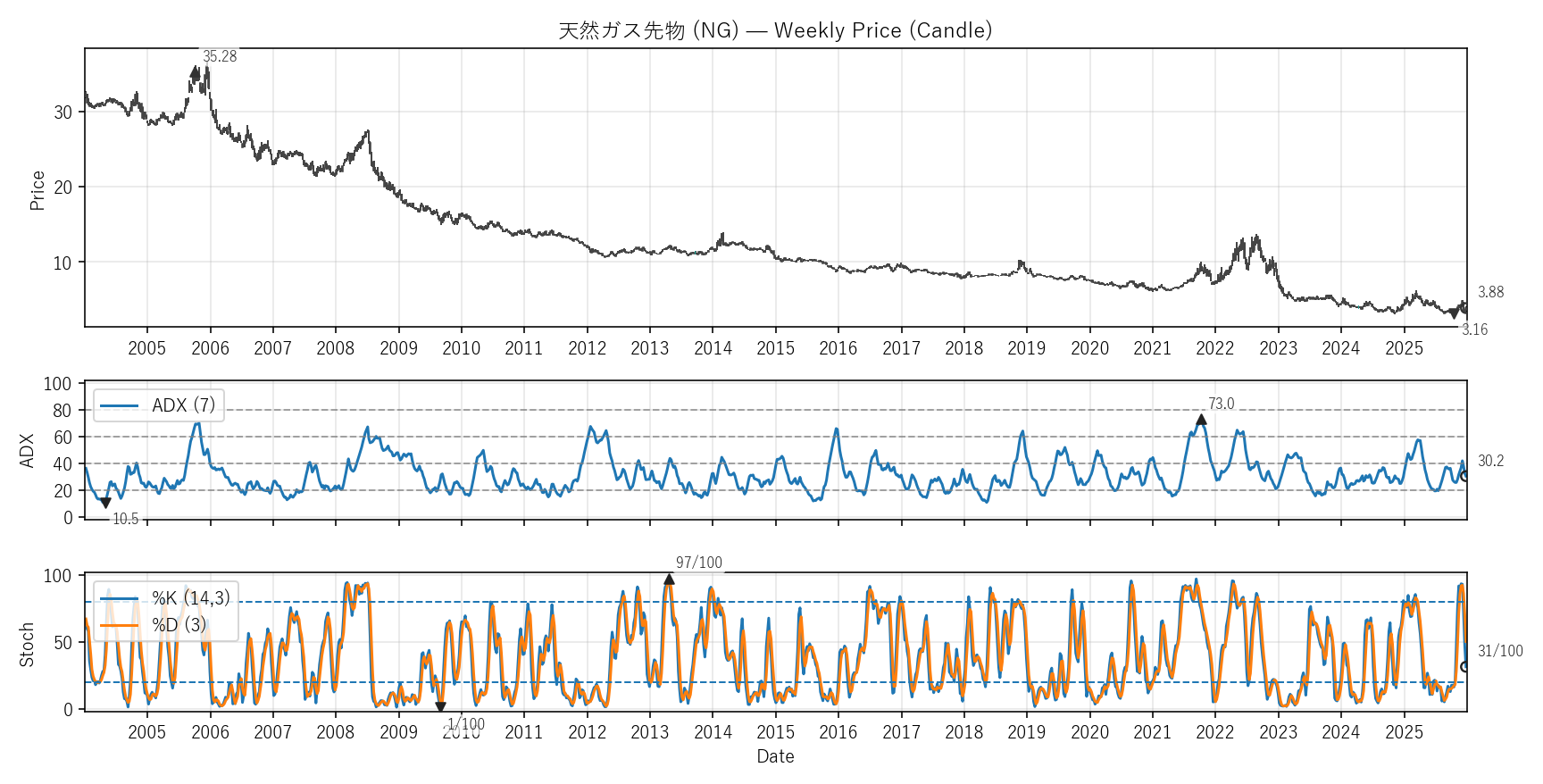テクニカルは勢い(ADX)と位置(Stoch %K)。ADXは20超=発生、40超=強め。Stochは0〜100で80以上/20以下が目安。