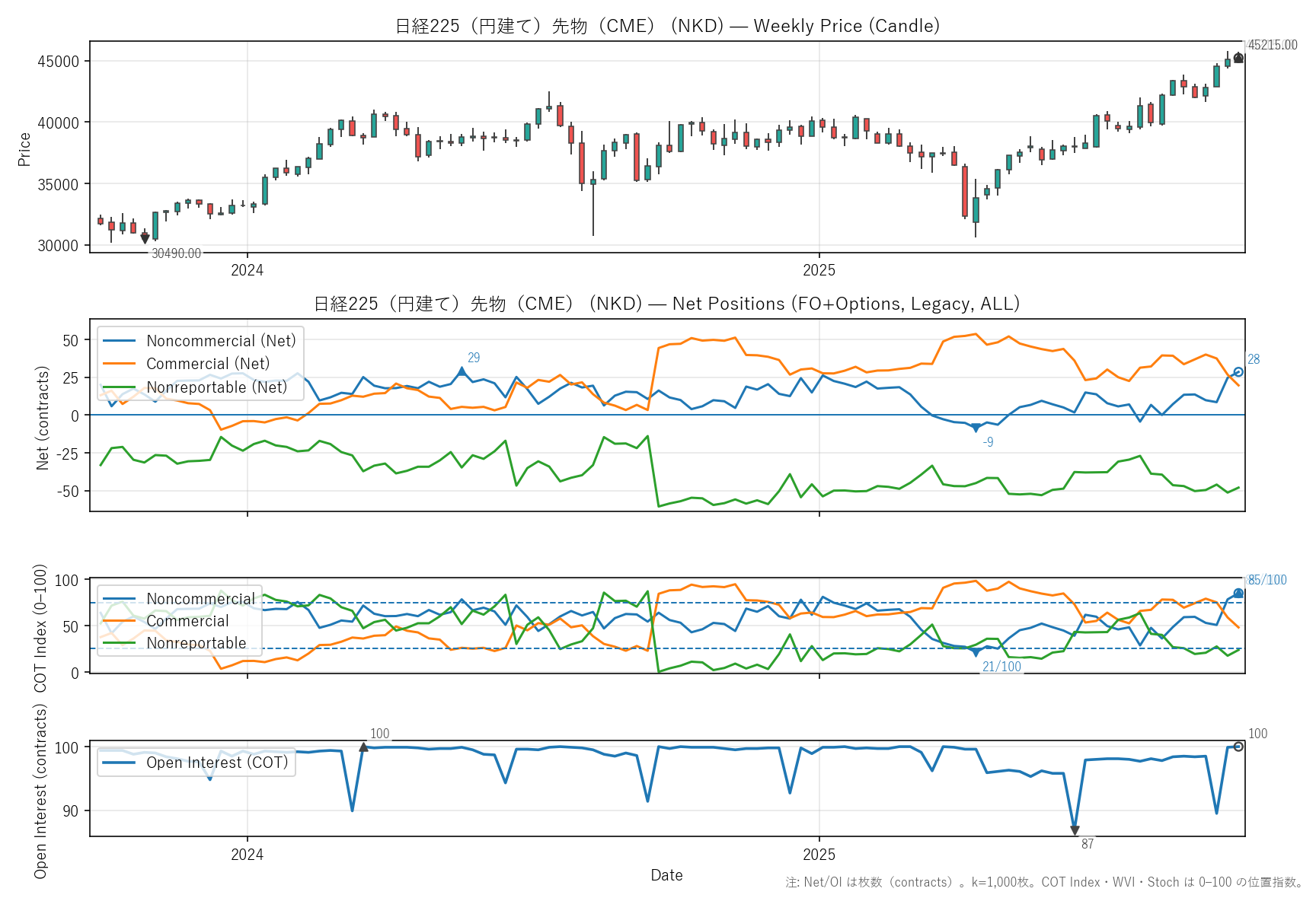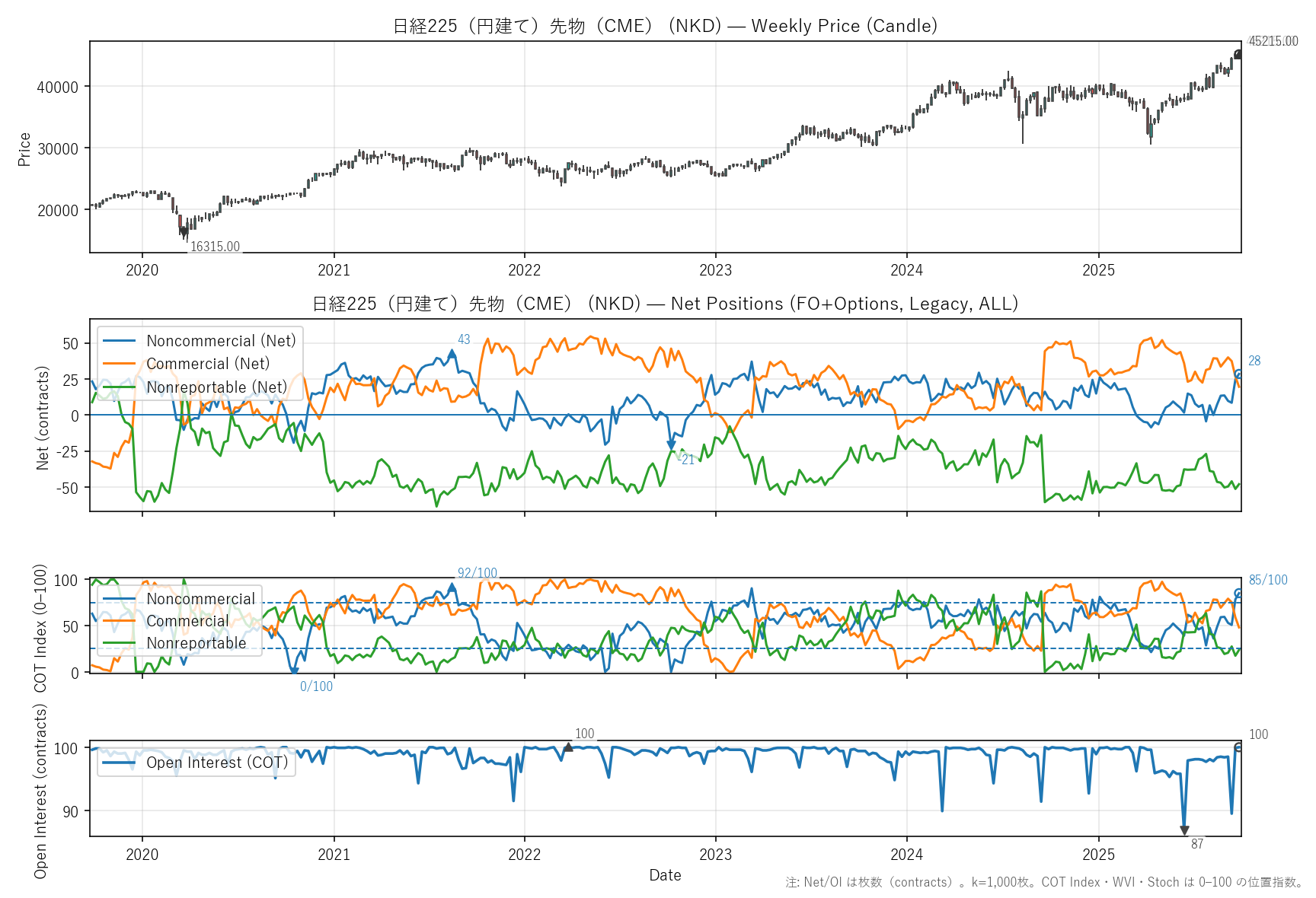先週比(2025-09-26):非商業COT指数:+4pt(25 → 28) / 商業COT指数:-7pt(27 → 20) / NR COT指数:+3pt(-51 → -48) / Open Interest:+0.10%(100 → 100)