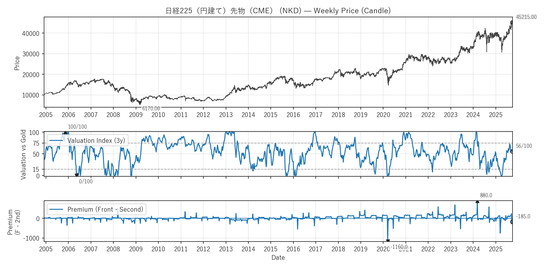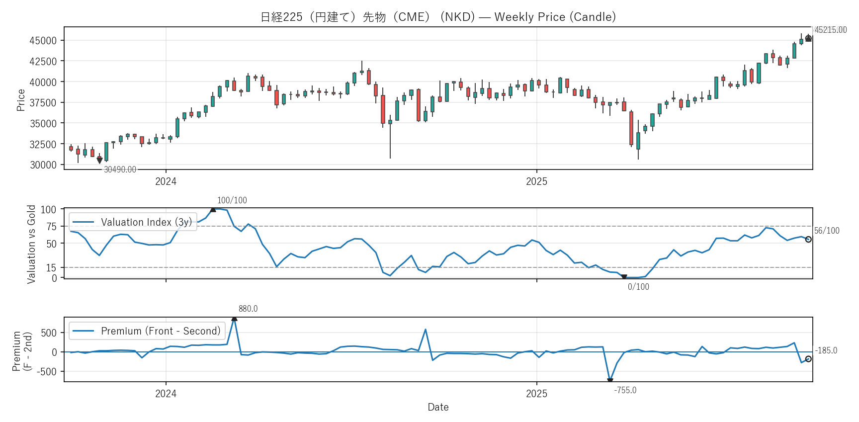 Valuation(WVI)は「基準資産と比べて相対的に高い/安いか」をみる指標。通常は金(GC)、金自身は米30年債(ZB)と比較。価格比(対象/参照×100)を短期/長期EMAで平滑化→差(PAL)の過去位置を0〜100で表示。PremiumはFront−Second(順鞘/逆鞘)。