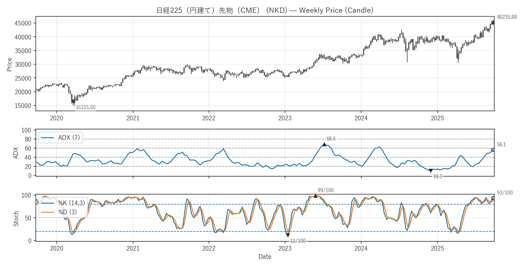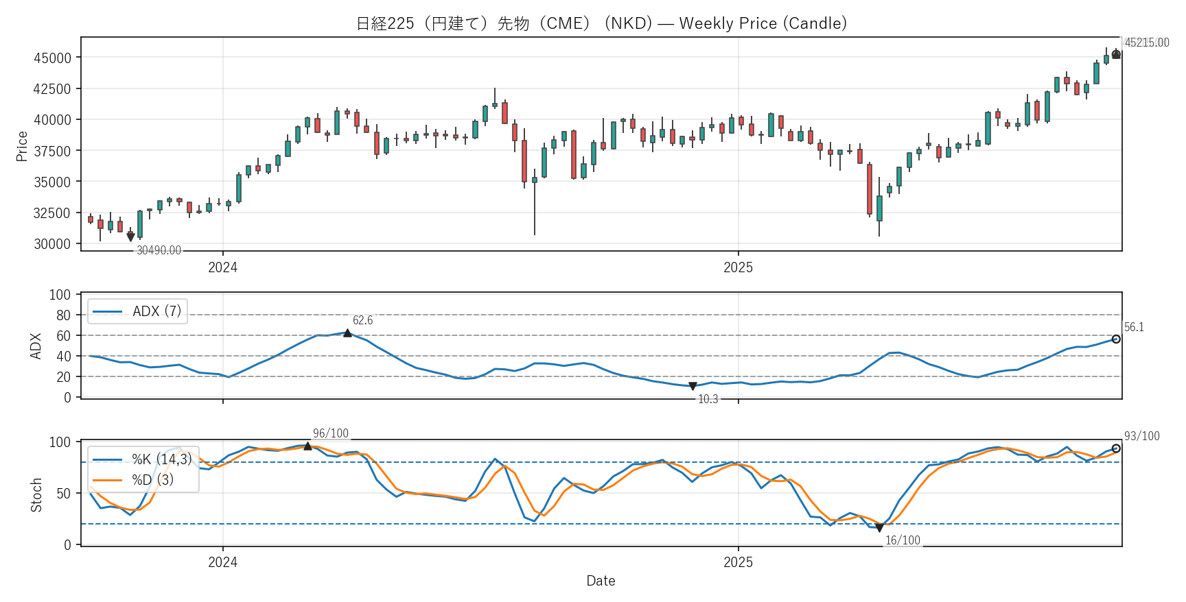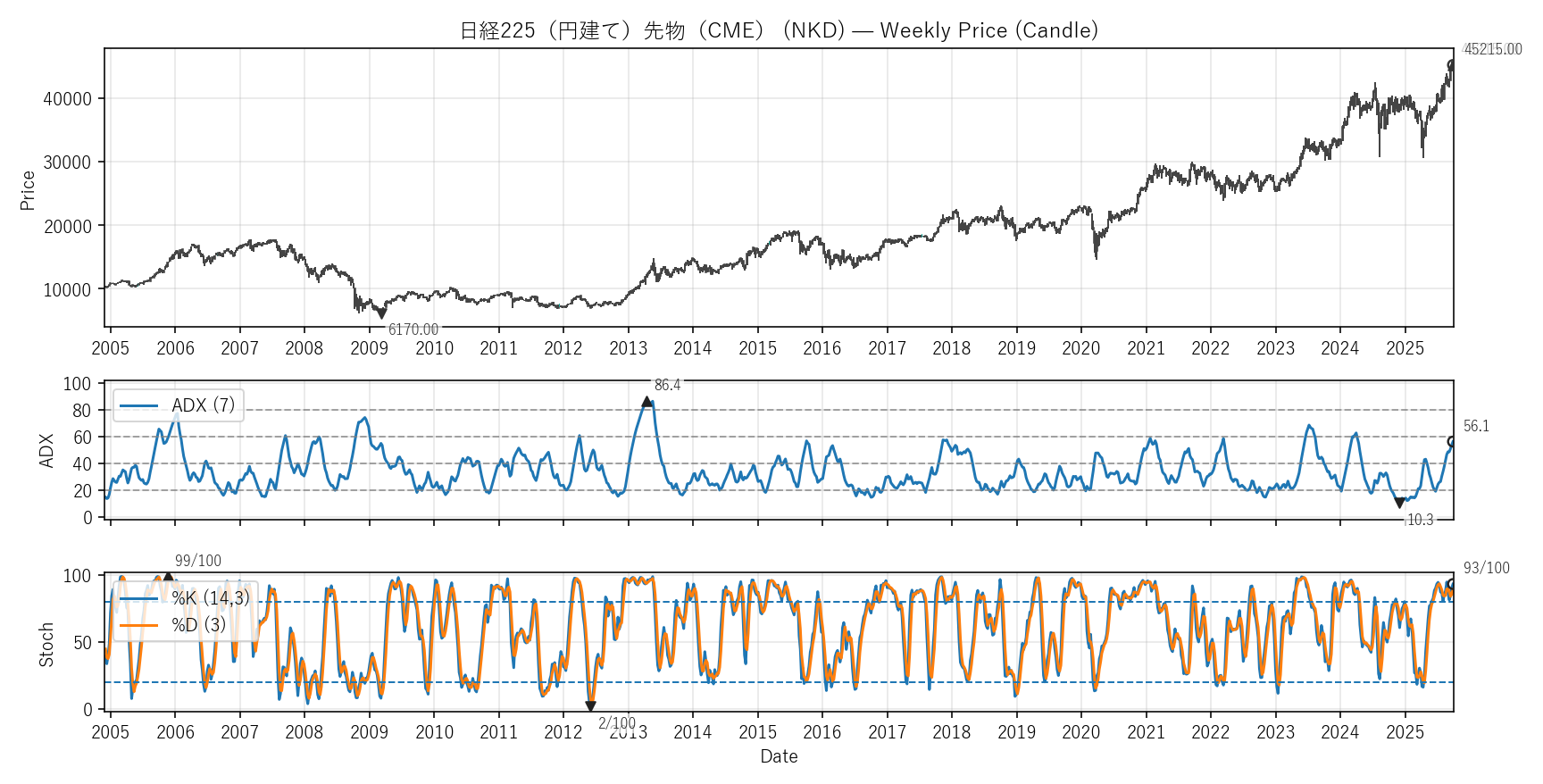 テクニカルは勢い(ADX)と位置(Stoch %K)。ADXは20超=発生、40超=強め。Stochは0〜100で80以上/20以下が目安。