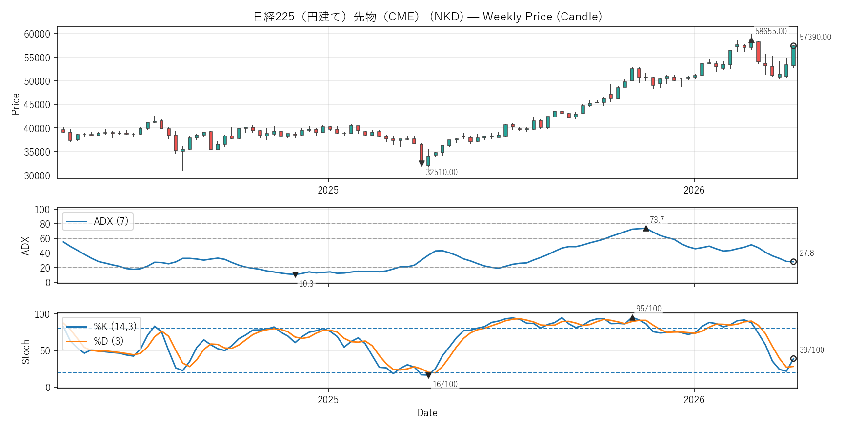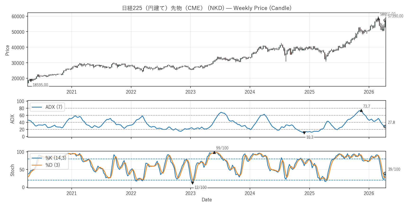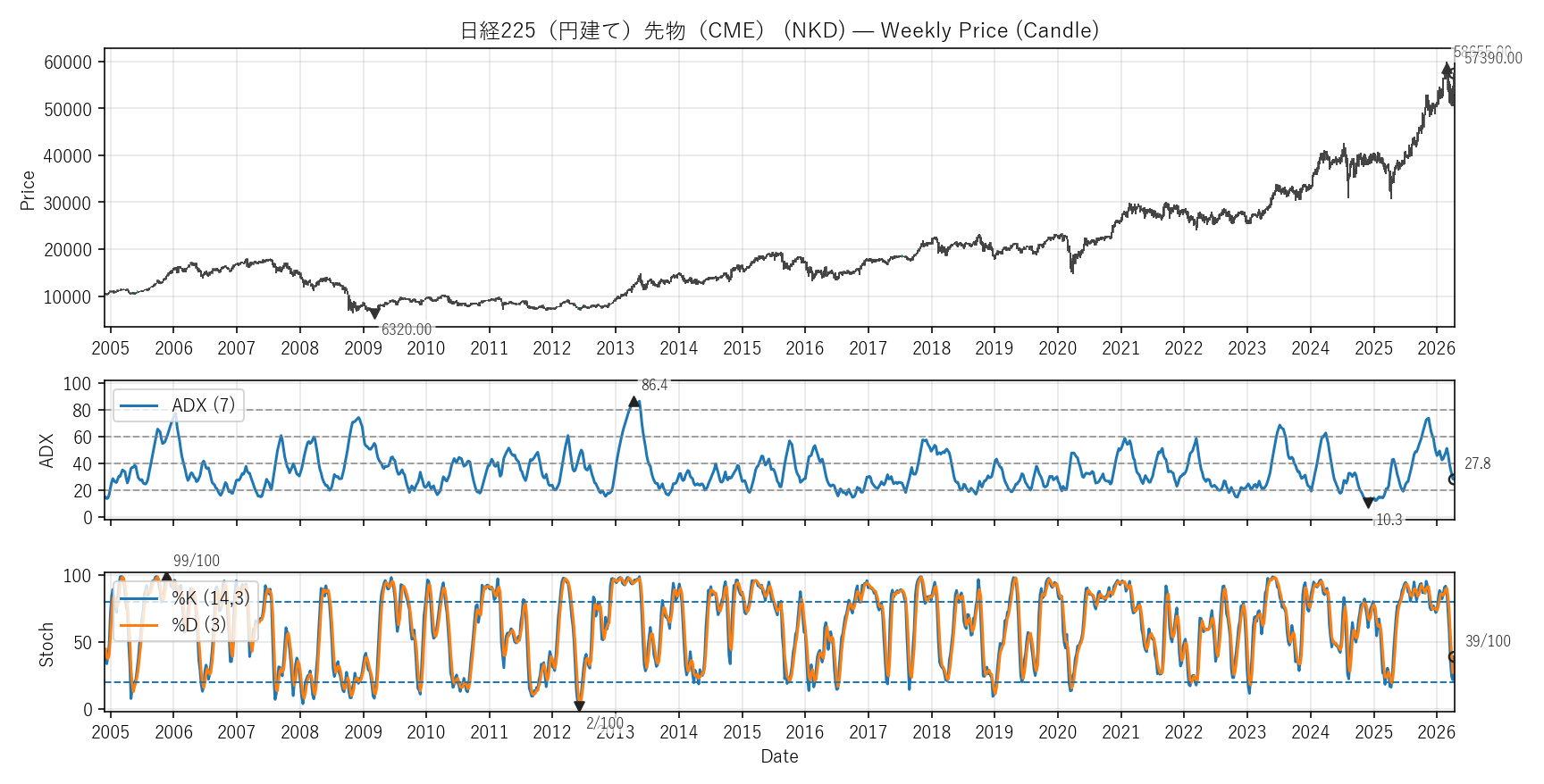 テクニカルは勢い(ADX)と位置(Stoch %K)。ADXは20超=発生、40超=強め。Stochは0〜100で80以上/20以下が目安。