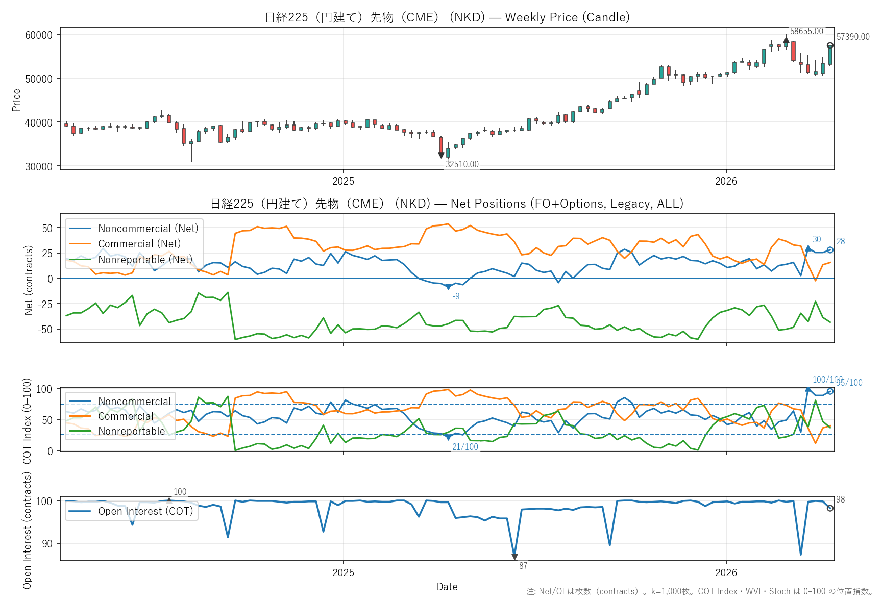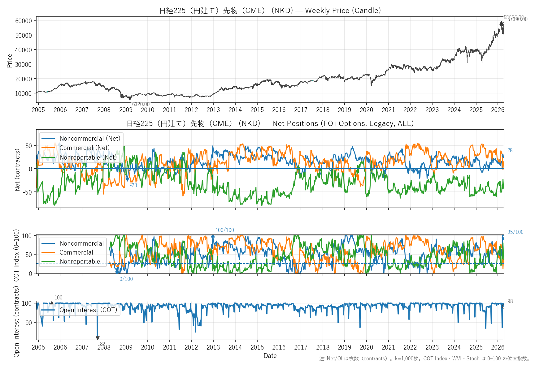 非商業COT指数:95(21〜100)|位置 94/100 / 商業COT指数:40(11〜98)|位置 33/100 / NR COT指数:37(0〜87)|位置 42/100