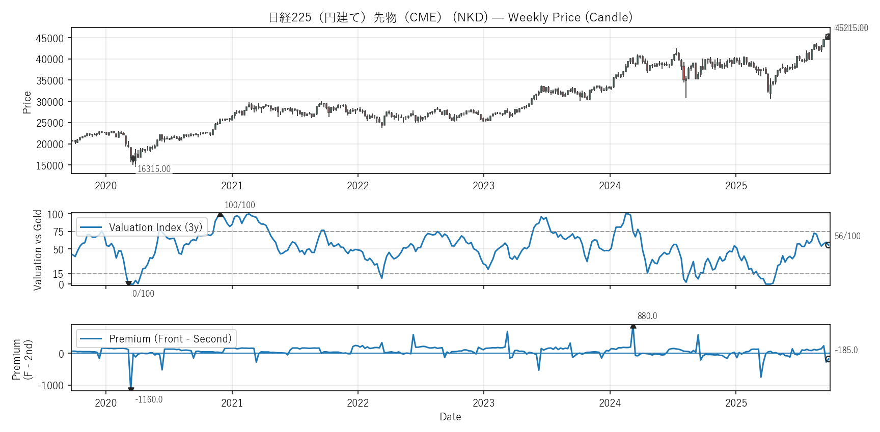 先週比(2025-09-26):Valuation:+18.3pt(54 → 73) / Premium:+95.0(-280.0 → -185.0)