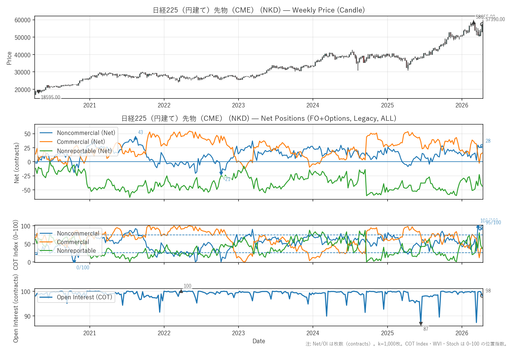 先週比(2026-04-10):非商業COT指数:+3pt(25 → 28) / 商業COT指数:+2pt(13 → 16) / NR COT指数:-5pt(-39 → -43) / Open Interest:-1.60%(100 → 98)