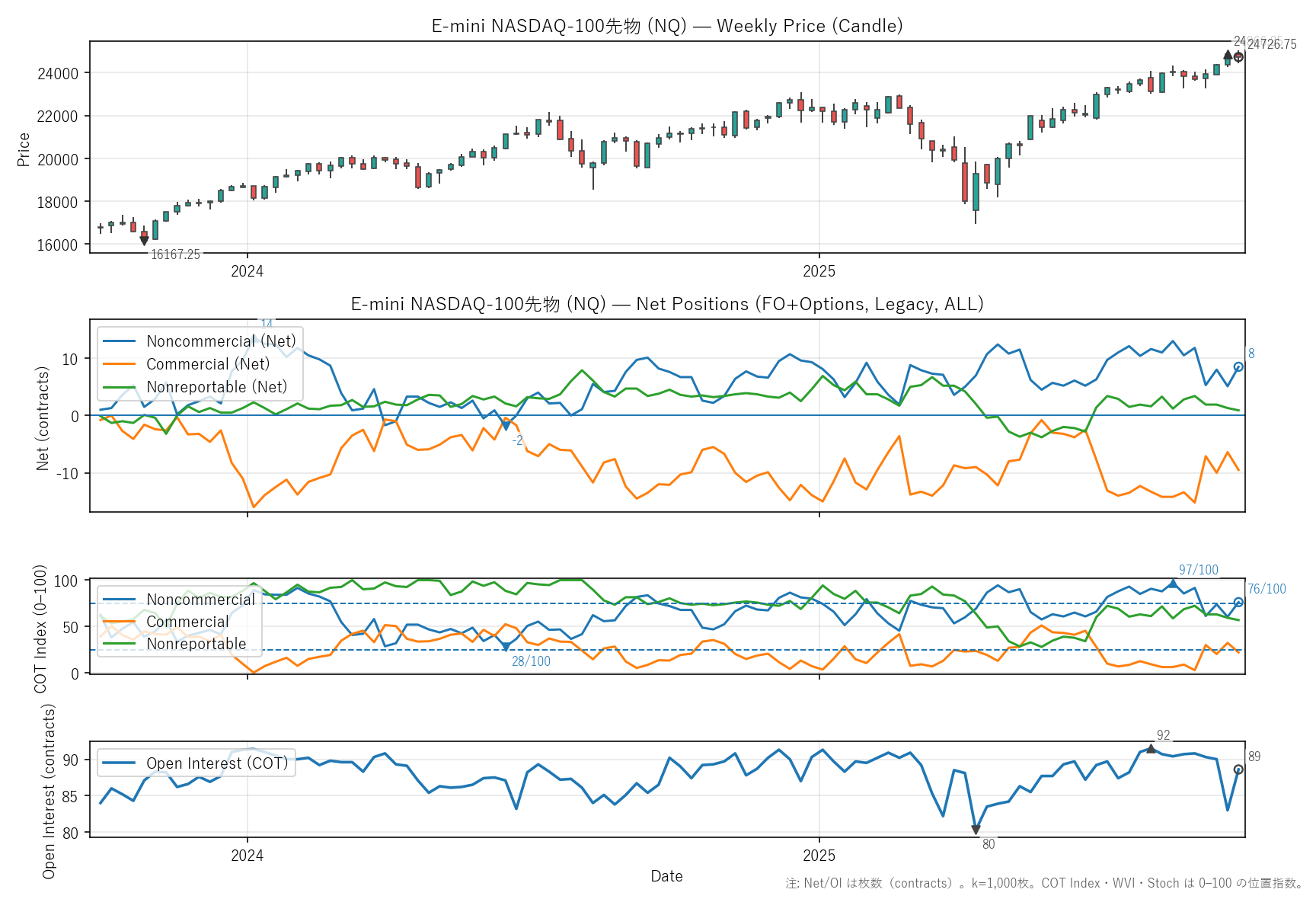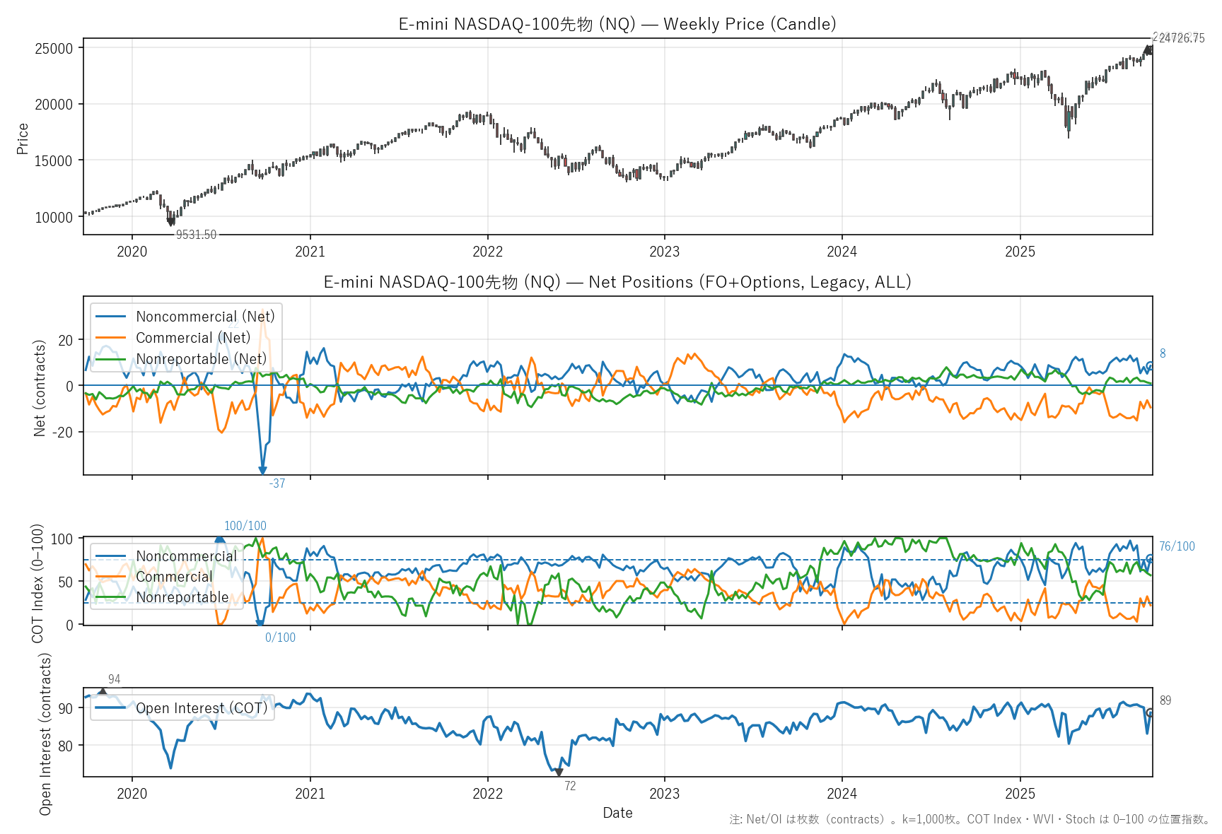 先週比(2025-09-26):非商業COT指数:+3pt(5 → 8) / 商業COT指数:-3pt(-6 → -10) / NR COT指数:-0pt(1 → 1) / Open Interest:+6.75%(83 → 89)