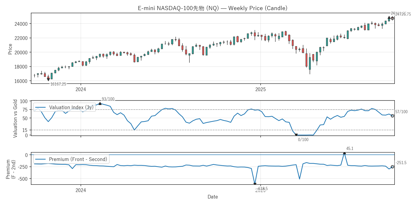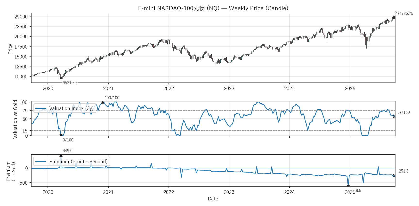 先週比(2025-09-26):Valuation:+13.2pt(43 → 57) / Premium:+46.7(-298.2 → -251.5)