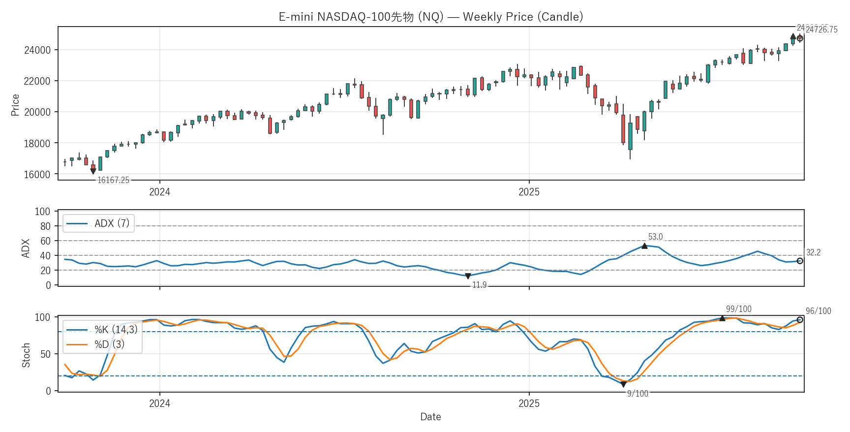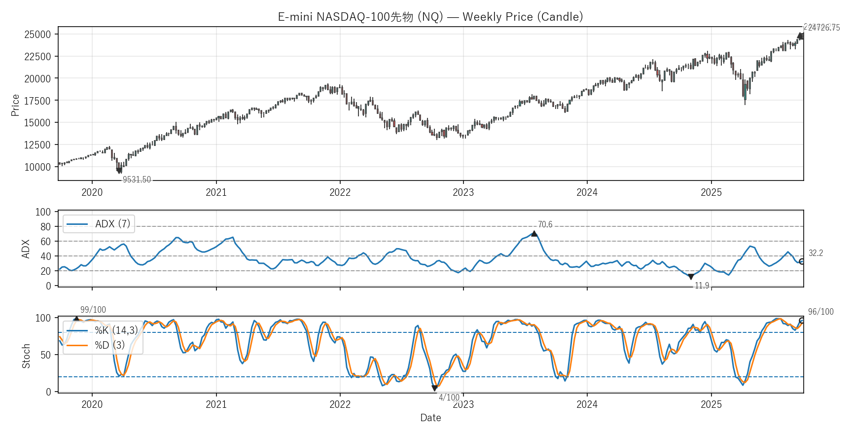 先週比(2025-09-26):週次リターン:+1.94%(終値 25509.25 → 26004.00) / ADX:+3.6pt(28 → 32)