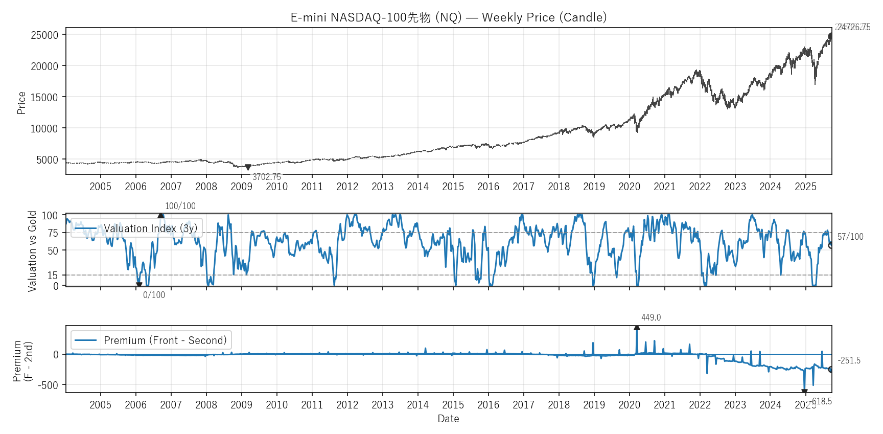 Valuation(WVI)は「基準資産と比べて相対的に高い/安いか」をみる指標。通常は金(GC)、金自身は米30年債(ZB)と比較。価格比(対象/参照×100)を短期/長期EMAで平滑化→差(PAL)の過去位置を0〜100で表示。PremiumはFront−Second(順鞘/逆鞘)。