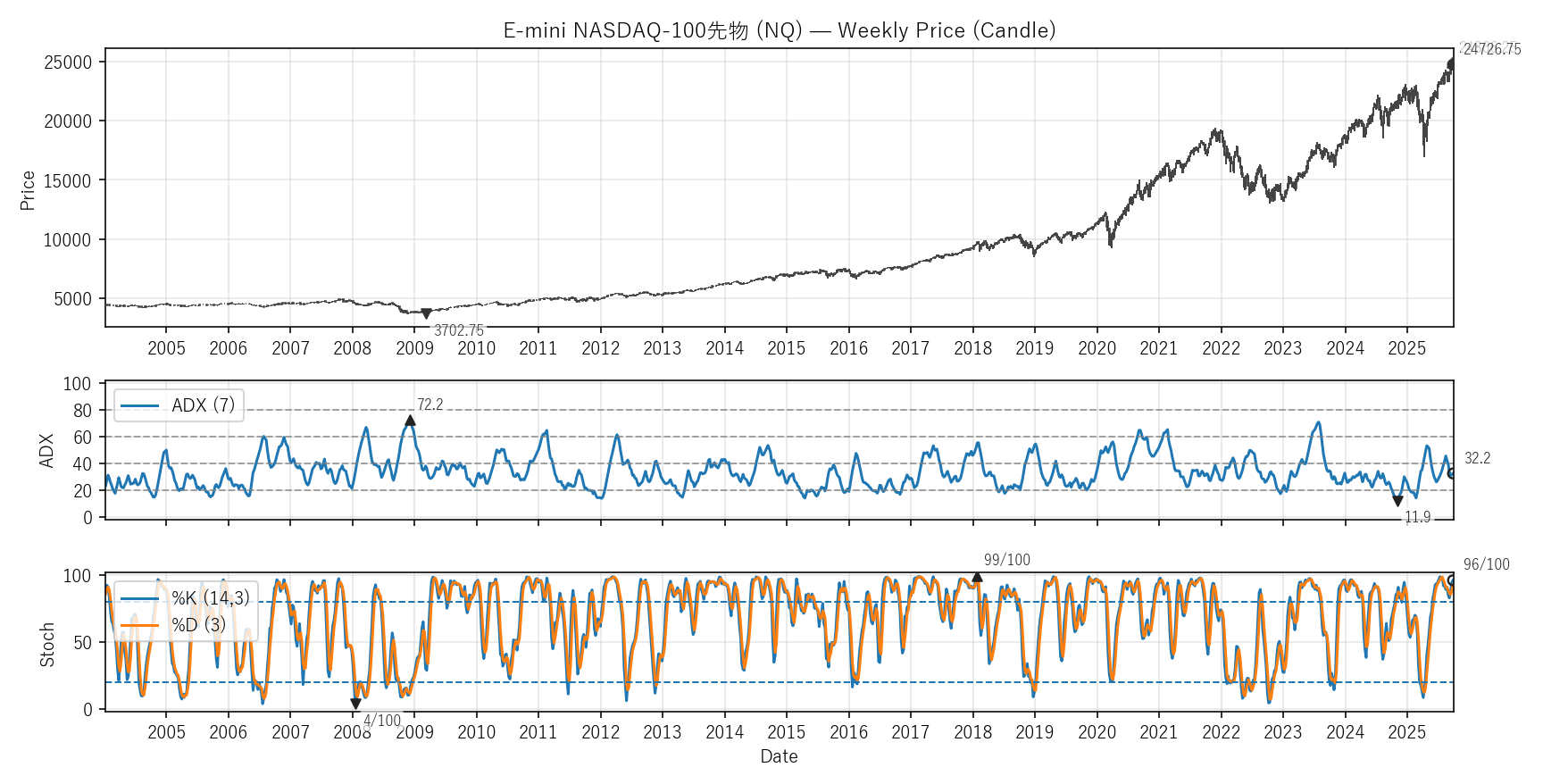 テクニカルは勢い(ADX)と位置(Stoch %K)。ADXは20超=発生、40超=強め。Stochは0〜100で80以上/20以下が目安。