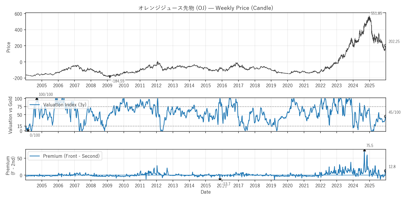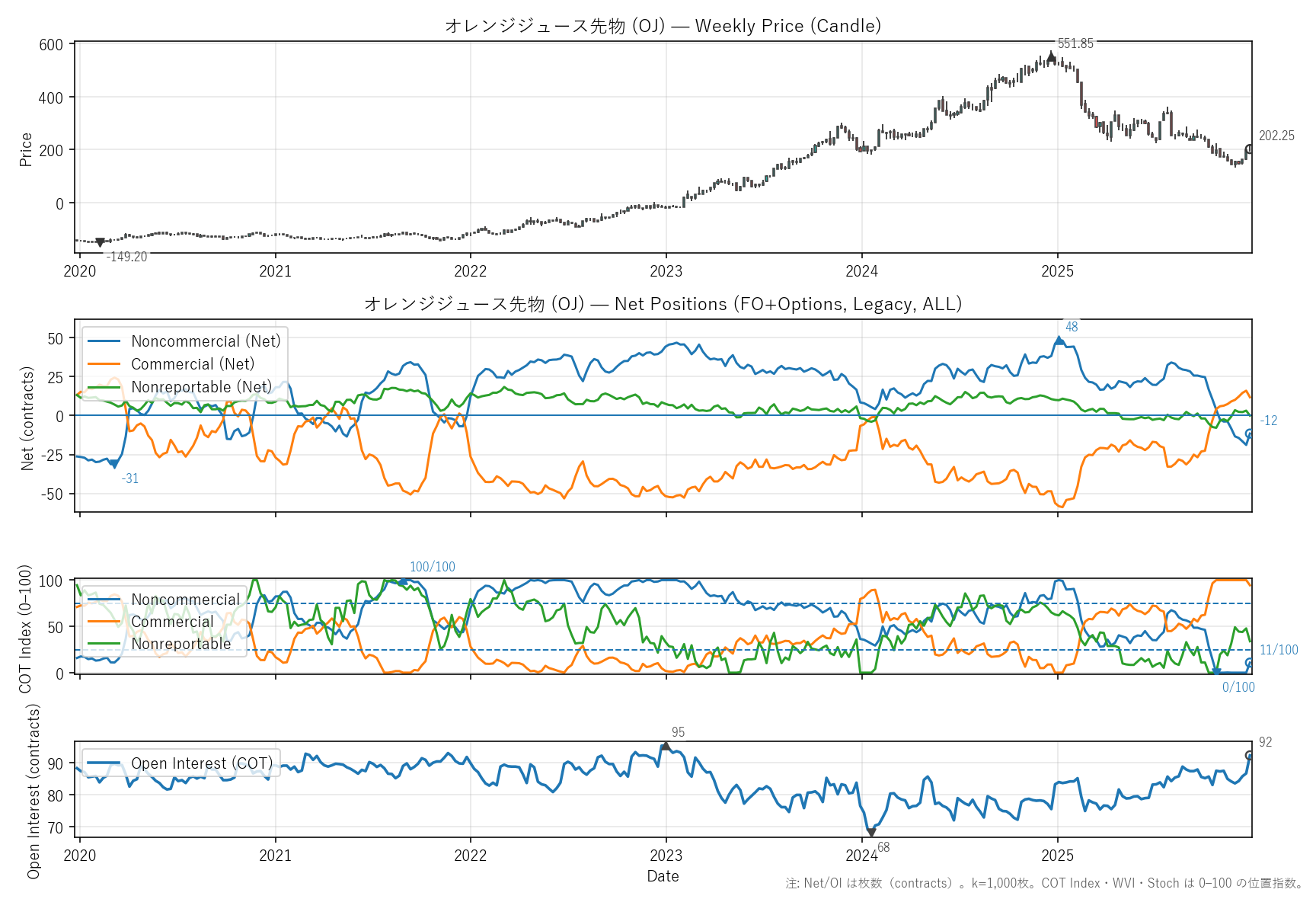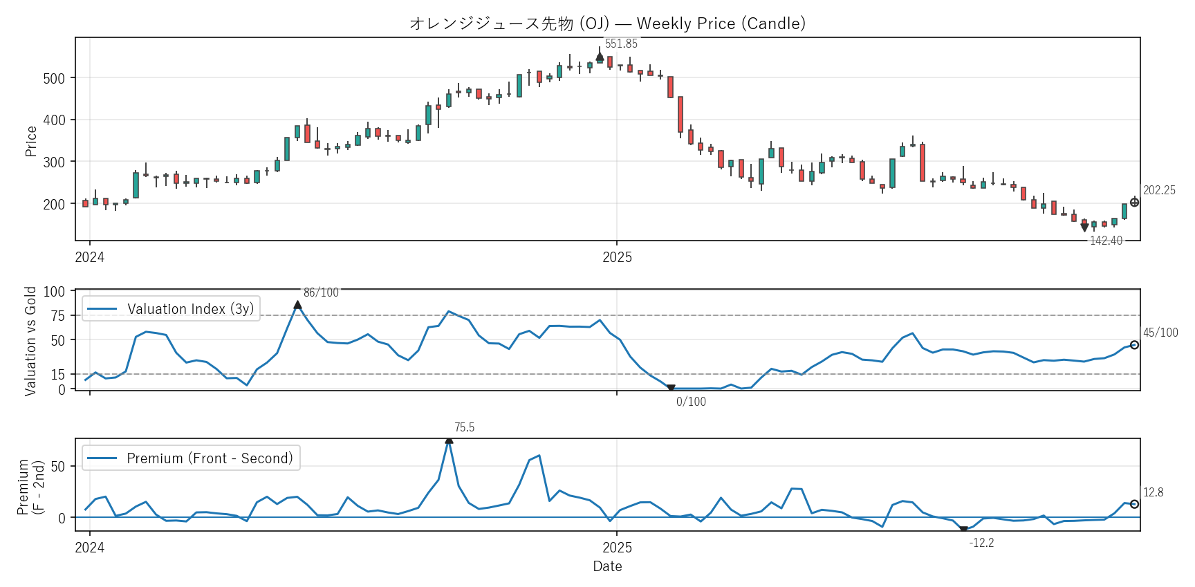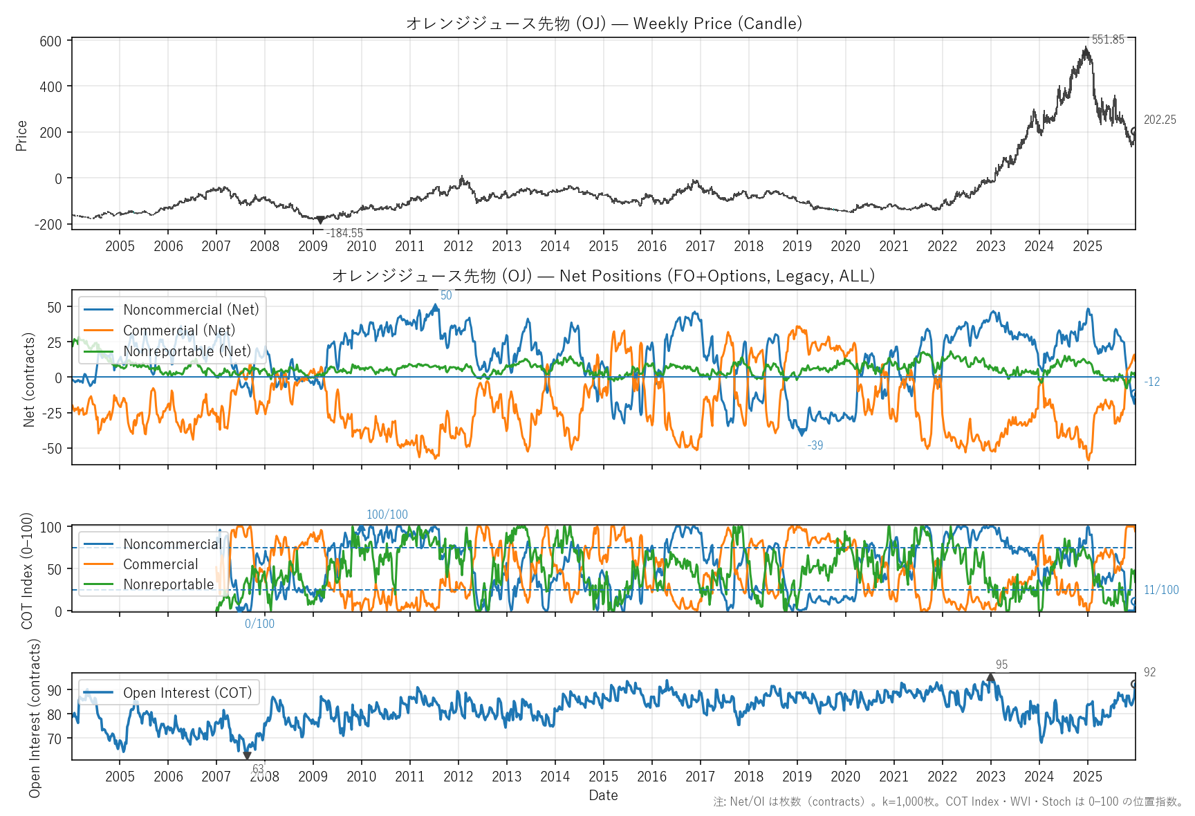 オレンジジュース先物(OJ)COTレポート・バリュエーション・テクニカル【週足】