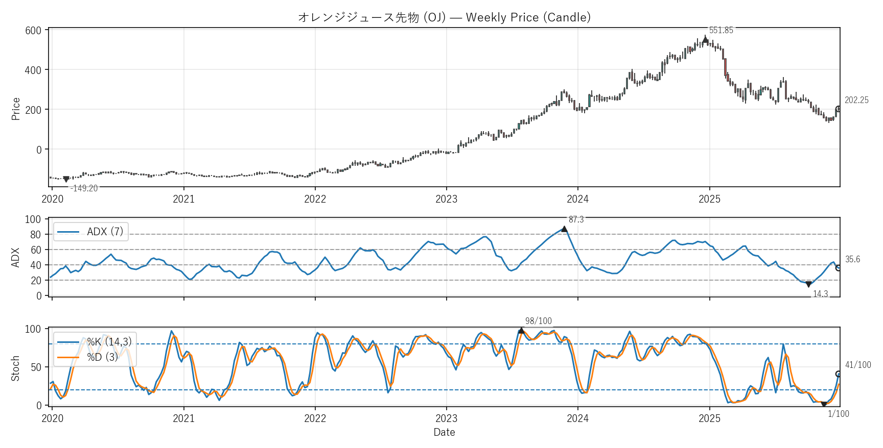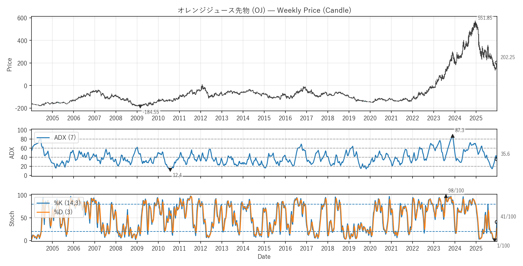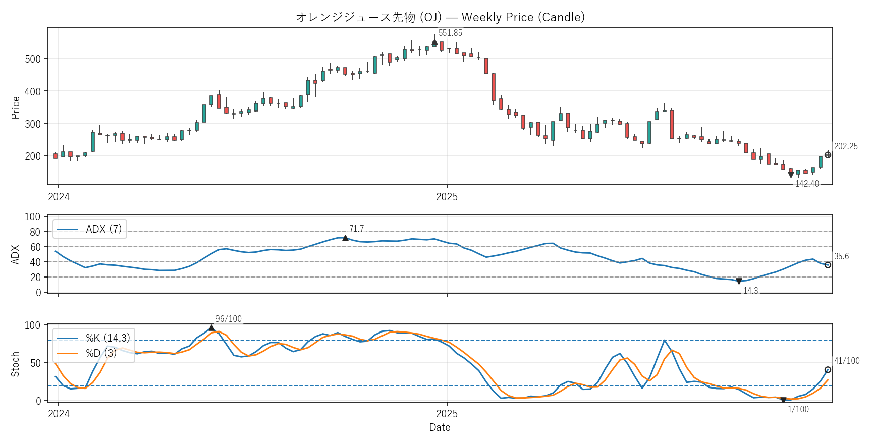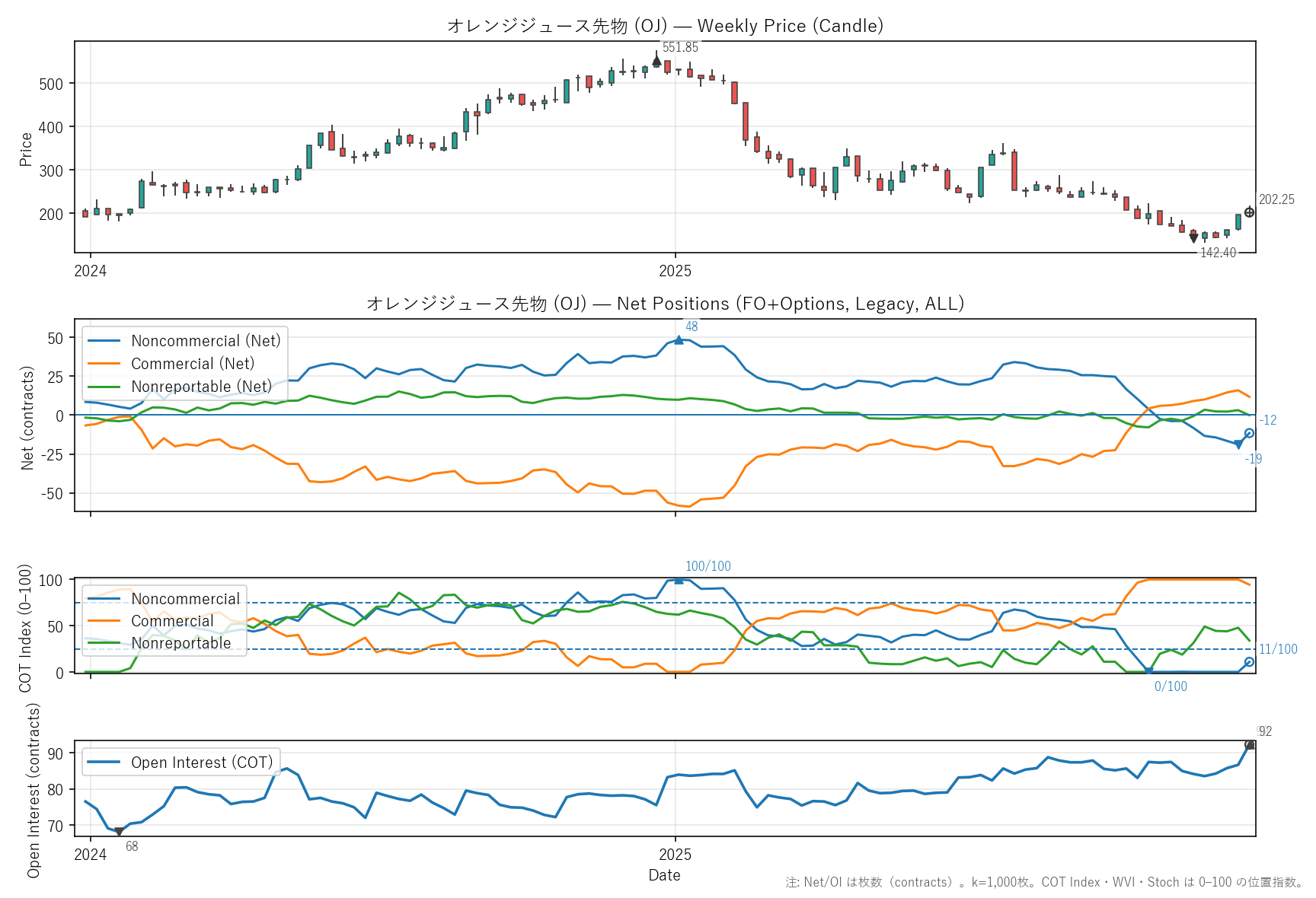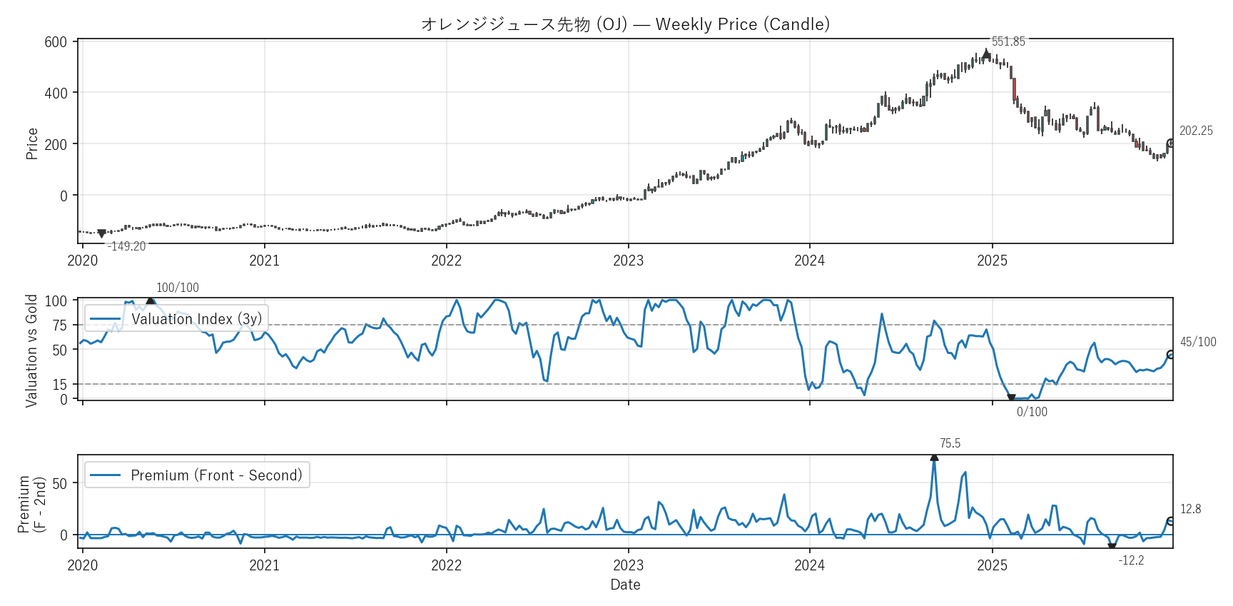オレンジジュース先物(OJ)COTレポート・バリュエーション・テクニカル【週足】