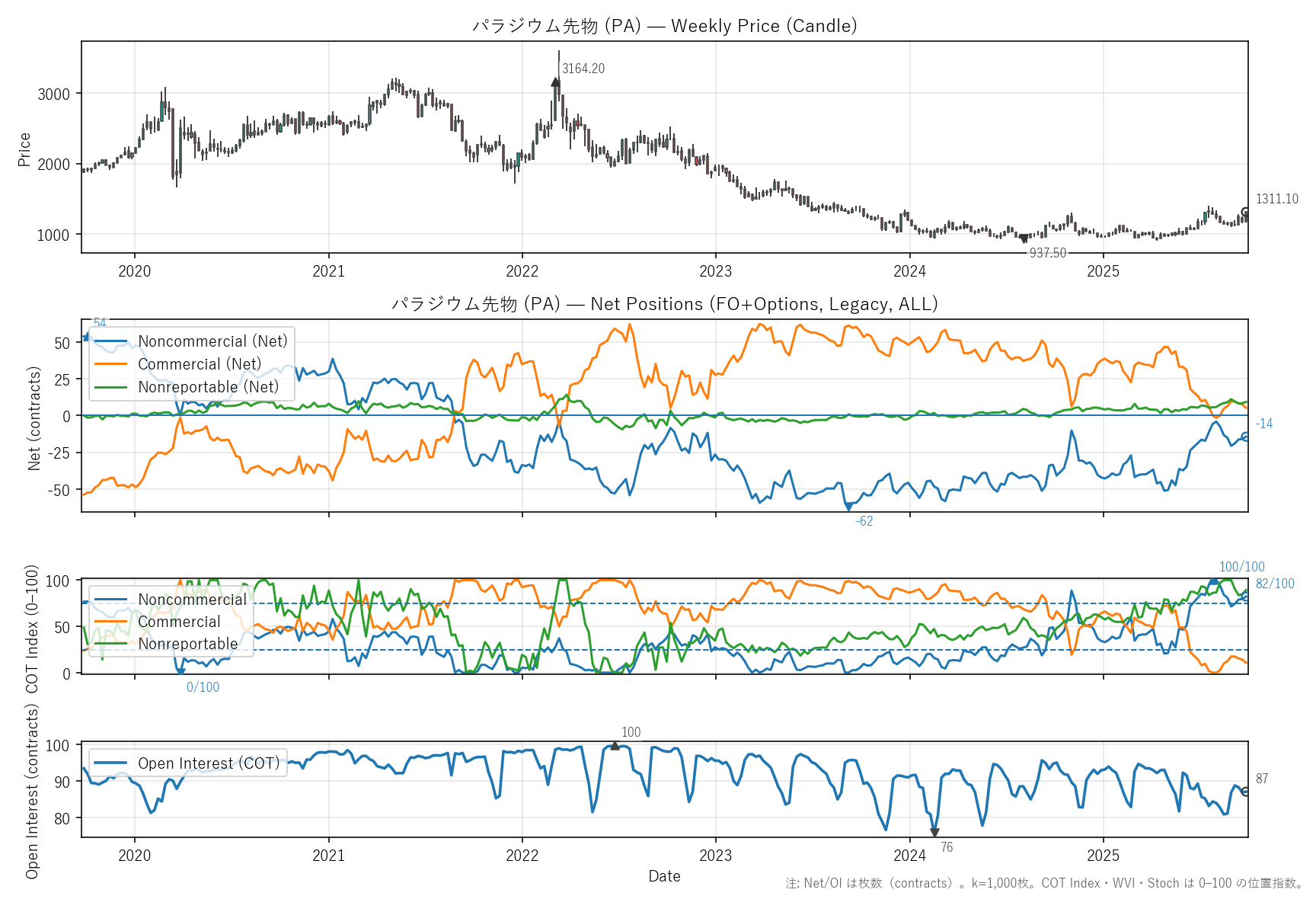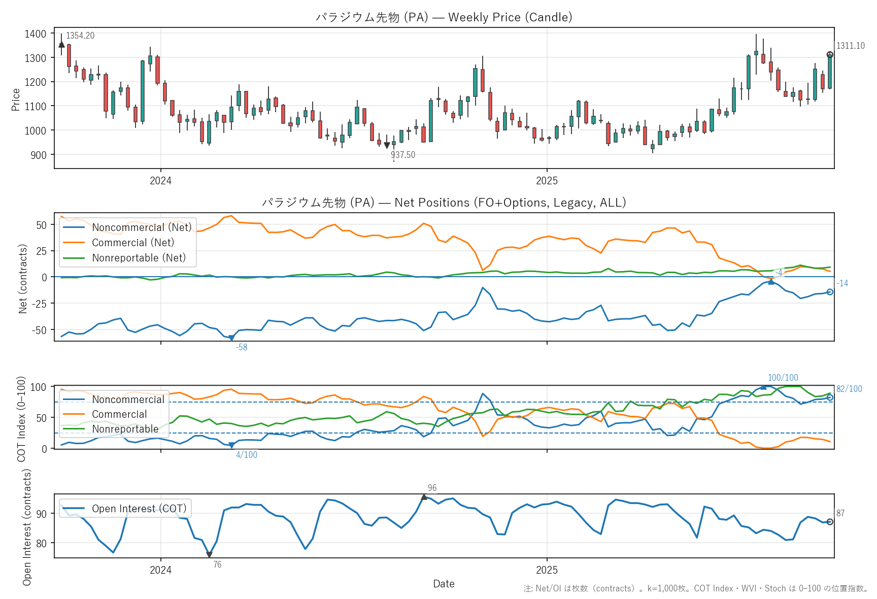 先週比(2025-09-26):非商業COT指数:+2pt(-16 → -14) / 商業COT指数:-2pt(8 → 5) / NR COT指数:+1pt(8 → 9) / Open Interest:+0.23%(87 → 87)