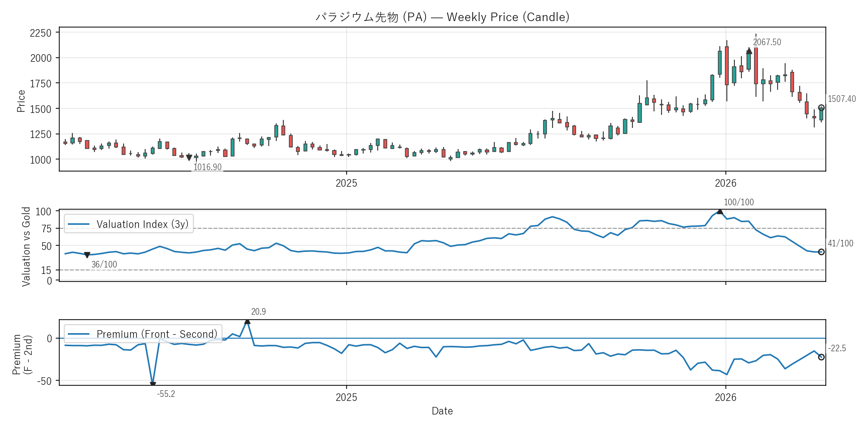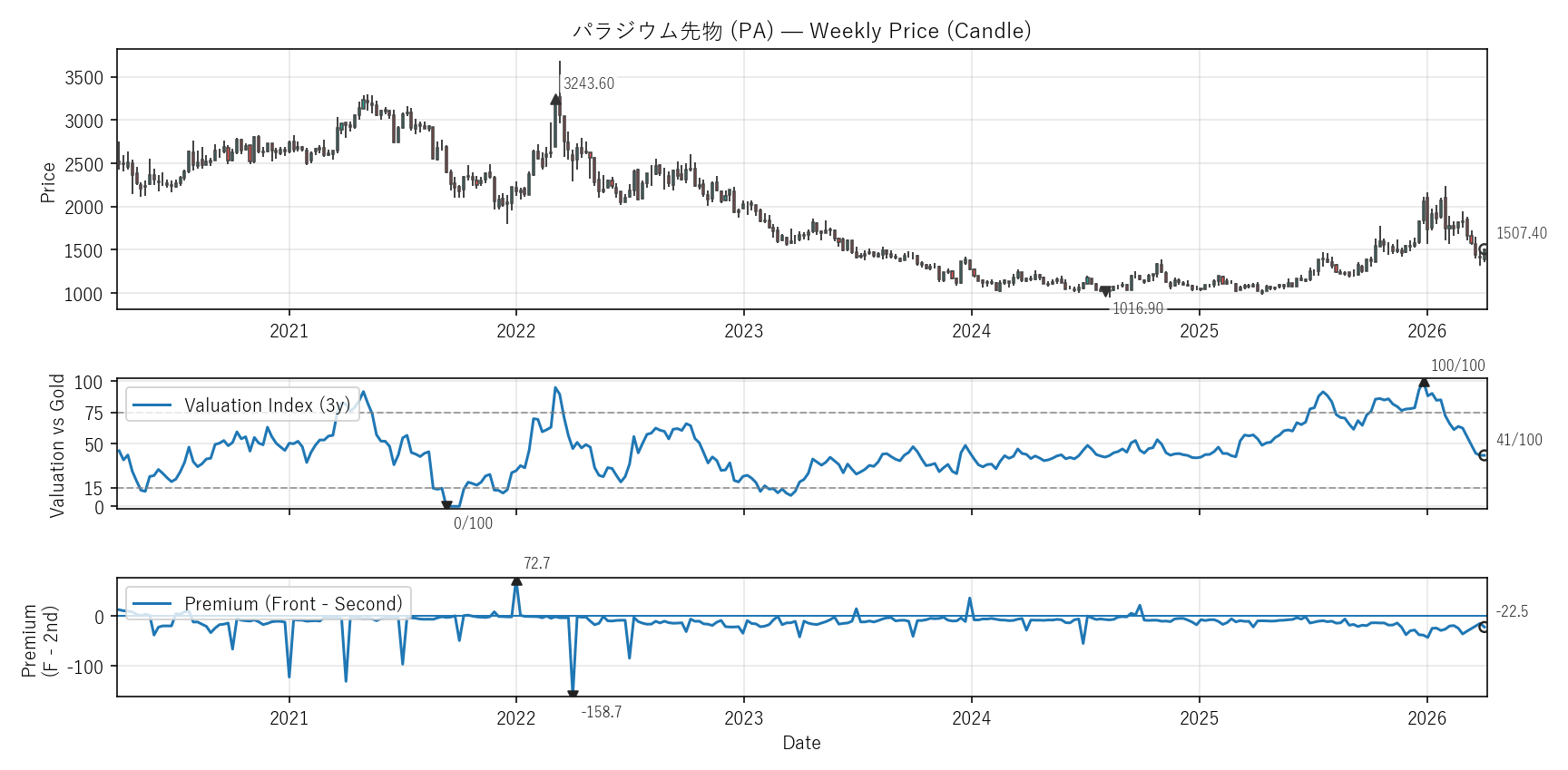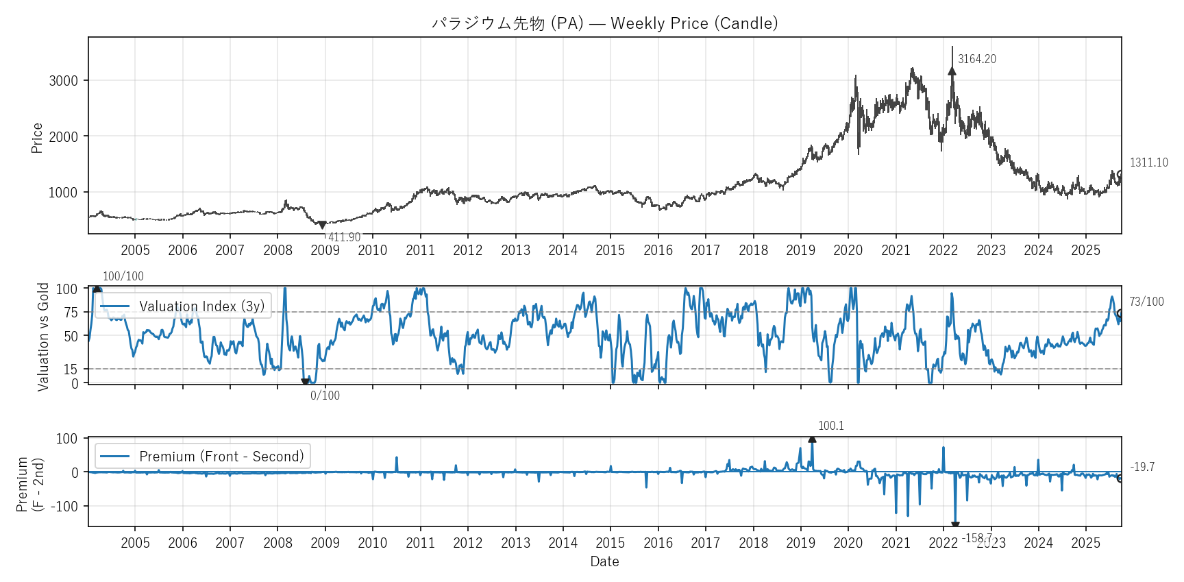 Valuation(WVI)は「基準資産と比べて相対的に高い/安いか」をみる指標。通常は金(GC)、金自身は米30年債(ZB)と比較。価格比(対象/参照×100)を短期/長期EMAで平滑化→差(PAL)の過去位置を0〜100で表示。PremiumはFront−Second(順鞘/逆鞘)。