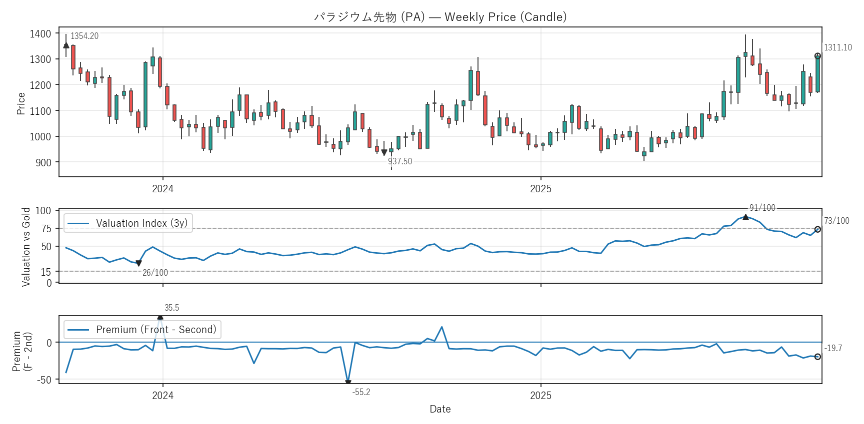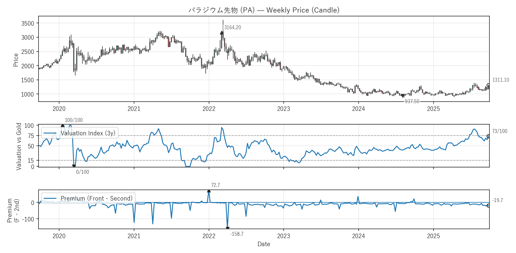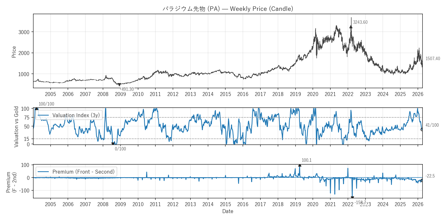 Valuation(WVI)は「基準資産と比べて相対的に高い/安いか」をみる指標。通常は金(GC)、金自身は米30年債(ZB)と比較。価格比(対象/参照×100)を短期/長期EMAで平滑化→差(PAL)の過去位置を0〜100で表示。PremiumはFront−Second(順鞘/逆鞘)。