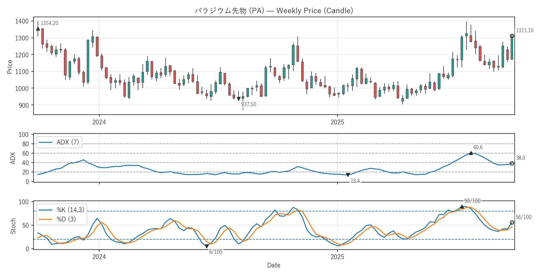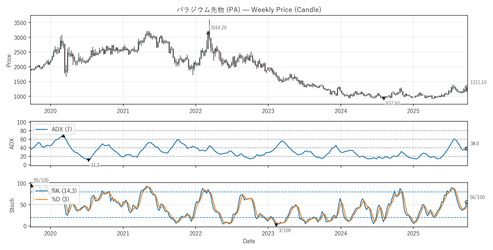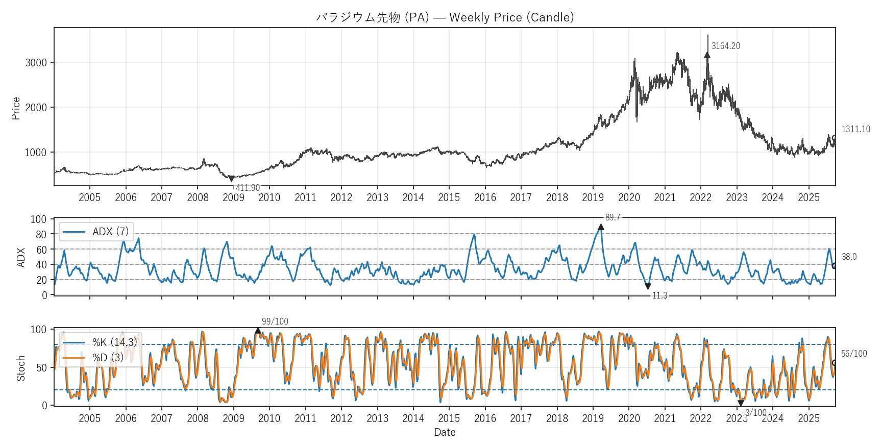 テクニカルは勢い(ADX)と位置(Stoch %K)。ADXは20超=発生、40超=強め。Stochは0〜100で80以上/20以下が目安。