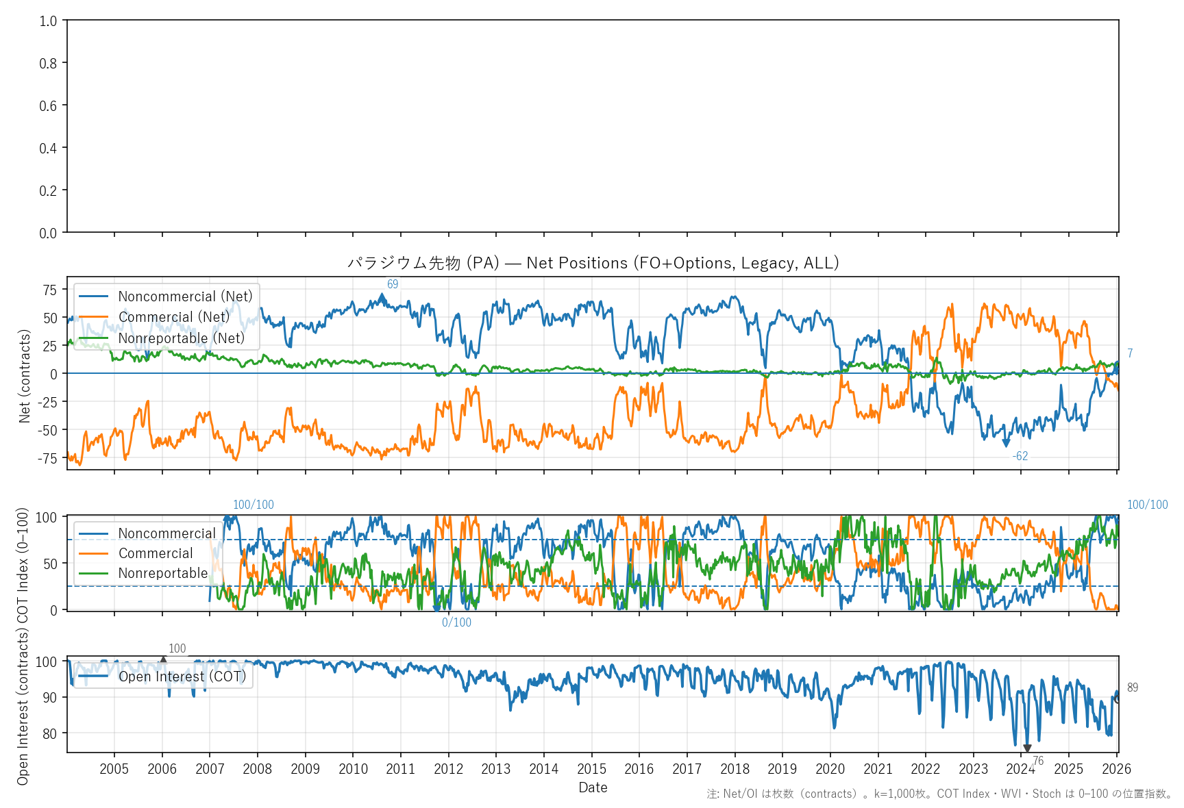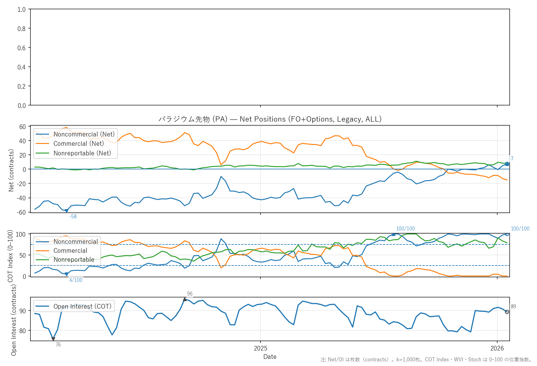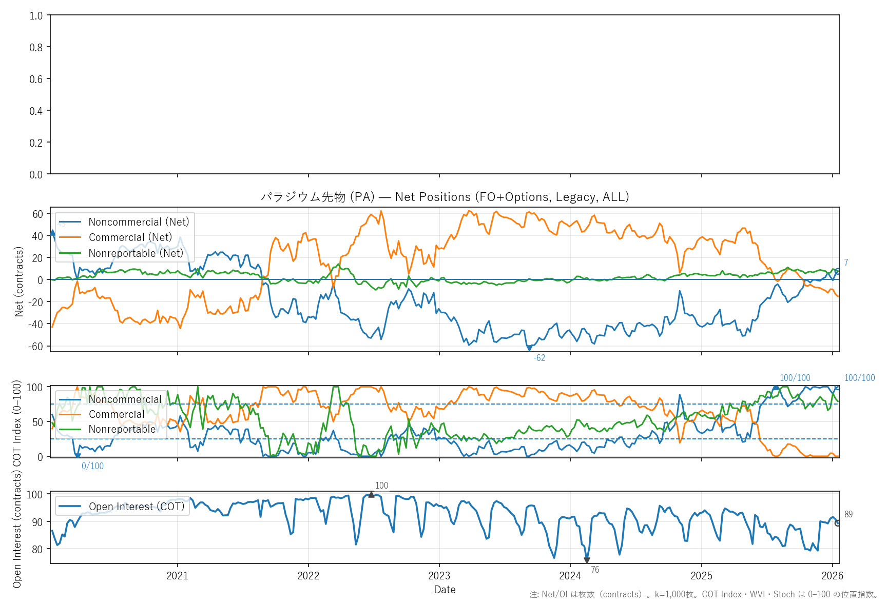先週比(2026-01-16):非商業COT指数:+3pt(5 → 7) / 商業COT指数:-2pt(-13 → -15) / NR COT指数:-1pt(8 → 8) / Open Interest:-1.65%(91 → 89)