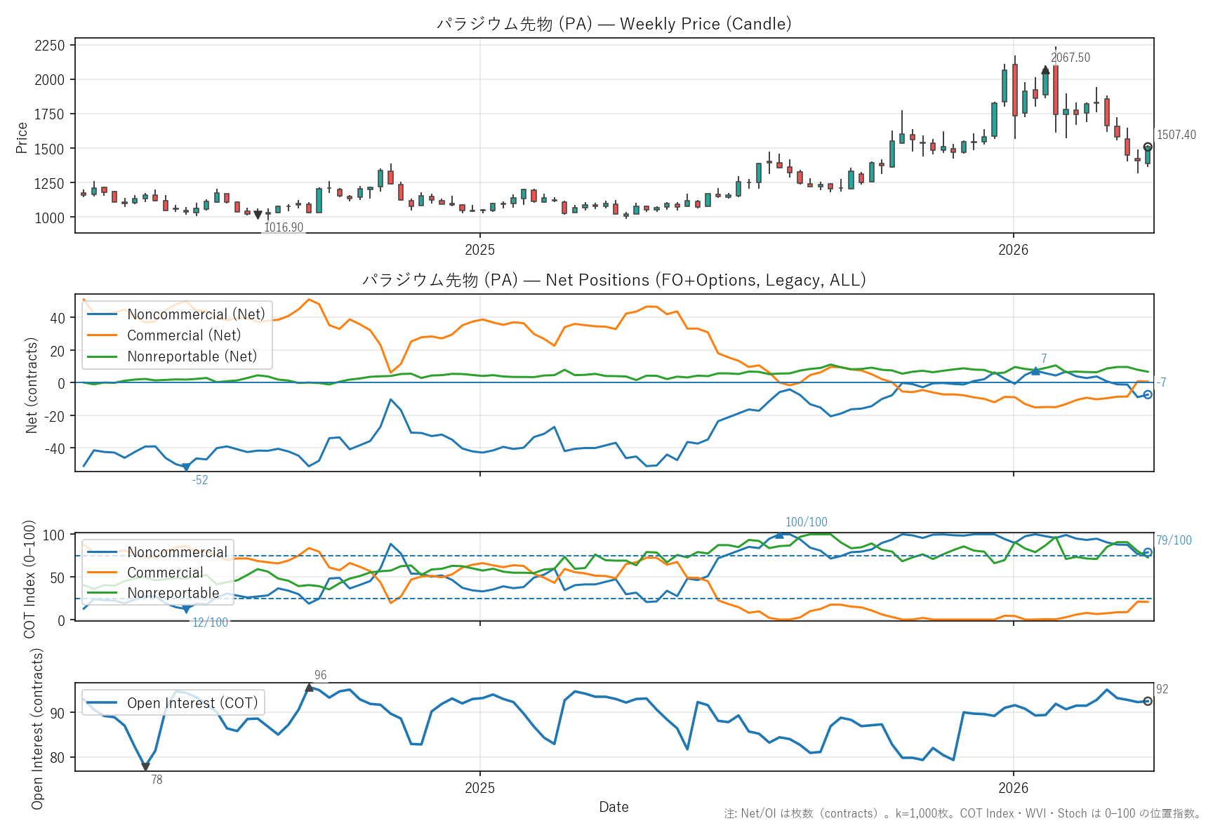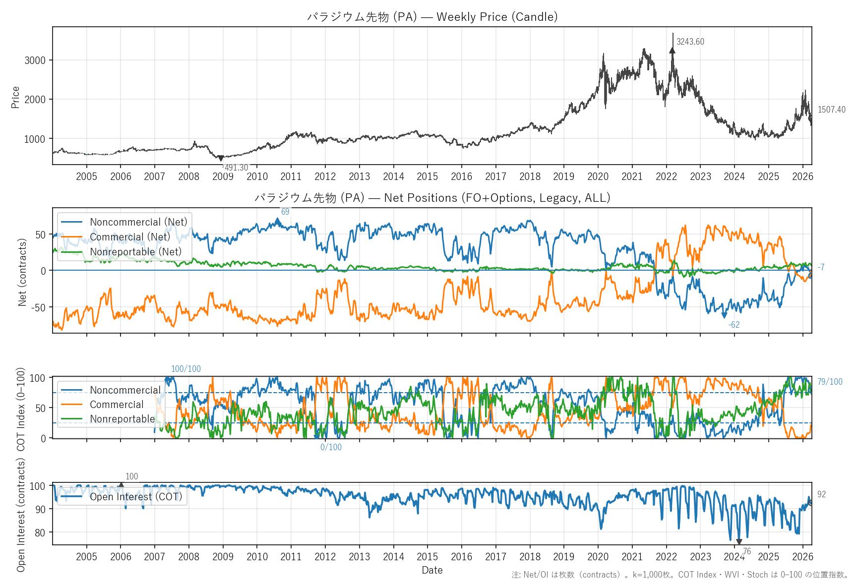 非商業COT指数:79(12〜100)|位置 76/100 / 商業COT指数:21(0〜88)|位置 24/100 / NR COT指数:73(35〜100)|位置 58/100