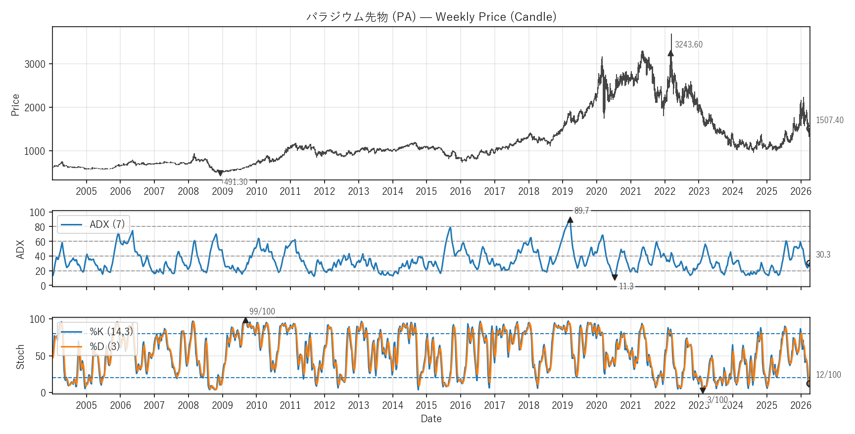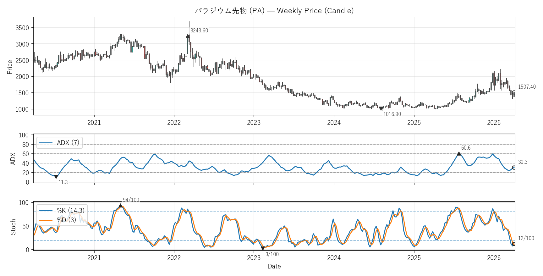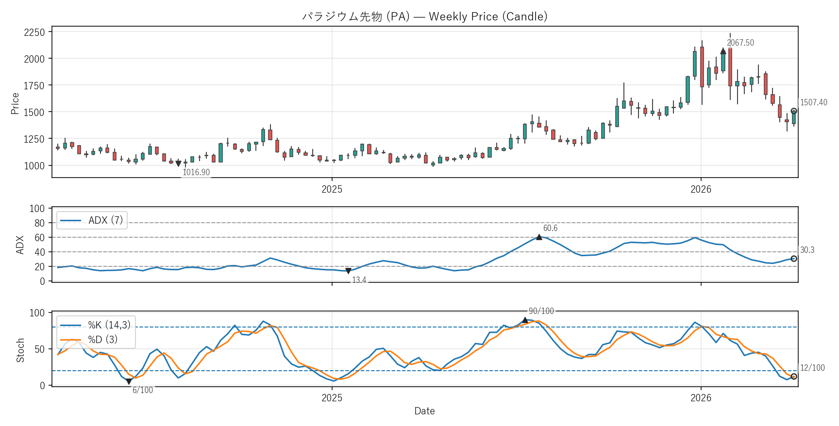 ADX:30.3(13.4〜60.6)|位置 36/100 / Stoch %K:12(6〜90)|位置 8/100