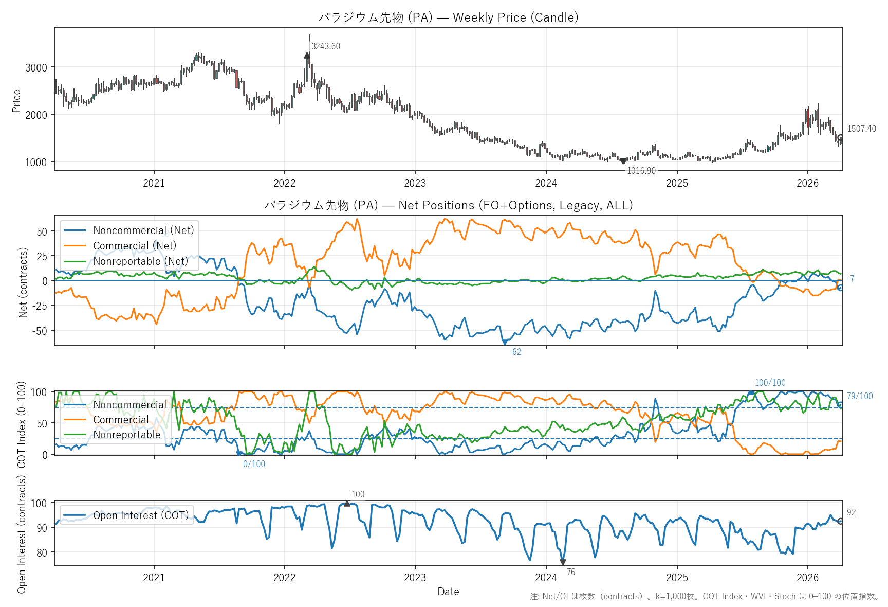 先週比(2026-04-03):非商業COT指数:+2pt(-9 → -7) / 商業COT指数:-0pt(1 → 1) / NR COT指数:-1pt(8 → 7) / Open Interest:+0.22%(92 → 92)