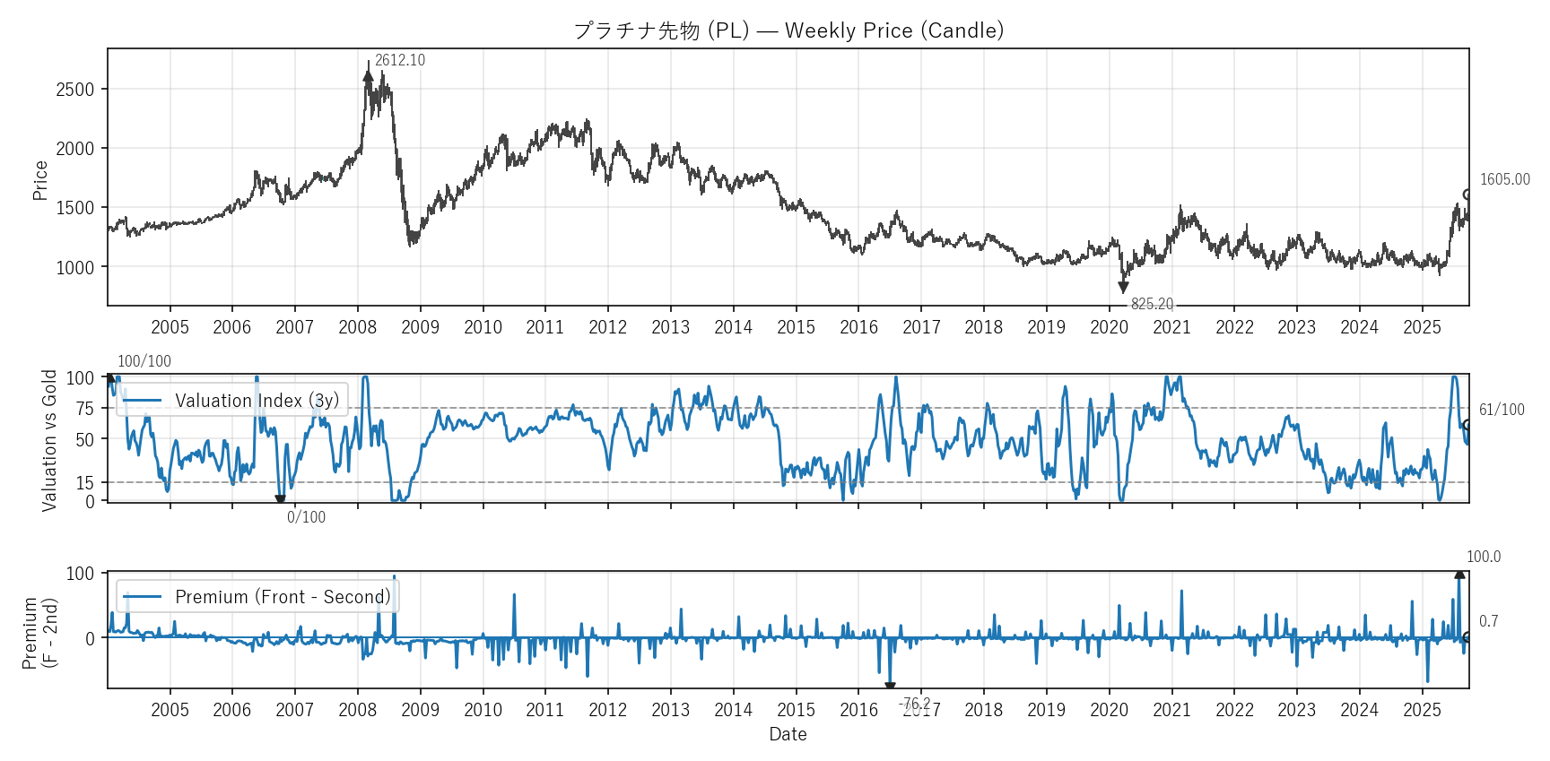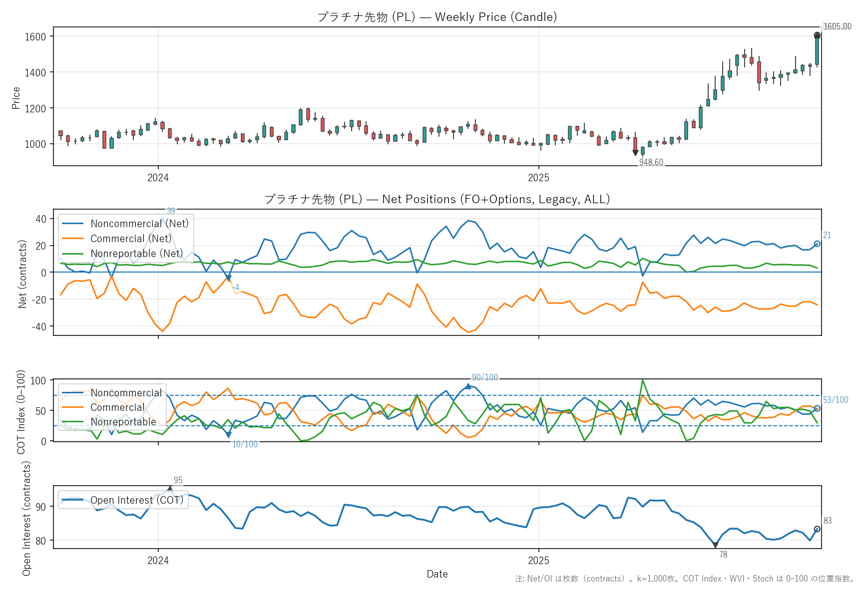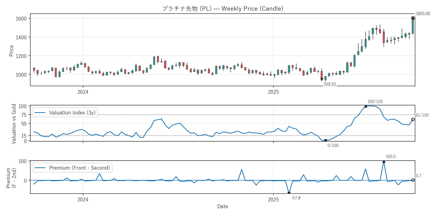 プラチナ先物(PL)COTレポート・バリュエーション・テクニカル【週足】