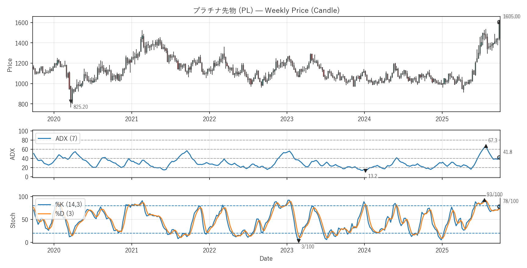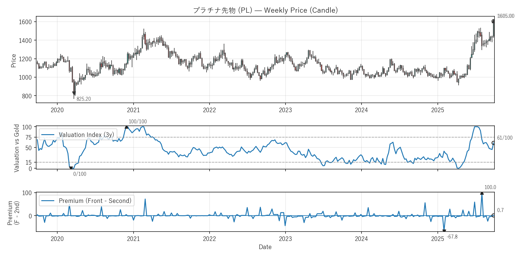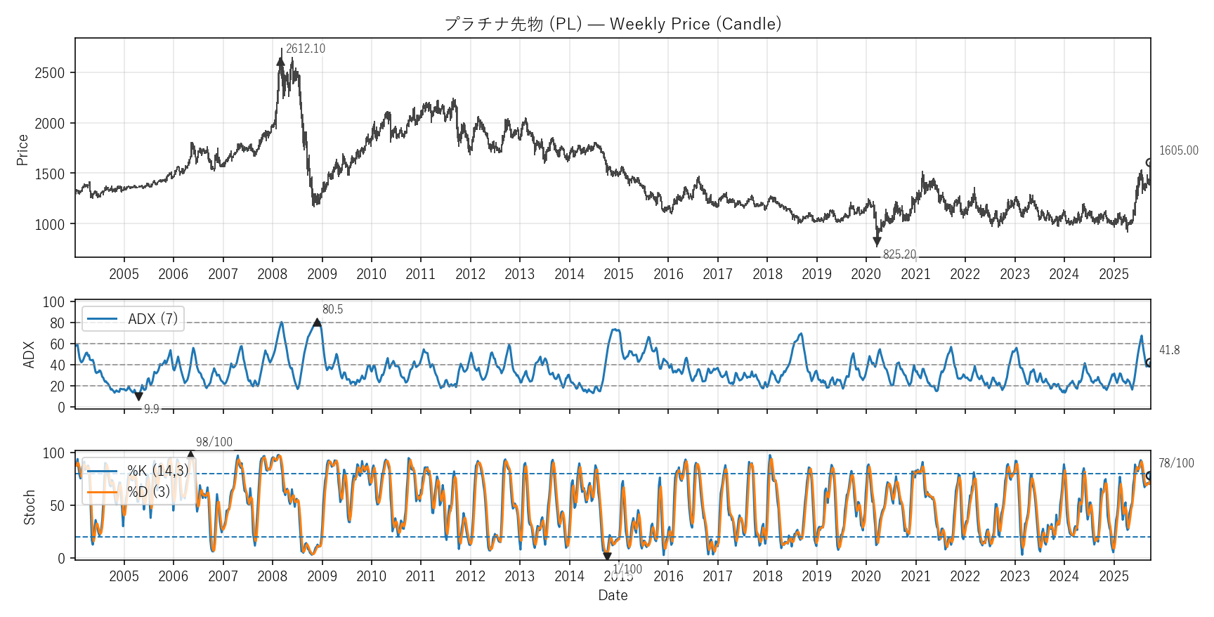 プラチナ先物(PL)COTレポート・バリュエーション・テクニカル【週足】