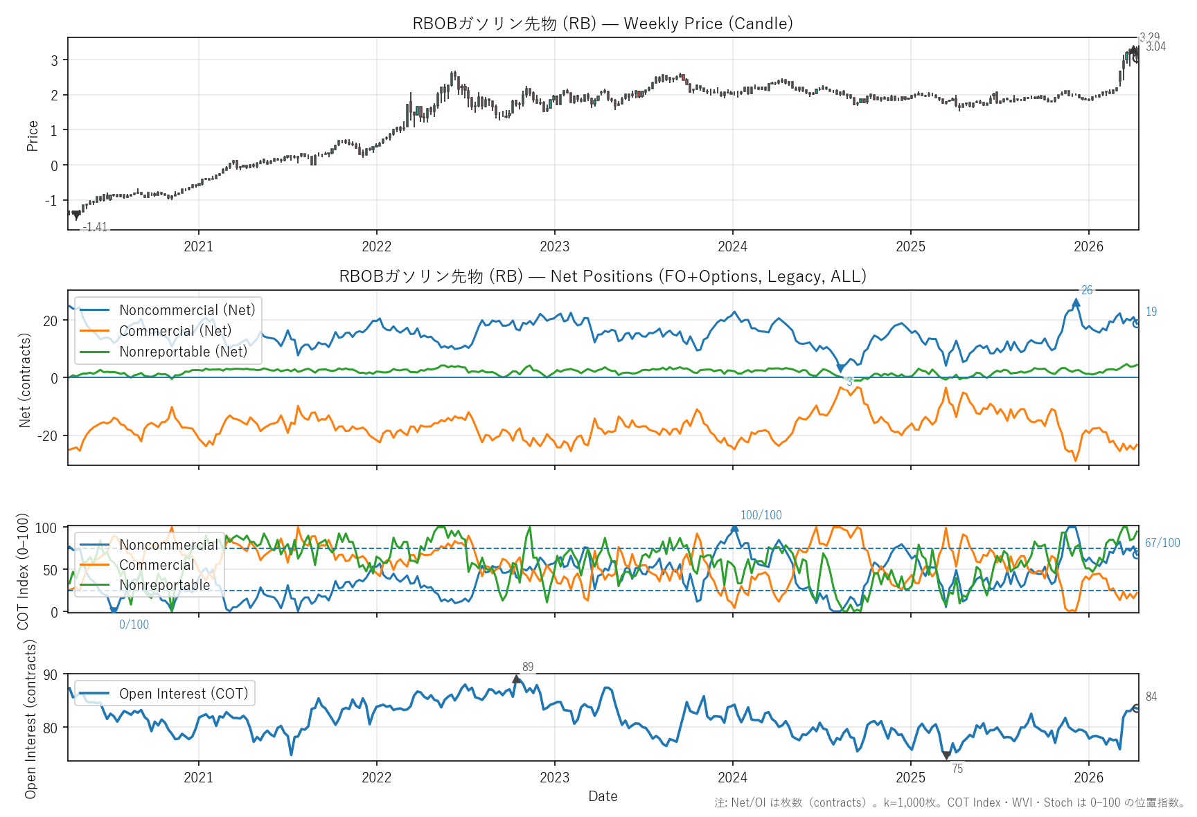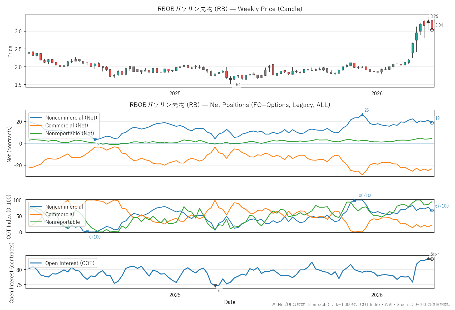 先週比(2026-04-10):非商業COT指数:-2pt(21 → 19) / 商業COT指数:+2pt(-25 → -23) / NR COT指数:+1pt(4 → 4) / Open Interest:-0.24%(84 → 84)