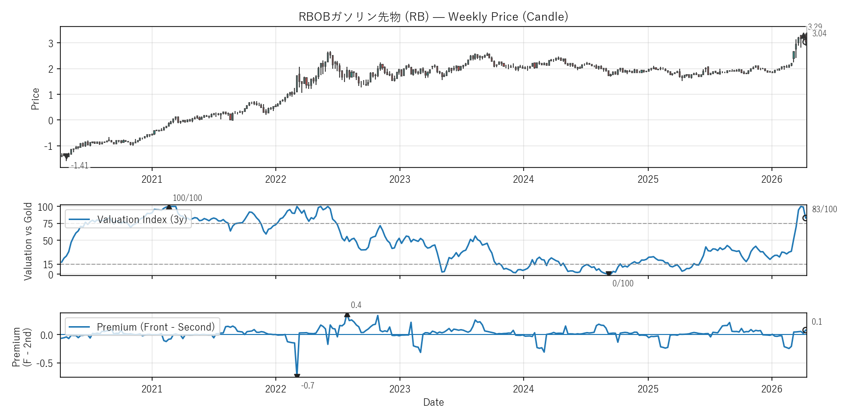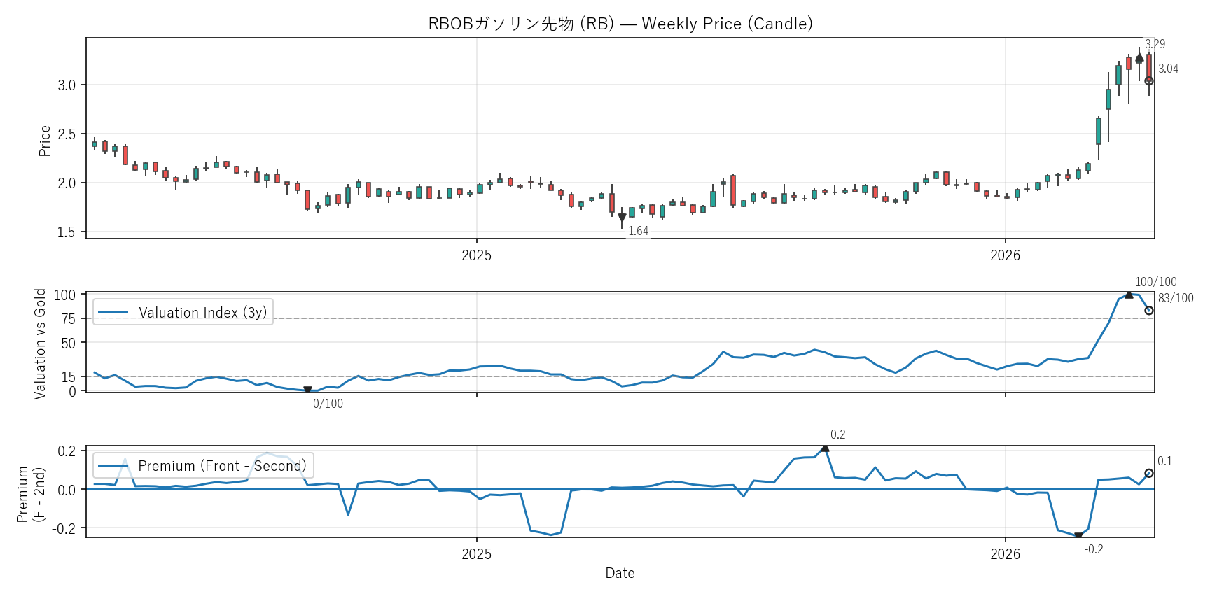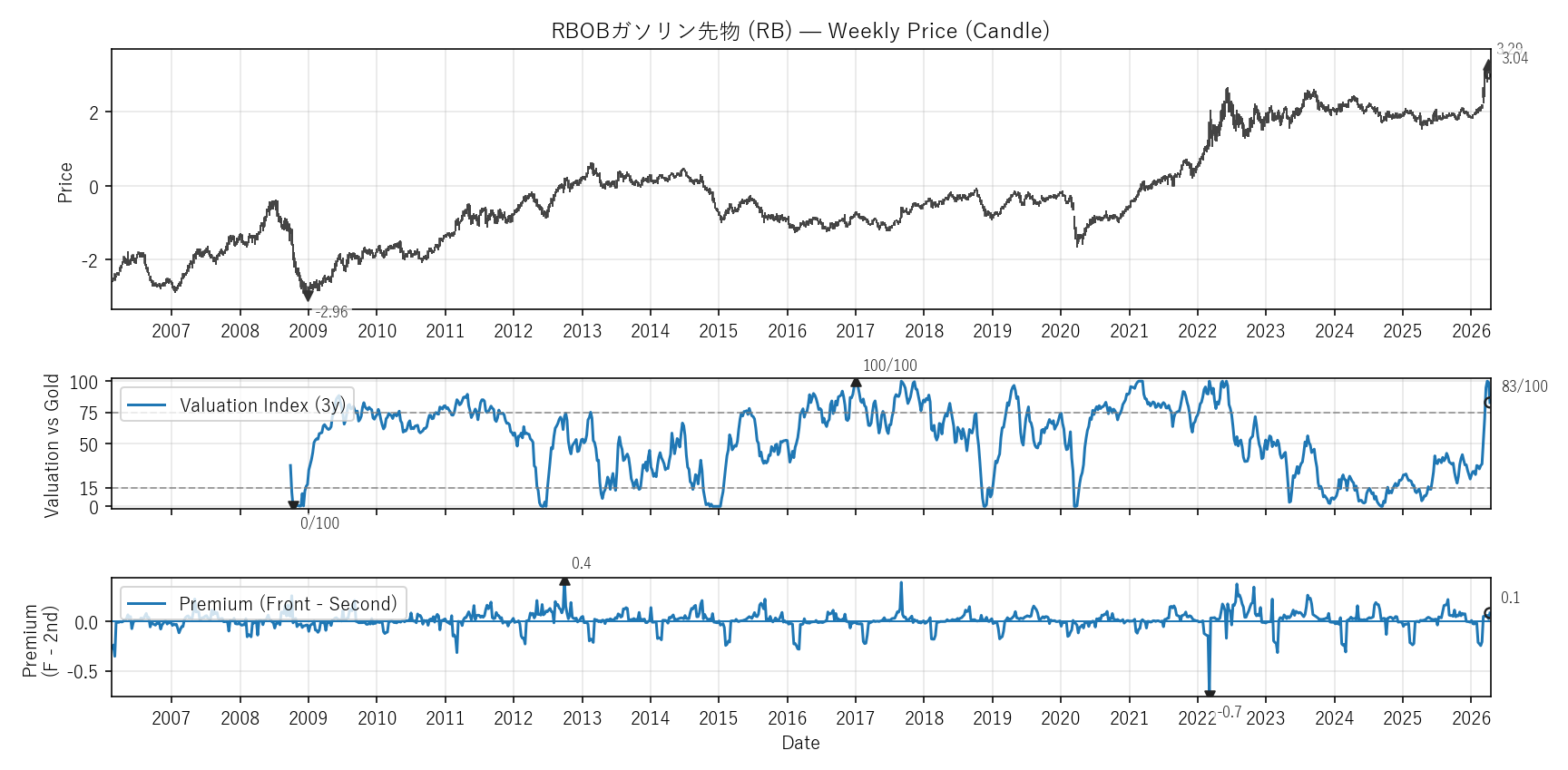 Valuation(WVI)は「基準資産と比べて相対的に高い/安いか」をみる指標。通常は金(GC)、金自身は米30年債(ZB)と比較。価格比(対象/参照×100)を短期/長期EMAで平滑化→差(PAL)の過去位置を0〜100で表示。PremiumはFront−Second(順鞘/逆鞘)。