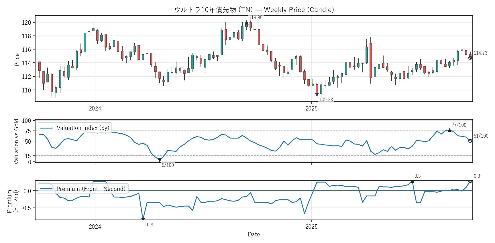 Valuation(WVI)は「基準資産と比べて相対的に高い/安いか」をみる指標。通常は金(GC)、金自身は米30年債(ZB)と比較。価格比(対象/参照×100)を短期/長期EMAで平滑化→差(PAL)の過去位置を0〜100で表示。PremiumはFront−Second(順鞘/逆鞘)。