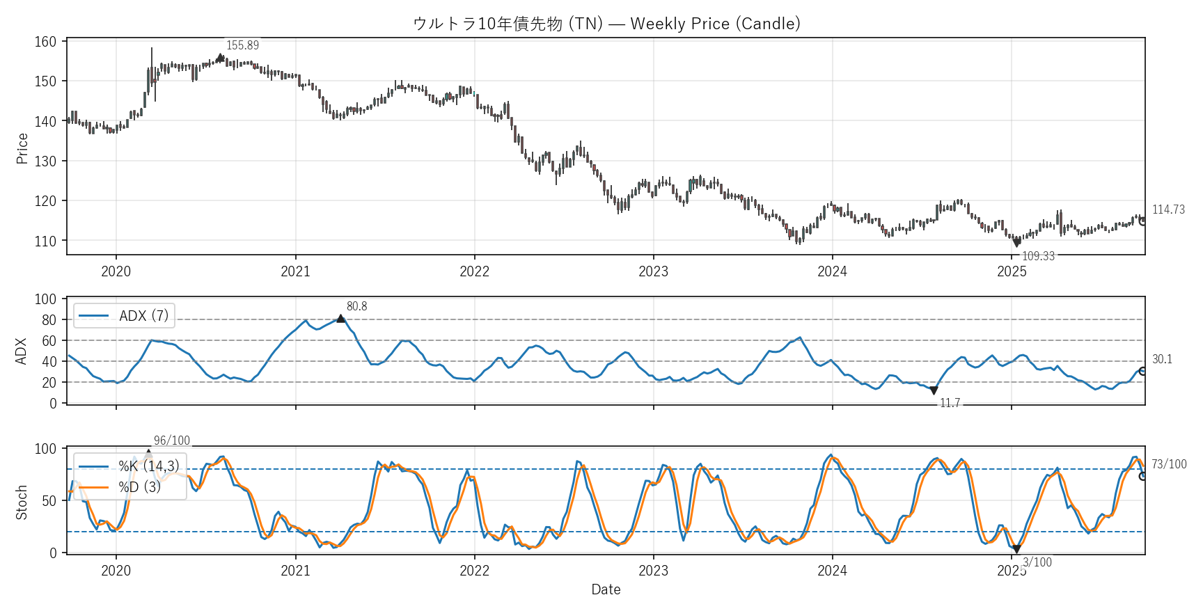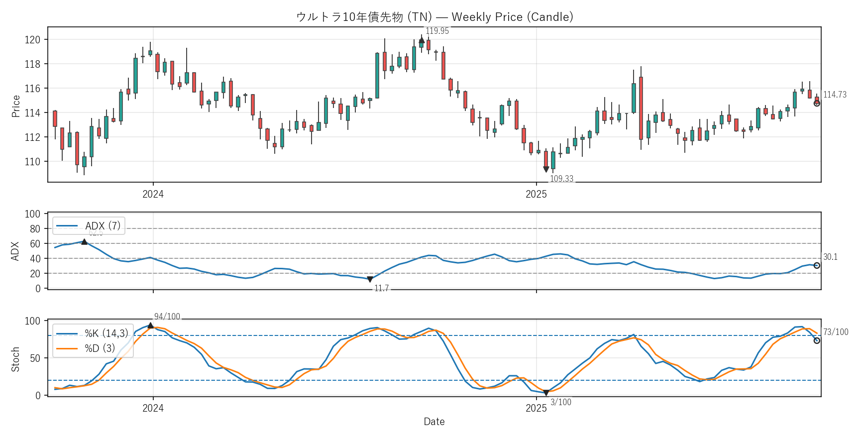 ADX:30.1(11.7〜84.2)|位置 25/100 / Stoch %K:73(3〜96)|位置 76/100