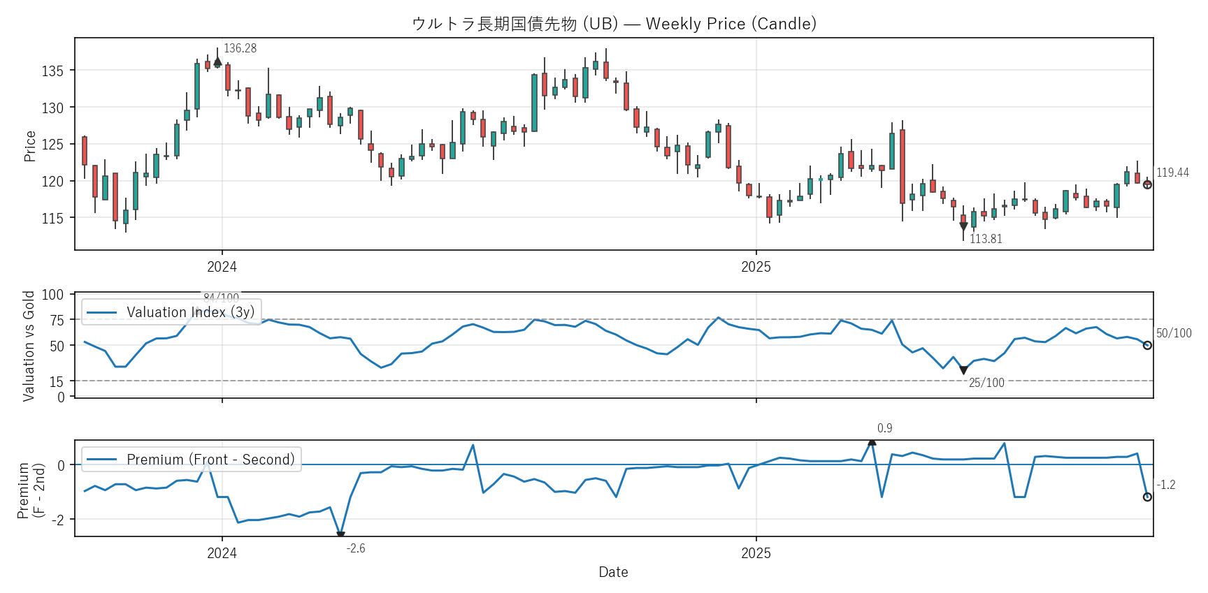Valuation(WVI)は「基準資産と比べて相対的に高い/安いか」をみる指標。通常は金(GC)、金自身は米30年債(ZB)と比較。価格比(対象/参照×100)を短期/長期EMAで平滑化→差(PAL)の過去位置を0〜100で表示。PremiumはFront−Second(順鞘/逆鞘)。